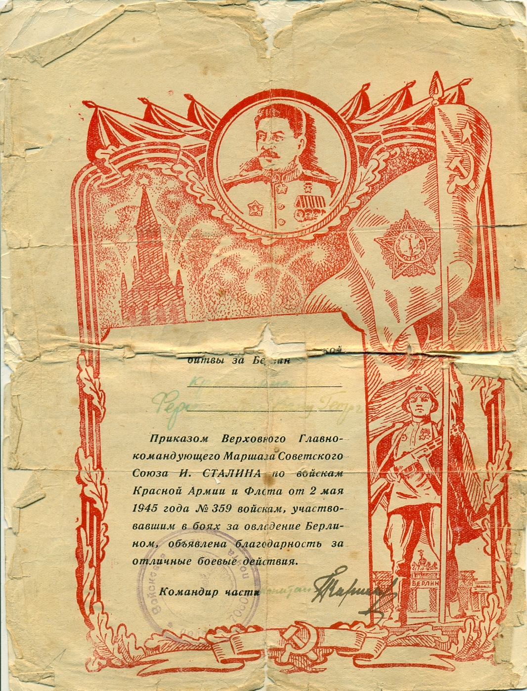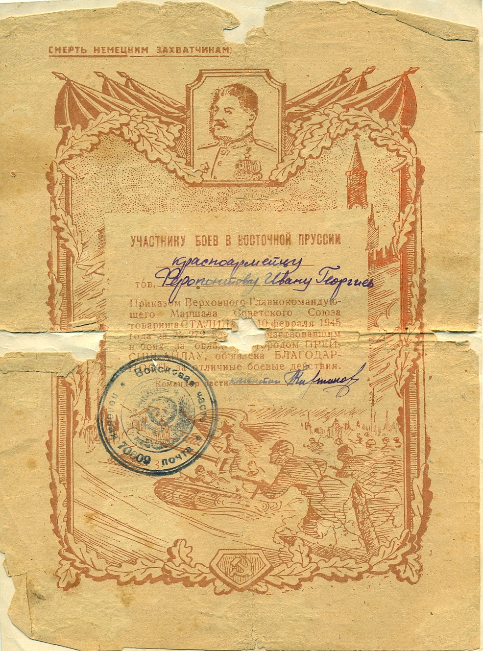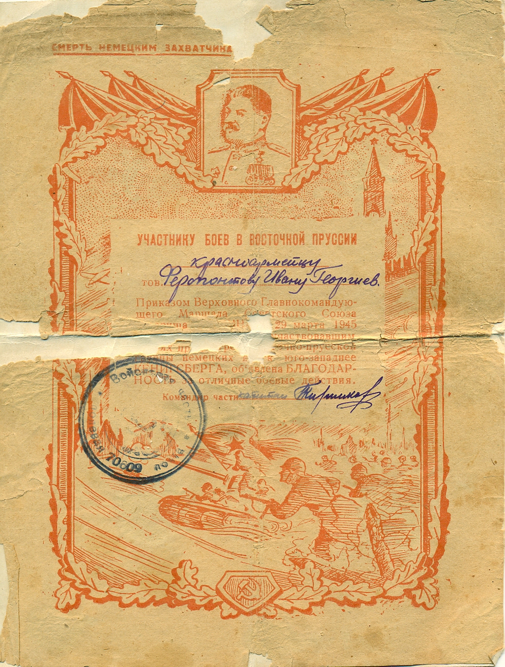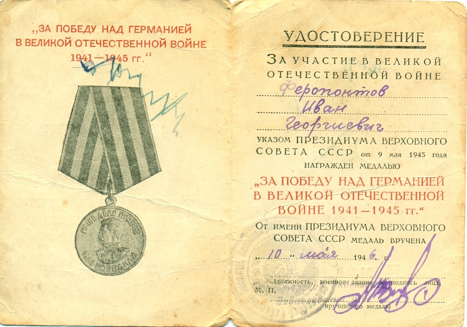 К ордену Славы III степени он был представлен приказом командира 128-го стрелкового корпуса от 2 сентября 1944 г., но в военной суматохе, а может быть из-за штабных бюрократов, награда не была вовремя вручена герою. Только спустя более полувека орден нашел своего хозяина. Но, к великому сожалению, И.Г. Ферапонтова уже не было в живых, и удостоверение решено было передать его внуку на вечное хранение.