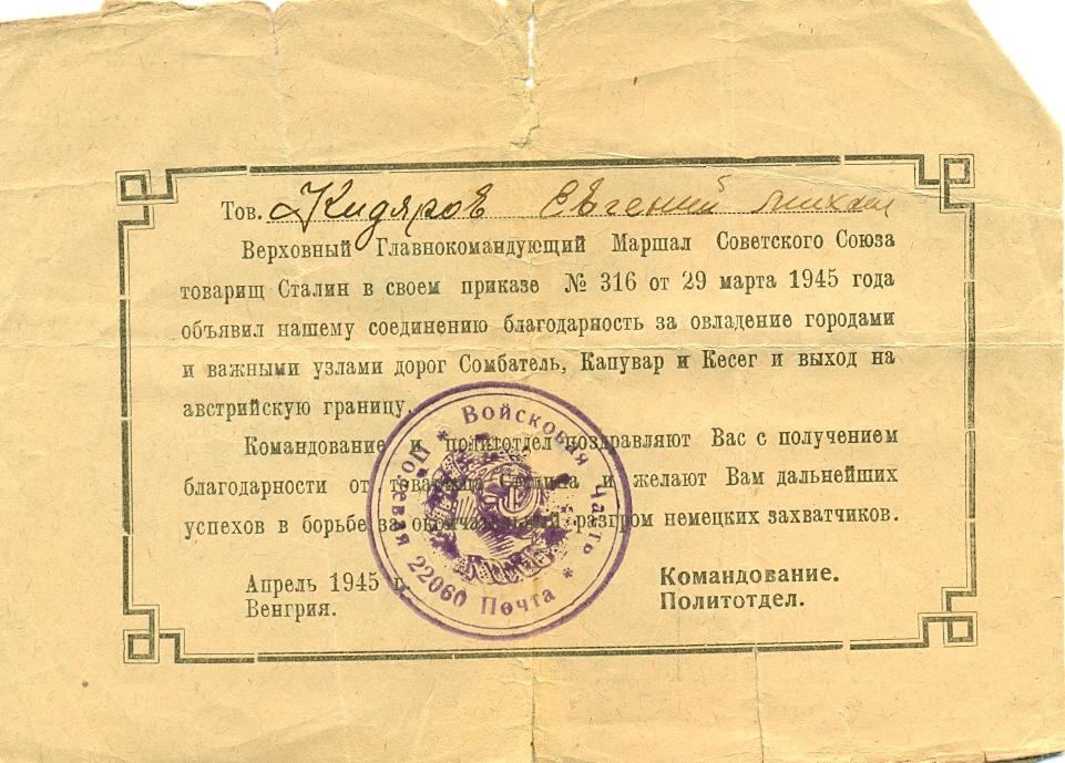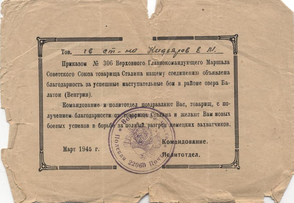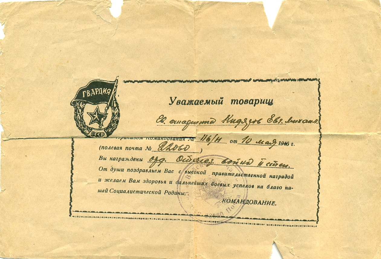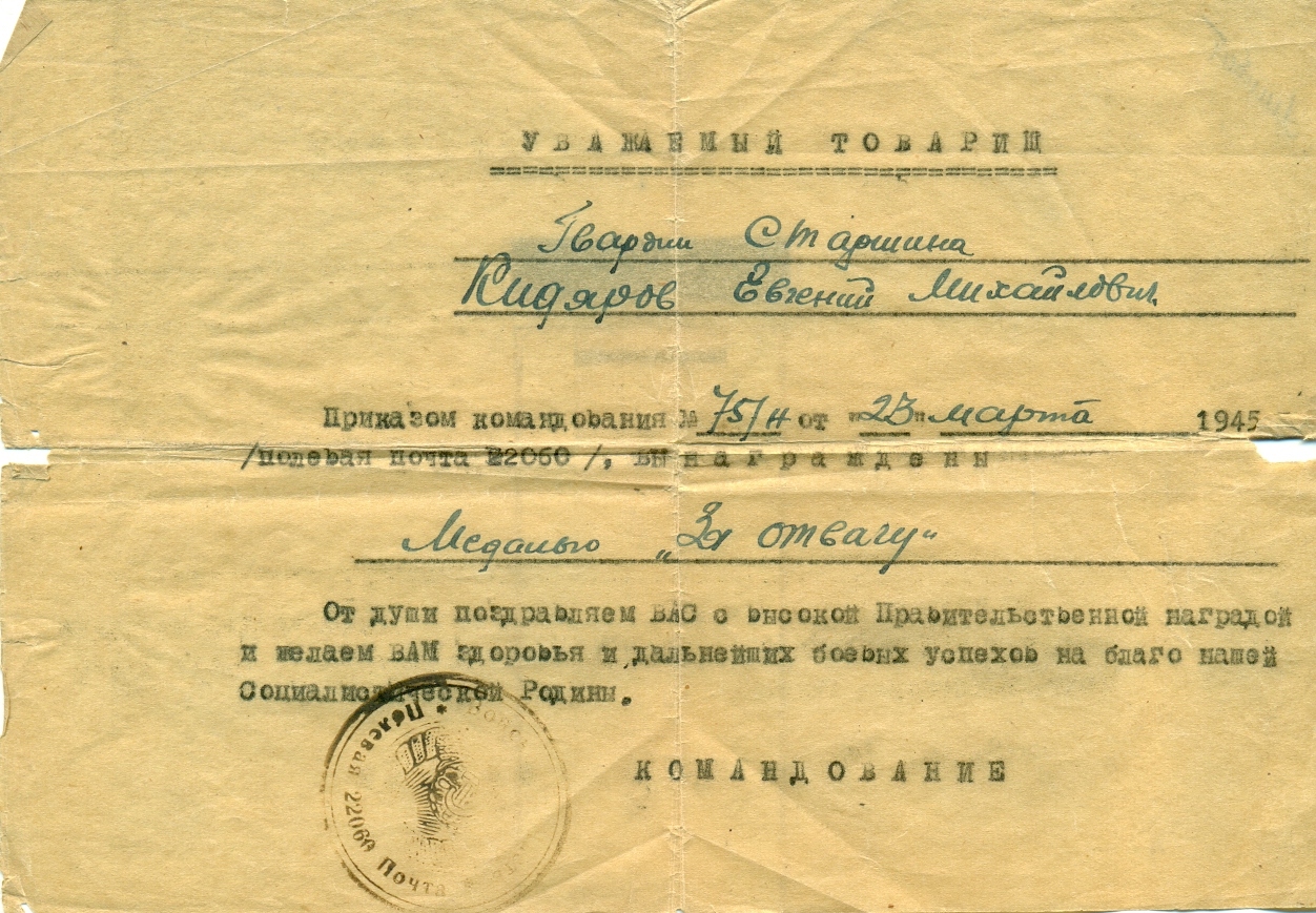 За время наступательных боев с немецкими захватчиками на территории Венгрии с 20 марта 1945 г. тов. Кидяров проявил исключительные способности и находчивость. Работая старшиной роты, он всегда бесперебойно снабжал свою роту боеприпасами при любых обстоятельствах. Батарея не имеет недостатка в боеприпасах. 21 марта 1945 г., когда один из командиров расчетов выбыл из строя, тов. Кидяров заменил его и успешно продолжал управлять расчетом в бою. За этот день огнем своего миномета он уничтожил 1 пулемет и 15 солдат противника. Достоин правительственной награды – медали «За отвагу» (наградной лист от 21.03.1945 г.).