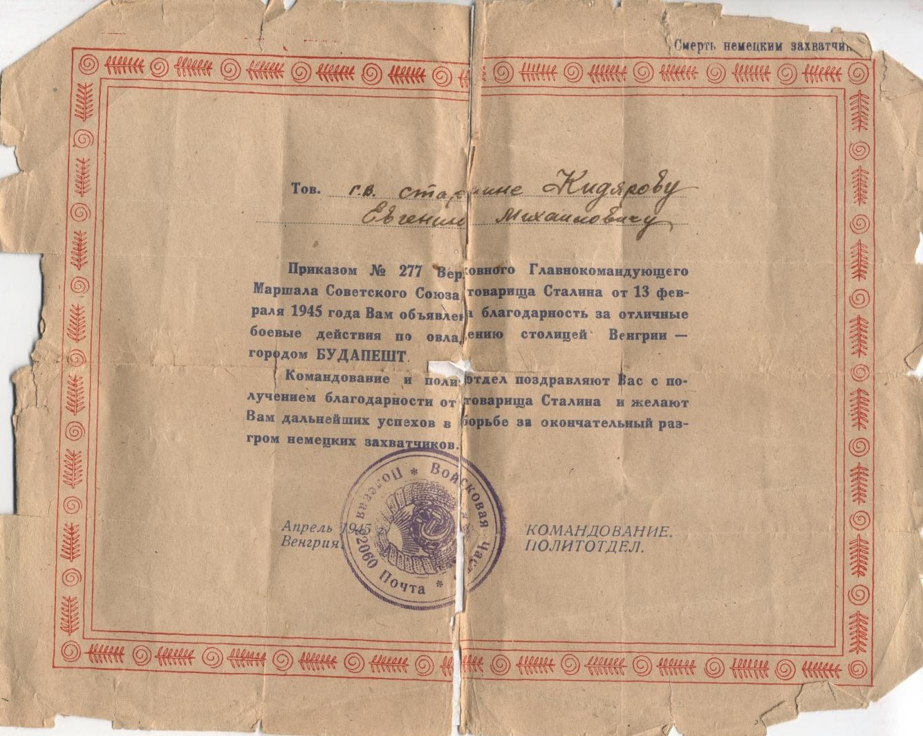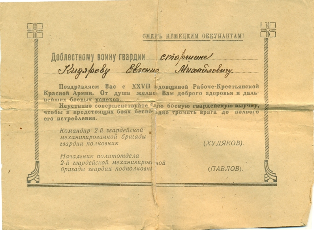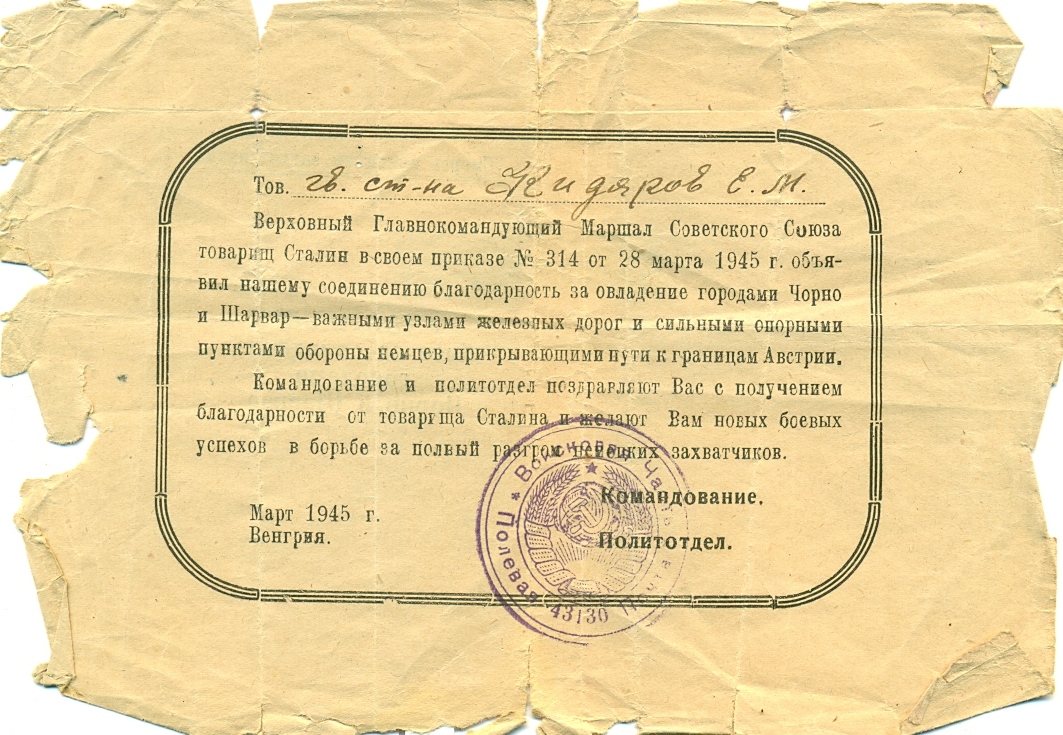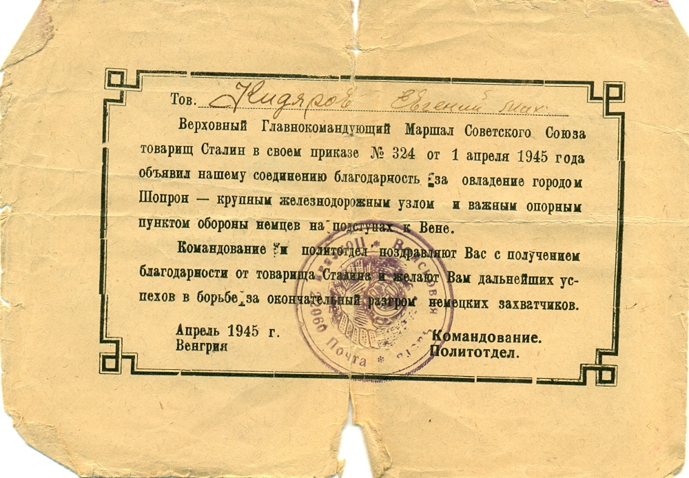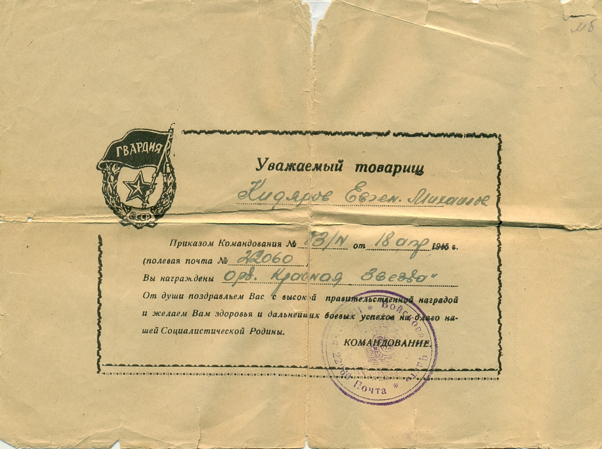 За время наступательных боев с немецкими захватчиками на территории Венгрии с 20 марта 1945 г. тов. Кидяров проявил исключительные способности и находчивость. Работая старшиной роты, он всегда бесперебойно снабжал свою роту боеприпасами при любых обстоятельствах. Батарея не имеет недостатка в боеприпасах. 21 марта 1945 г., когда один из командиров расчетов выбыл из строя, тов. Кидяров заменил его и успешно продолжал управлять расчетом в бою. За этот день огнем своего миномета он уничтожил 1 пулемет и 15 солдат противника. Достоин правительственной награды – медали «За отвагу» (наградной лист от 21.03.1945 г.).