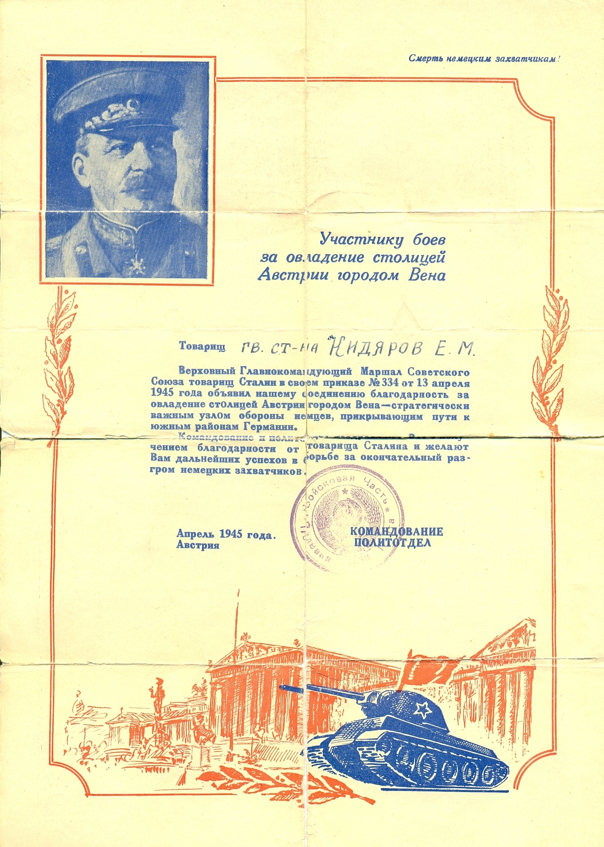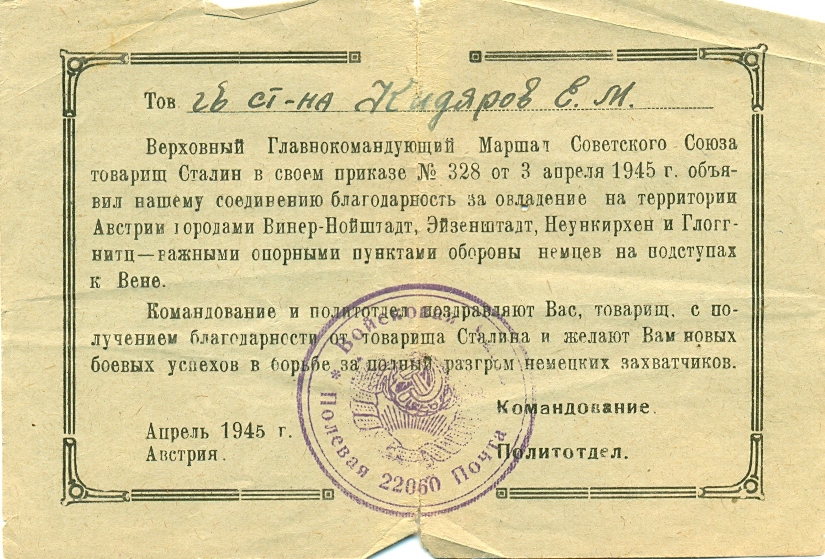 За время боев с немецкими захватчиками на территории Венгрии и Австрии и в боях за столицу Австрии Вену с 20 марта по 25 апреля 1945 г. тов. Кидяров показал исключительные способности в области обеспечения роты боеприпасами и продовольствием в бою. Рота недостатка в боеприпасах и продовольствии не имеет. Благодаря этому, рота успешно громила немцев и за время боев огнем своих минометов уничтожила 320 немецких солдат и офицеров, 12 пулеметов и подбила 4 автомашины. Достоин правительственной награды – ордена Отечественной войны II степени (наградной лист от 18.04.1945 г.).