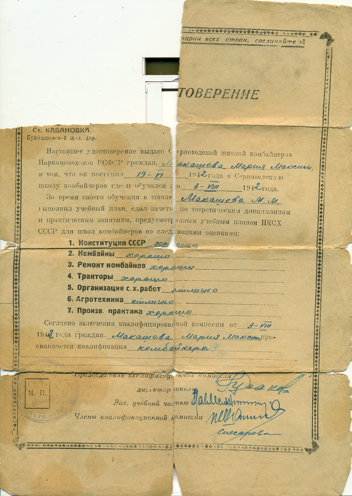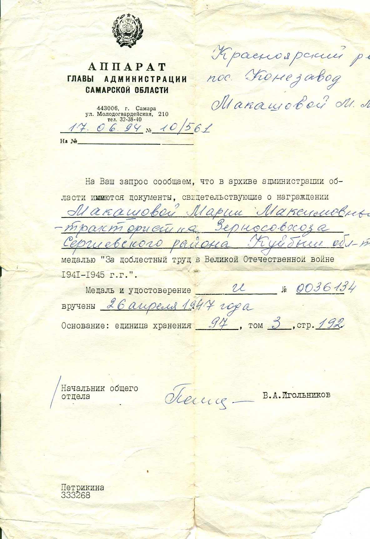 Материалы предоставила дочь Галина Александровна Сафонова, п. Конезавод Красноярского района Самарской области