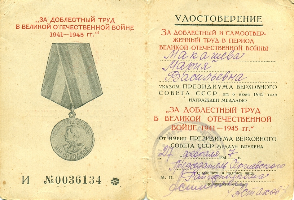 Мария Максимовна была награждена медалью «За доблестный труд в Великой Отечественной войне 1941–1945 гг.». С 1969 г. проживала в п. Конезавод, работала на Куйбышевском конном заводе, на конюшне с лошадьми.