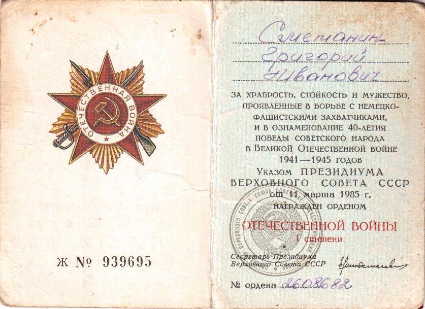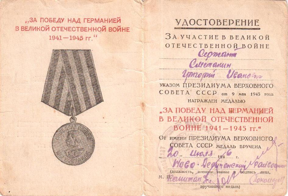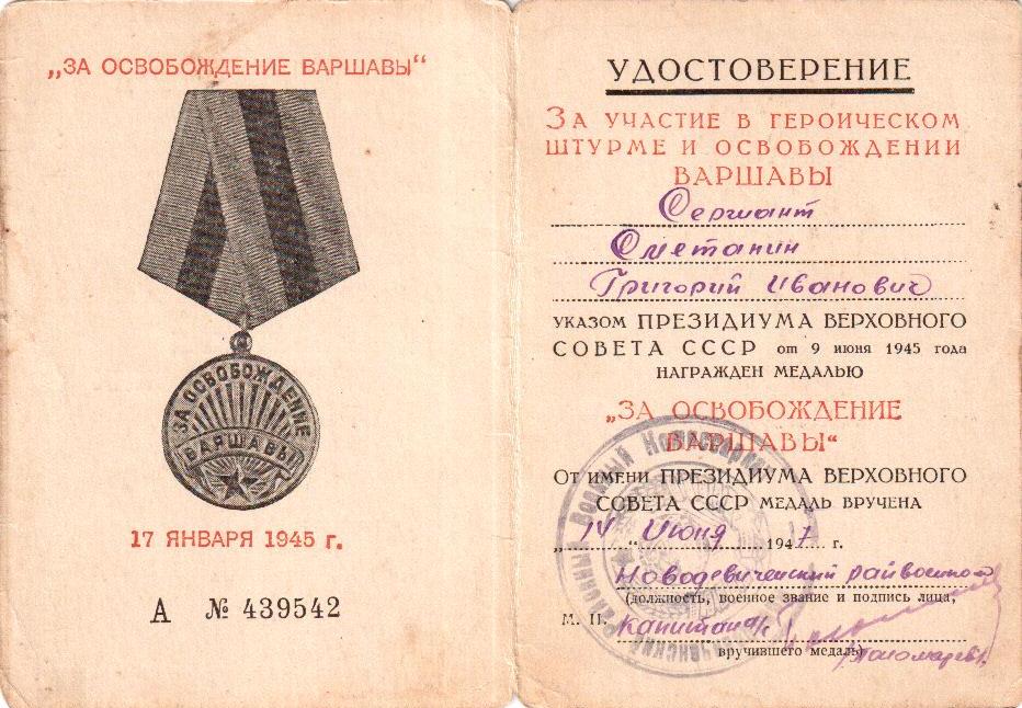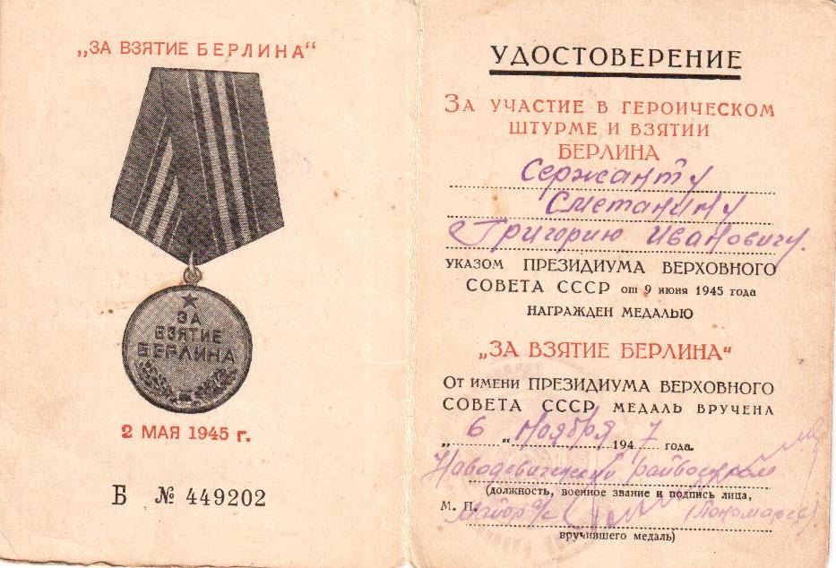 Информация с сайта podvignaroda.ru: «Сержант Сметанин в операции прорыва обороны пр-ка с плацдарма на р. Одер, работая помощником командиров взвода связи, находился на передовых наблюдательных пунктах в р-не Визенау, гос. дв. Цильтендорф, где вся местность затоплена водой пр-ком и подвергалась беспрерывно пулеметному обстрелу. 16, 17 апреля с/г пр-к вел сильный артиллерийский огонь и часто нарушал линию связи. Сержант Сметанин целыми сутками без отдыха находился на этом участке и организовывал работу связи. 16 апреля после авианалета и сильного артобстрела пр-ка линия связи была во многих местах нарушена. Сержант Сметанин быстро организовал прокладку новой связи через участок затопленный водой до НП Командующего Артиллерией 362 СД, чем обеспечил управление боем. За успешное обеспечение связью, самоотверженную работу достоин награждения орденом Отечественной войны II степени» (наградной лист от 06.05.1945 г.).