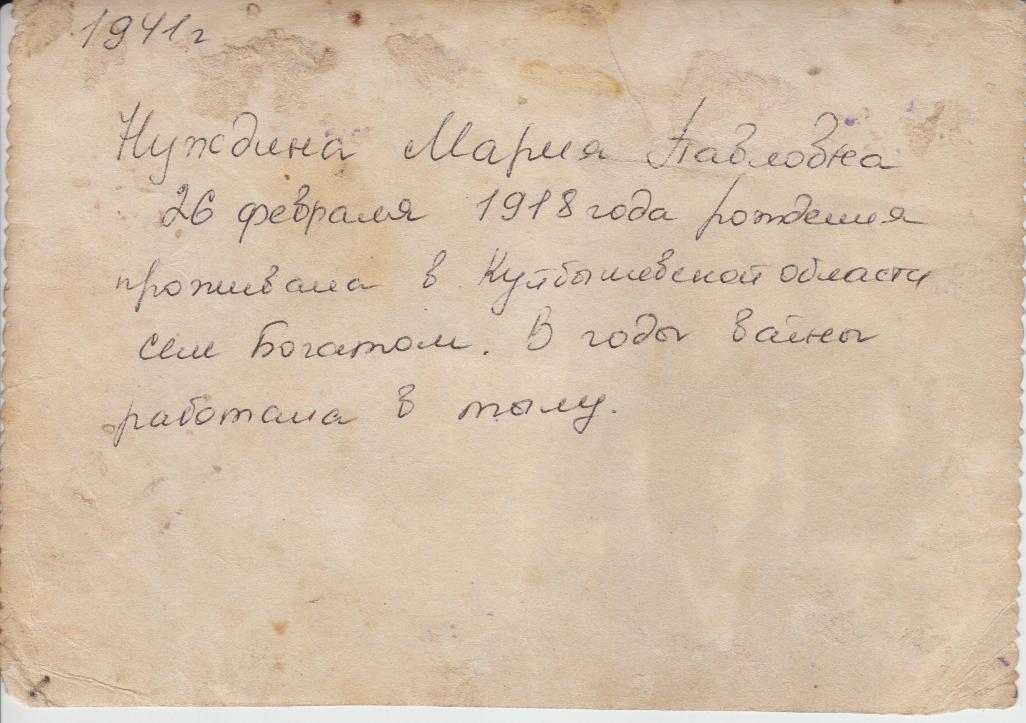 Нуждина Мария Павловна родилась 26 февраля 1918 года. Проживала в селе Богатое Куйбышевской области. Умерла 28 апреля 1980 года. В годы Великой Отечественной войны работала в тылу.