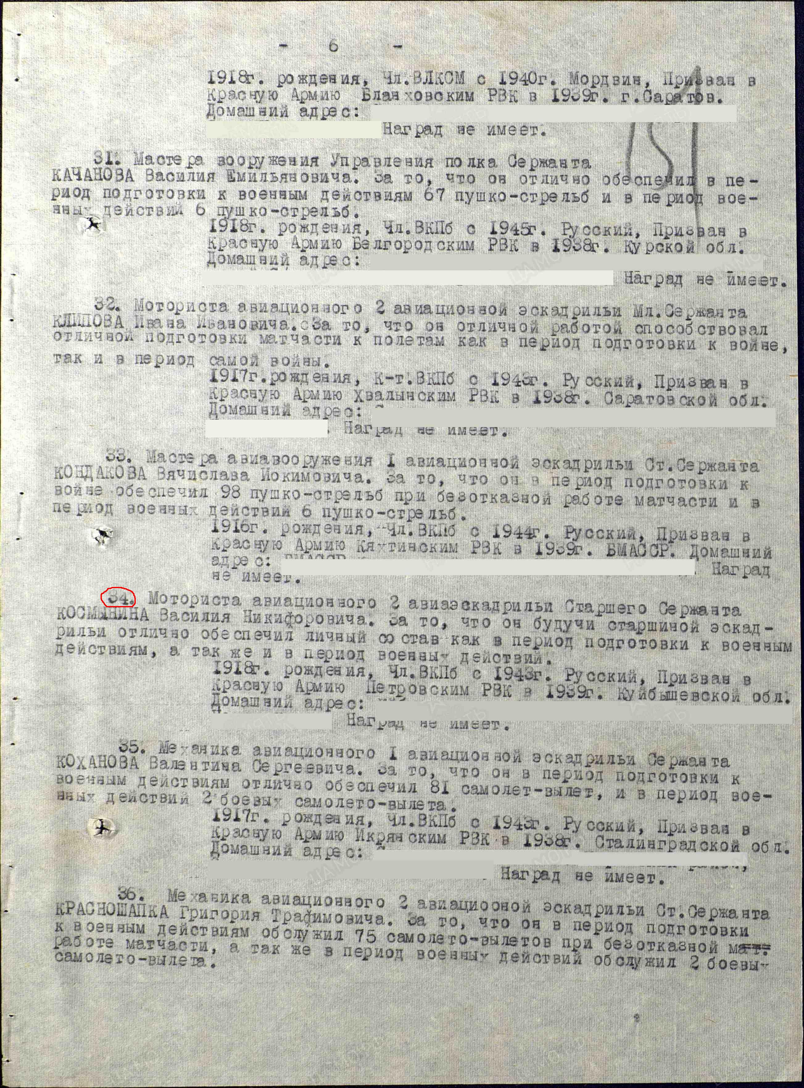 Наградить медалью "За боевые заслуги" моториста авиационного 2-й авиаэскадрильи старшего сержанта Космынина Василия Никифоровича за то, что он, будучи старшиной эскадрильи, отлично обеспечил личный состав как в период подготовки к военным действиям, а также и в период военных действий (наградной лист от 20.08.1943 г.).