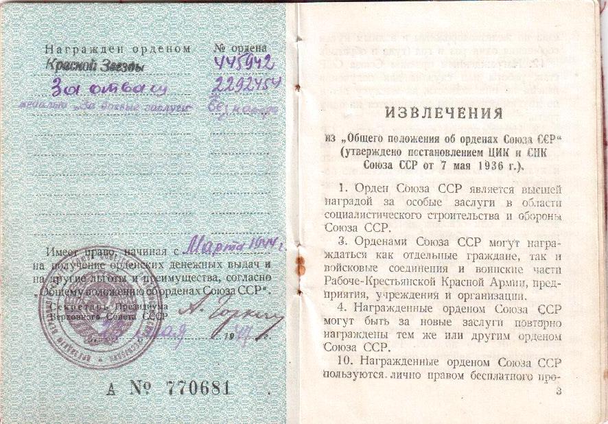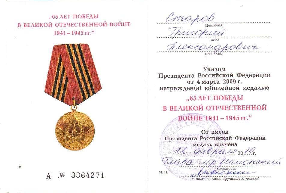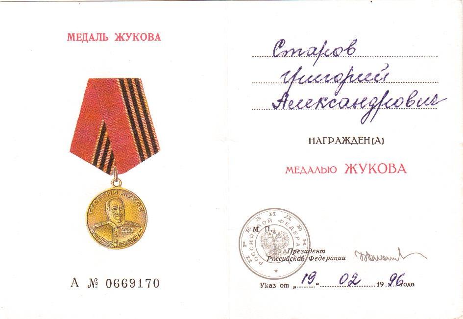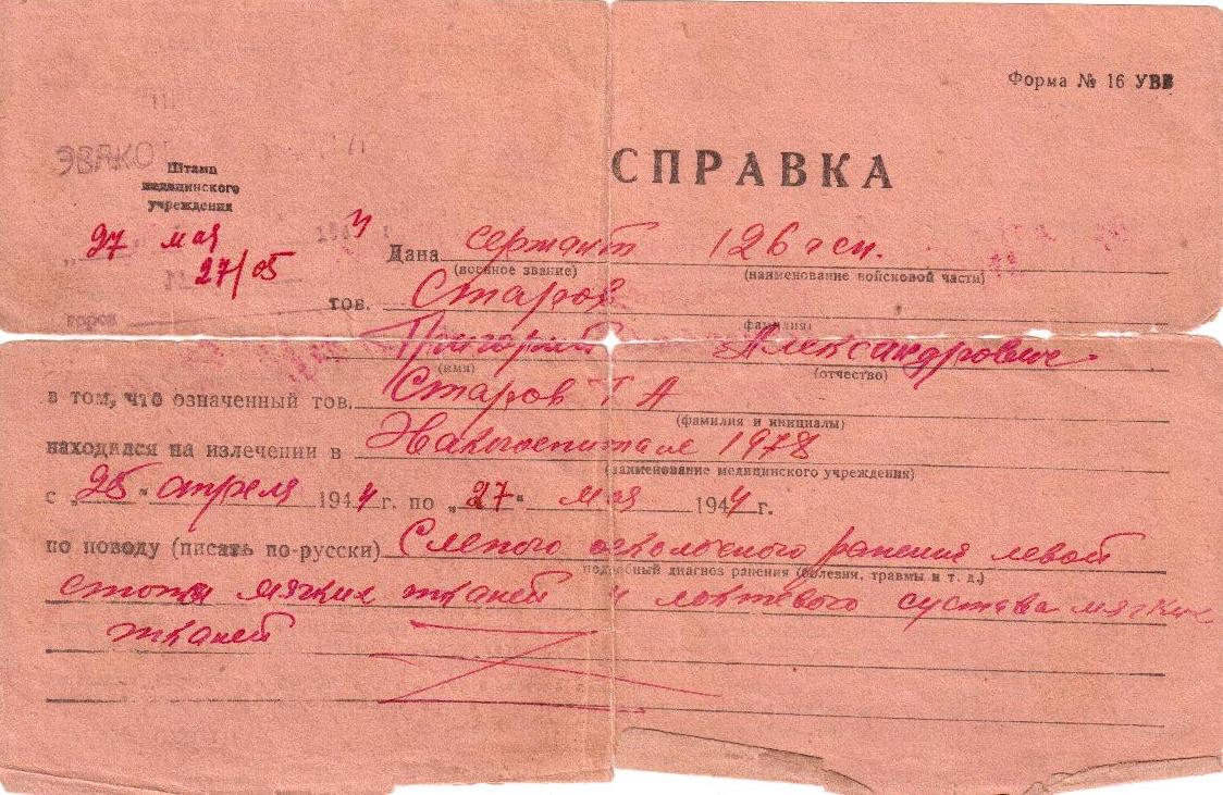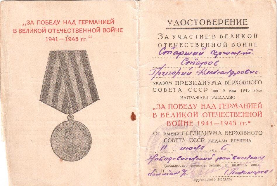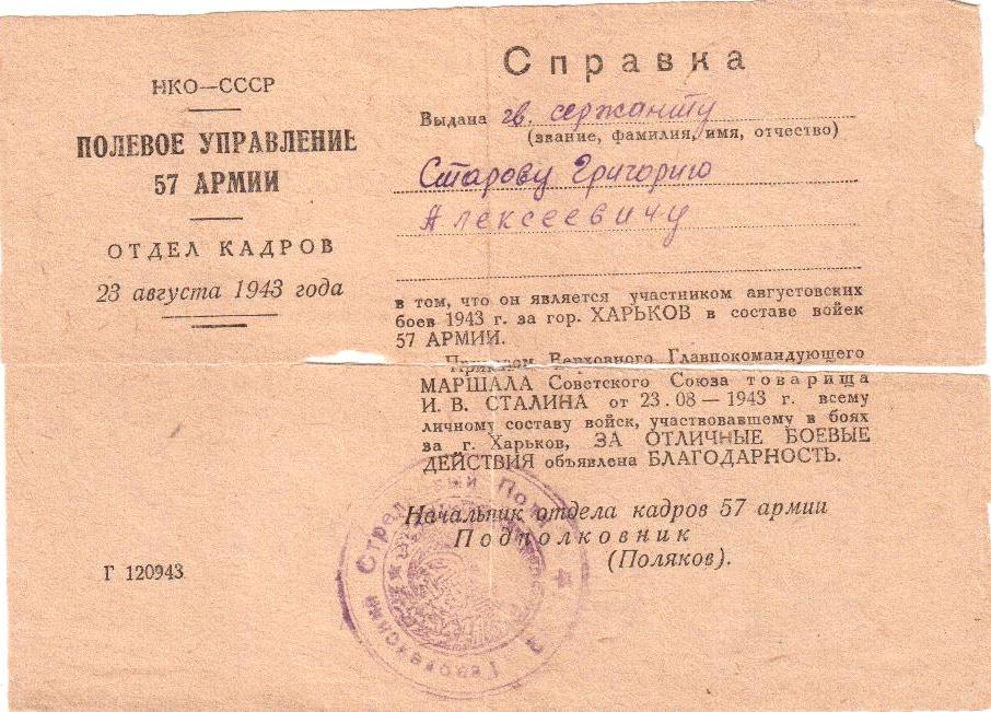«В РККА с 1941 г. Участник Отечественной войны с 1942 г. В полку с 1942 г. За время боев с 10 по 31 августа т. Старов вовремя наводил связь к батальону. За все время не имеет случая перебоя в связи и потери имущества» (приказ о награждении медалью «За боевые заслуги» от 15.09.1943 г.).