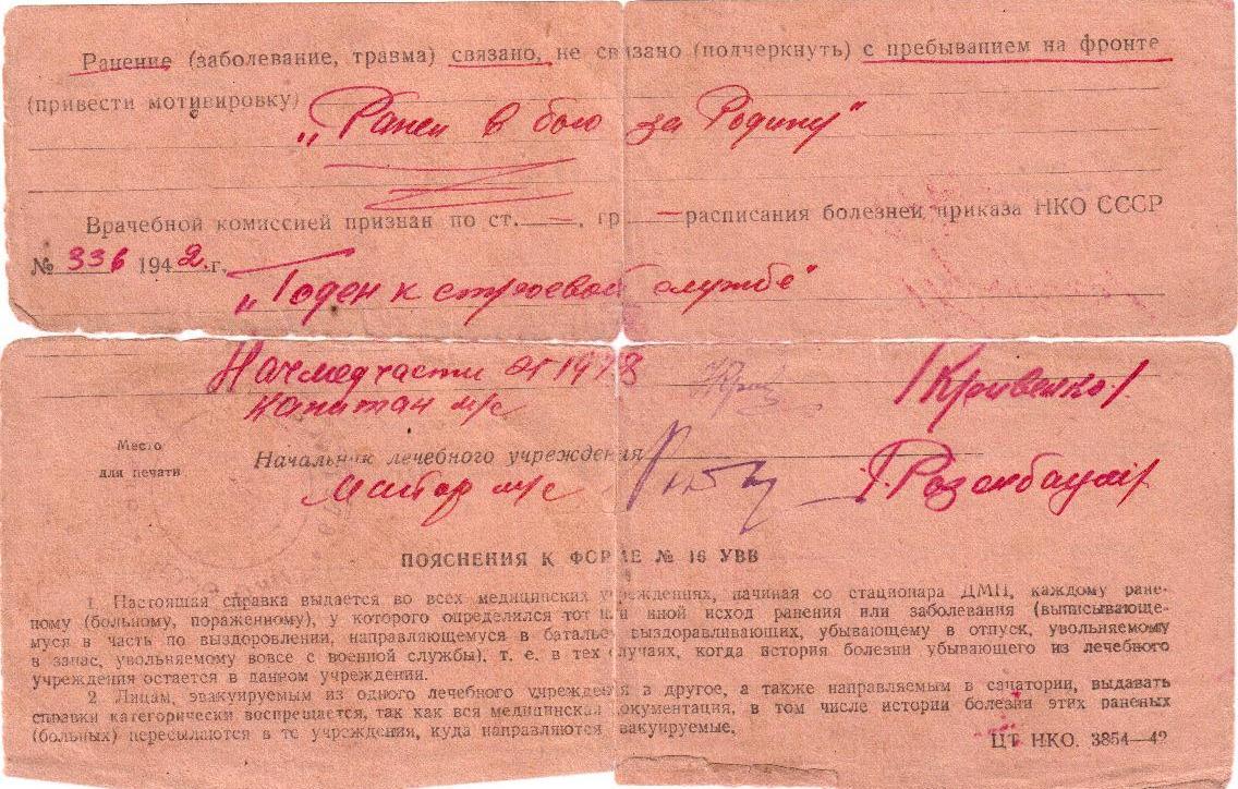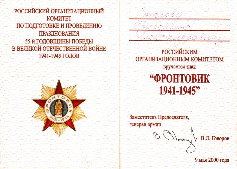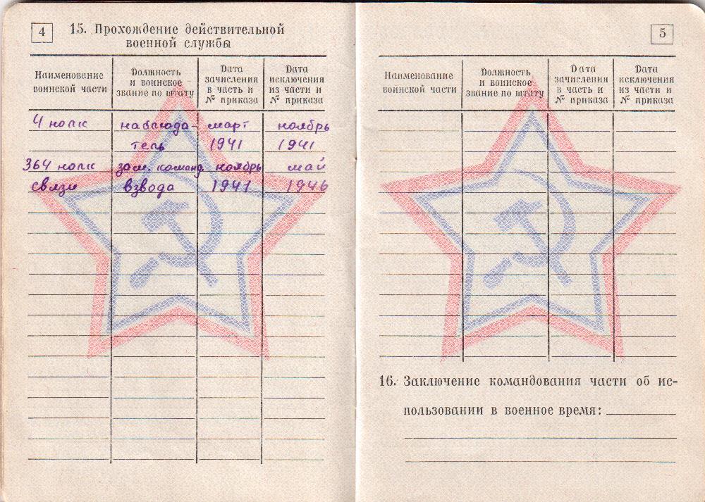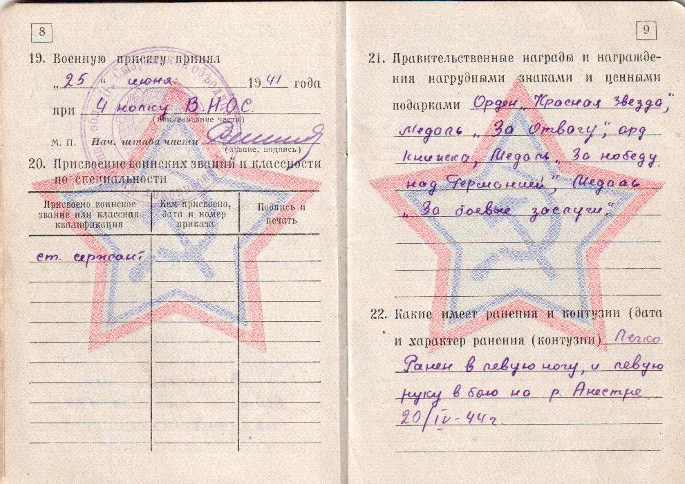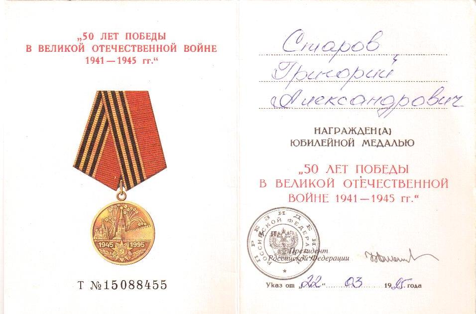 «В РККА с 1941 г. Участник Отечественной войны с 1942 г. В полку с 1942 г. За время боев с 10 по 31 августа т. Старов вовремя наводил связь к батальону. За все время не имеет случая перебоя в связи и потери имущества» (приказ о награждении медалью «За боевые заслуги» от 15.09.1943 г.).