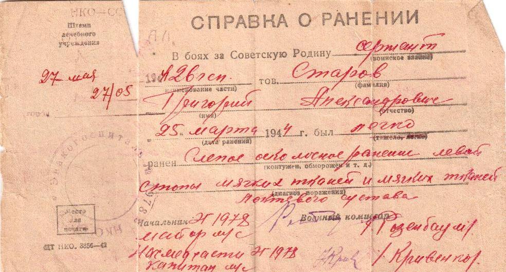 «В боях по разгрому окруженных войск противника 17 февраля 1944 г. тов. Старов, обеспечивая телефонную связь от КП полка к стр. батальону, под сильным пулеметным и минометным огнем противника за день боев исправил семь порывов линии связи, тем самым обеспечил бесперебойную телефонную связь. Находясь в стрелковом батальоне, во время отражения контратаки противника, т. Старов вступил в бой вместе со стрелковым подразделением, при этом уничтожил более 10 гитлеровцев. За обеспечение телефонной связи и за отважные действия в бою достоин правительственной награды ордена Красной Звезды» (наградной лист от 21.02.1944 г.).