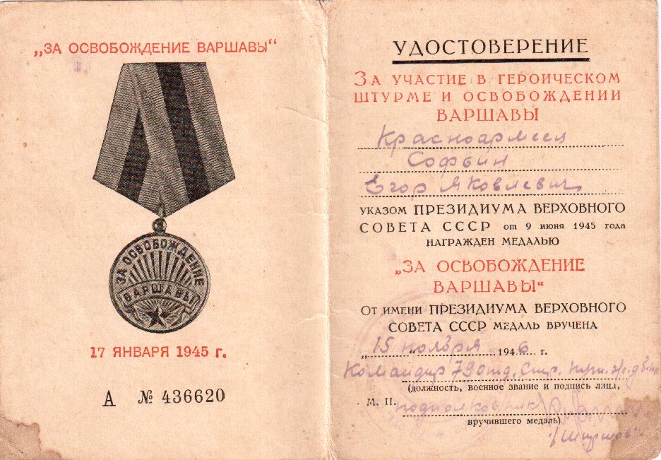 Егор Яковлевич демобилизовался в 1946 г. Был награжден медалями «За боевые заслуги», «За освобождение Варшавы», «За взятие Берлина», «За Победу над Германией в Великой Отечественной войне 1941–1945 гг.».