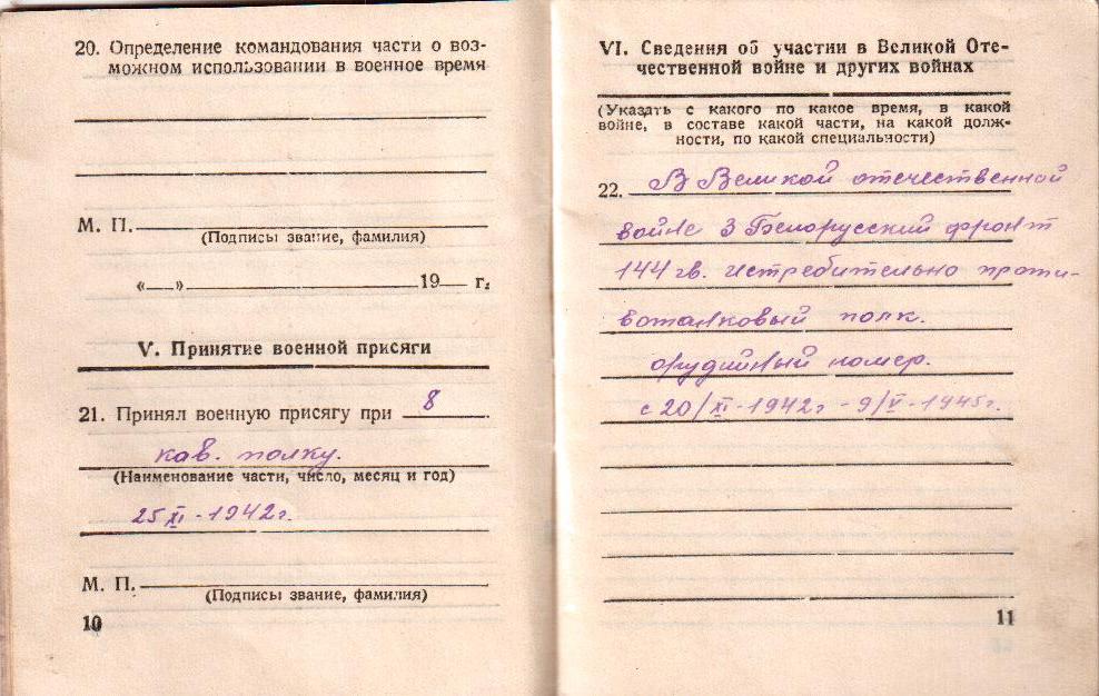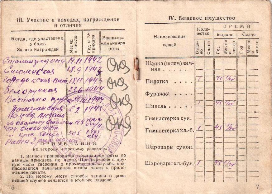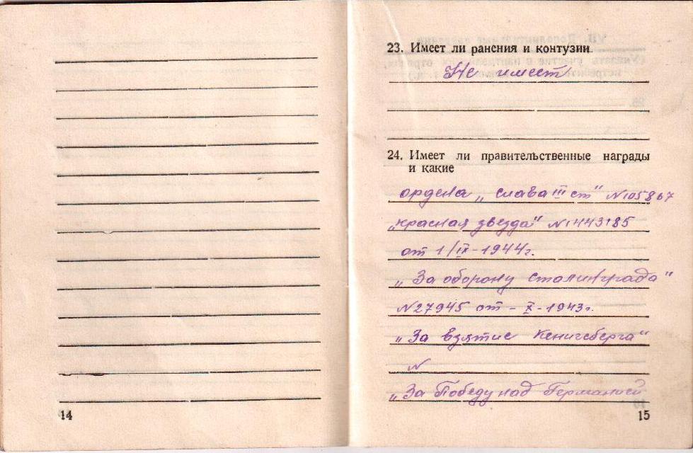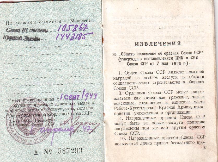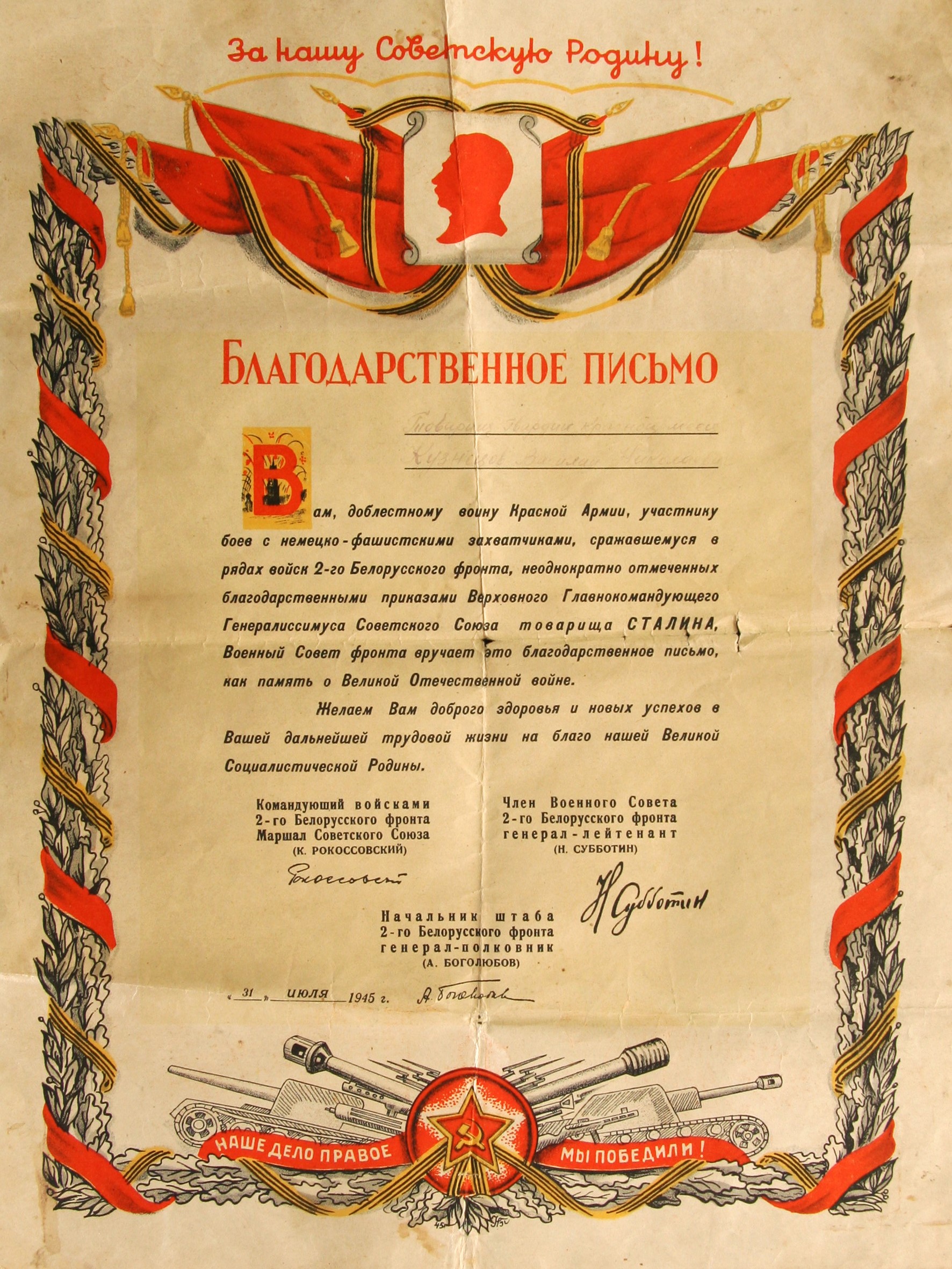 «В бою 27 июня 1944 года в районе Старая Пересека под сильным артиллерийско-минометным и ружейно-пулеметным огнем, с риском для жизни пробрался в расположение противника и огнем автомата и ручными гранатами уничтожил станковый пулемет противника, мешающий развертыванию батареи на открытой огневой позиции, с его прислугой. За мужество и отвагу, проявленные в бою, достоин правительственной награды орденом Слава третьей степени» (наградной лист от 01.08.1944 г.).