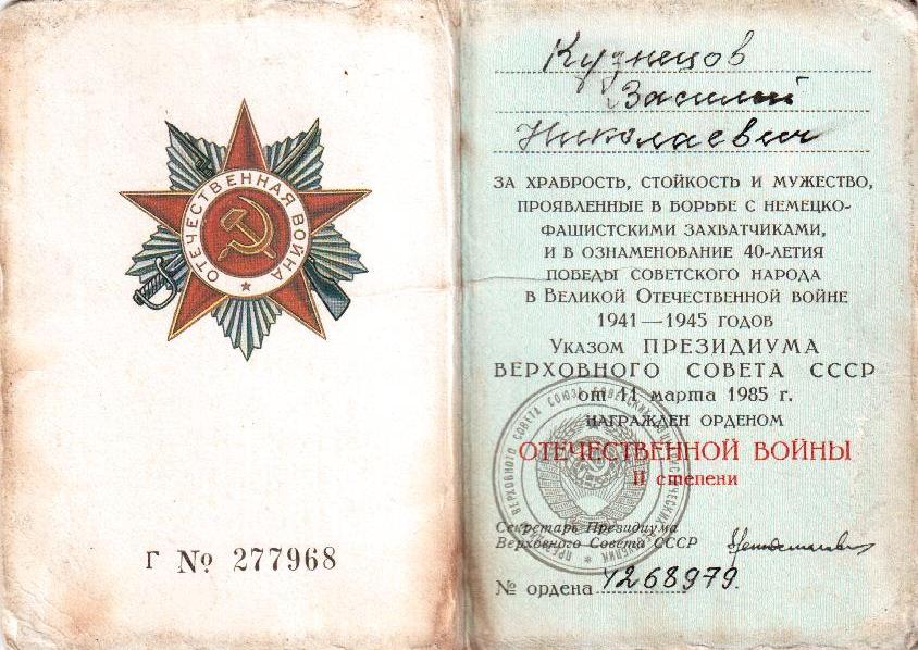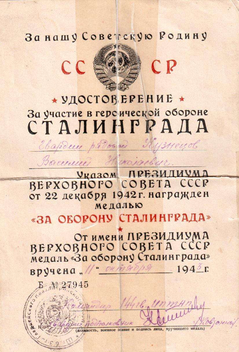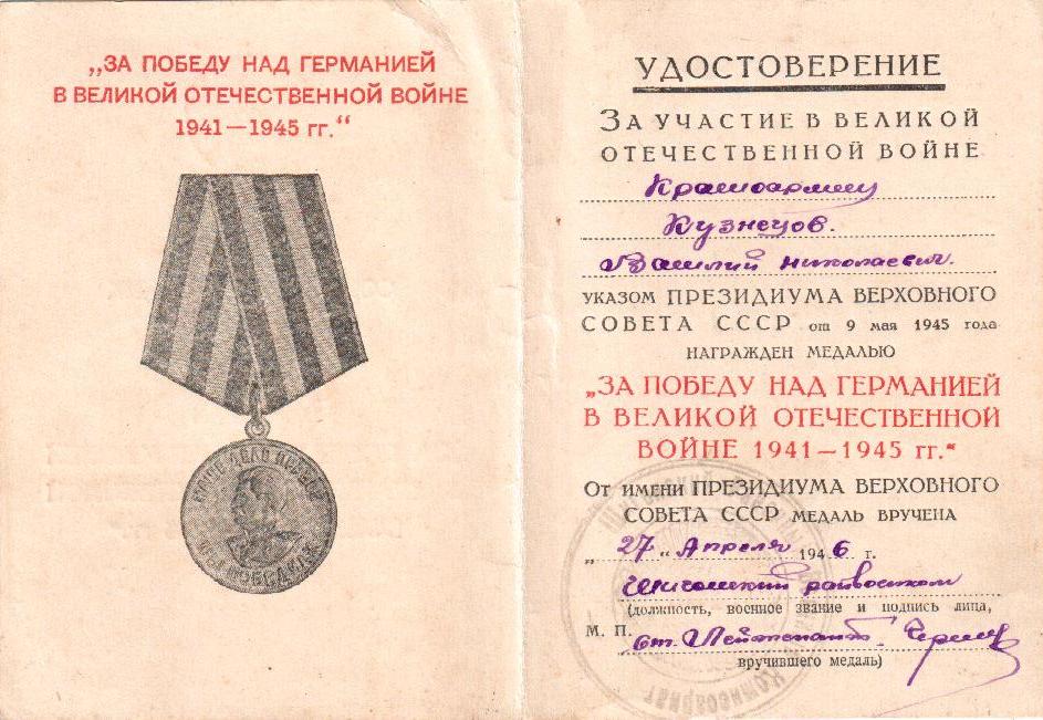 «В бою 3 мая 1945 г. в районе 3 км южнее Перлеберг противник силою пехоты и танков пытался прорваться на Перлеберг. Товарищ Кузнецов огнем своего орудия с открытой огневой позиции прямой наводкой уничтожил один танк, подбил две автомашины и убил до 15 солдат противника За мужество и отвагу, проявленные в бою, за нанесенное поражение противнику достоин правительственной награды орденом Красная Звезда» (наградной лист от 12.05.1945 г.).