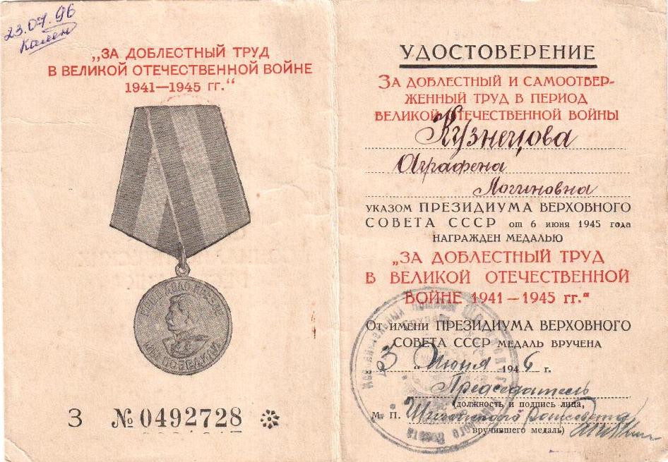 В годы войны трудилась в тылу, за что была награждена медалью «За доблестный труд в Великой Отечественной войне 1941–1945 гг.»