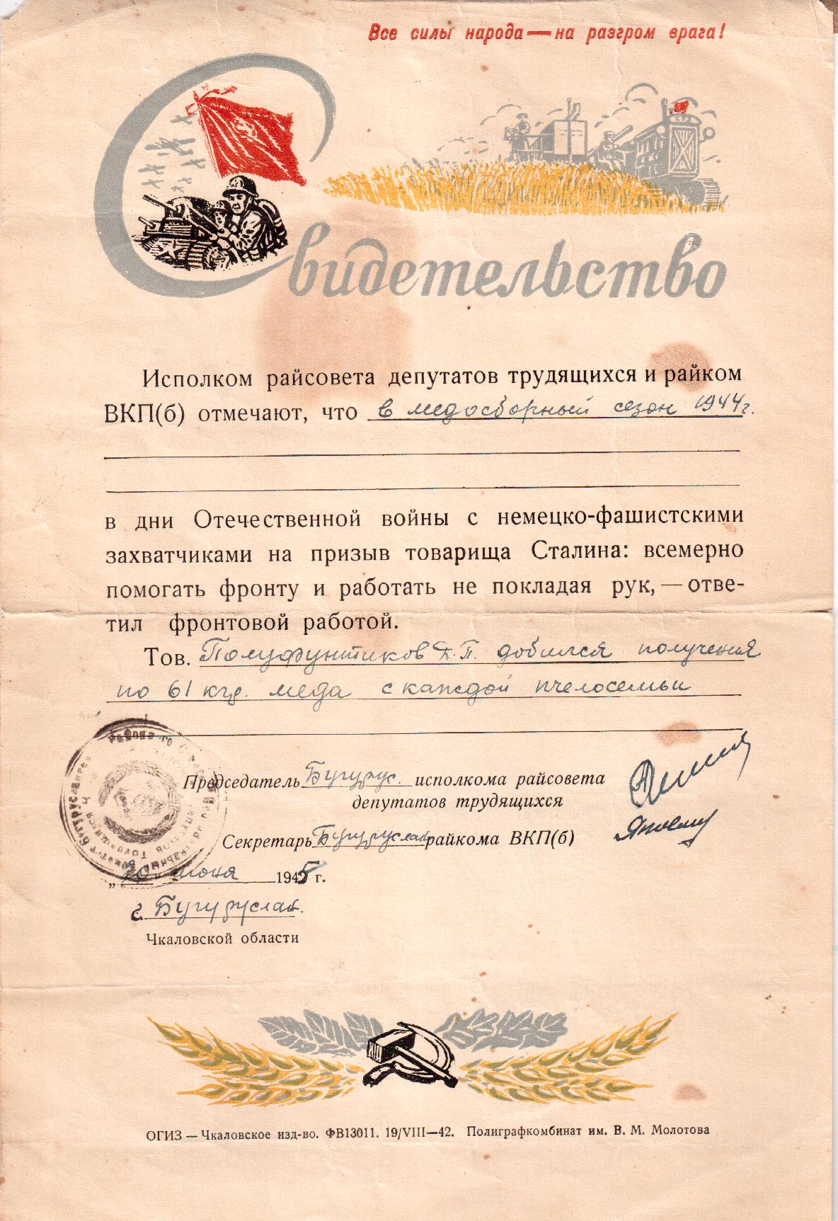 После ранения Д.П. Полуфунтиков вновь вернулся к занятию пчеловодством и получал очень высокие результаты, поставляя мед на фронт. В 1944 г. в медосборный сезон он получил 61 кг меда на пчелосемью, за что и был награжден данным свидетельством.