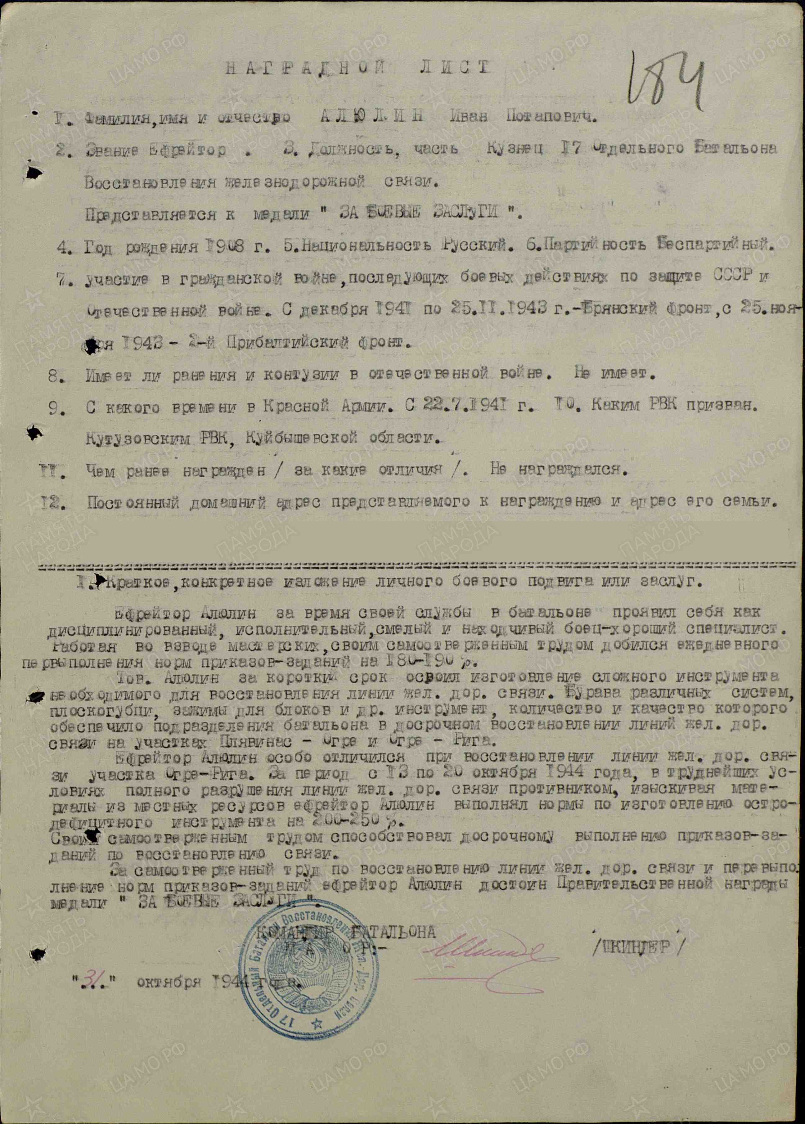 Ефрейтор Алюлин за время своей службы в батальоне проявил себя как дисциплинированный, исполнительный, смелый и находчивый боец, хороший специалист. Работая во взводе мастерских, своим самоотверженным трудом добился ежедневного перевыполнения норм приказов-заданий на 180-190%. Тов. Алюлин за короткий срок освоил изготовление сложного инструмента, необходимого для восстановления линии железнодорожной связи – бурава различных систем, плоскогубцы, зажимы для блоков и другой инструмент, количество и качество которого обеспечило подразделения батальона в досрочном восстановлении линий связи на участках Плявиняс-Огре и Огре-Рига (Латвия). Ефрейтор Алюлин особо отличился при восстановлении линии связи участка Огре-Рига. За период с 13 по 20 октября 1944 г., в труднейших условиях полного разрушения противником линии железнодорожной связи, изыскивая материалы из местных ресурсов, ефрейтор Алюлин выполнял нормы по изготовлению остродефицитного инструмента на 200-250%. Своим самоотверженным трудом способствовал досрочному выполнению приказов-заданий по восстановлению связи. За самоотверженный труд по восстановлению линии связи и перевыполнение норм приказов-заданий ефрейтор Алюлин достоин правительственной награды – медали "За боевые заслуги"» (наградной лист от 31.10.1944 г.).