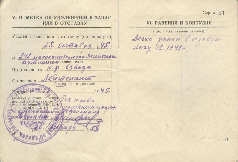 Уволен в запас 25 октября 1945 г. в звании лейтенанта зенитного артполка. После войны продолжил педагогическую деятельность. Был награжден медалью «За Победу над Германией в Великой Отечественной войне 1941–1945 гг.»