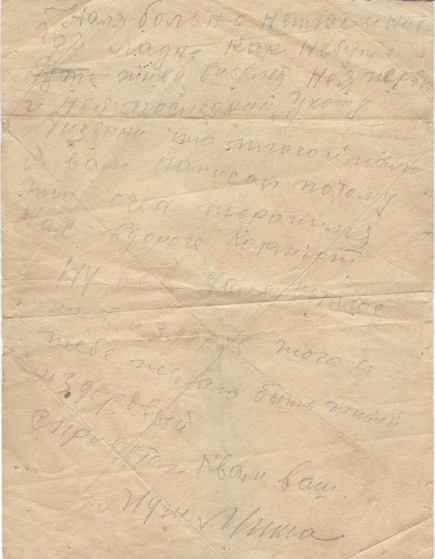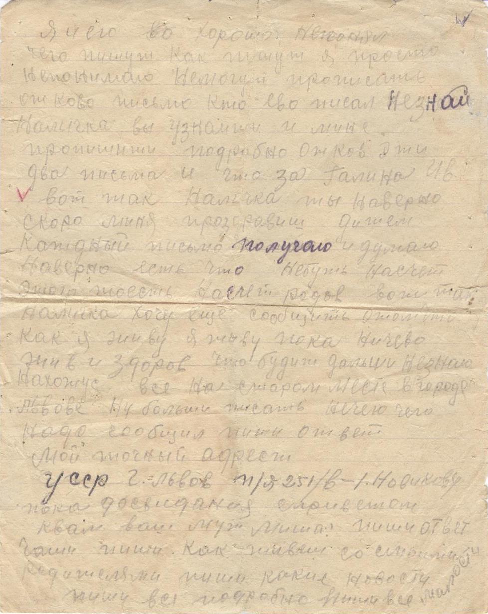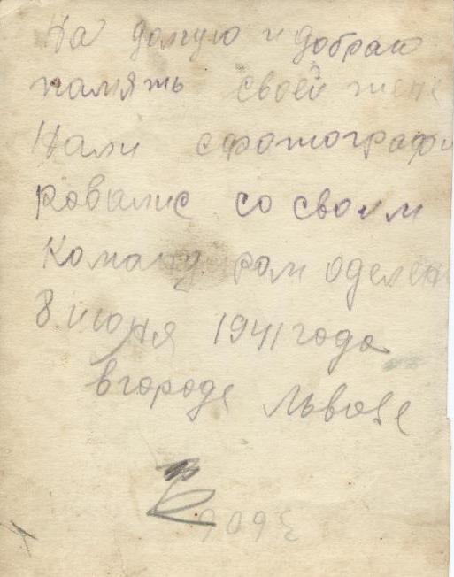Из письма 11 мая 1941 г.: «…Я нахожусь на Украине на польской территории и очень здесь сейчас холодно. Раздевши нельзя ходить, замерзнешь. Ходим, одевши и в варежках… Здесь дожди. Дождь пройдёт, будет буран. Как приехали, не видали хорошего и тёплого дня…»