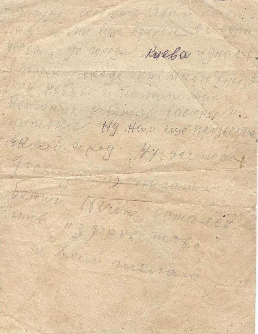 Из письма 23 апреля 1941 г.: «…Теперь сообщаю я вам о том, что мы ещё в дороге всё едем. Доехали до города Киева и у нас в этом городе очень много высадили ребят. Ну, нам ещё неизвестно, в какой город…»