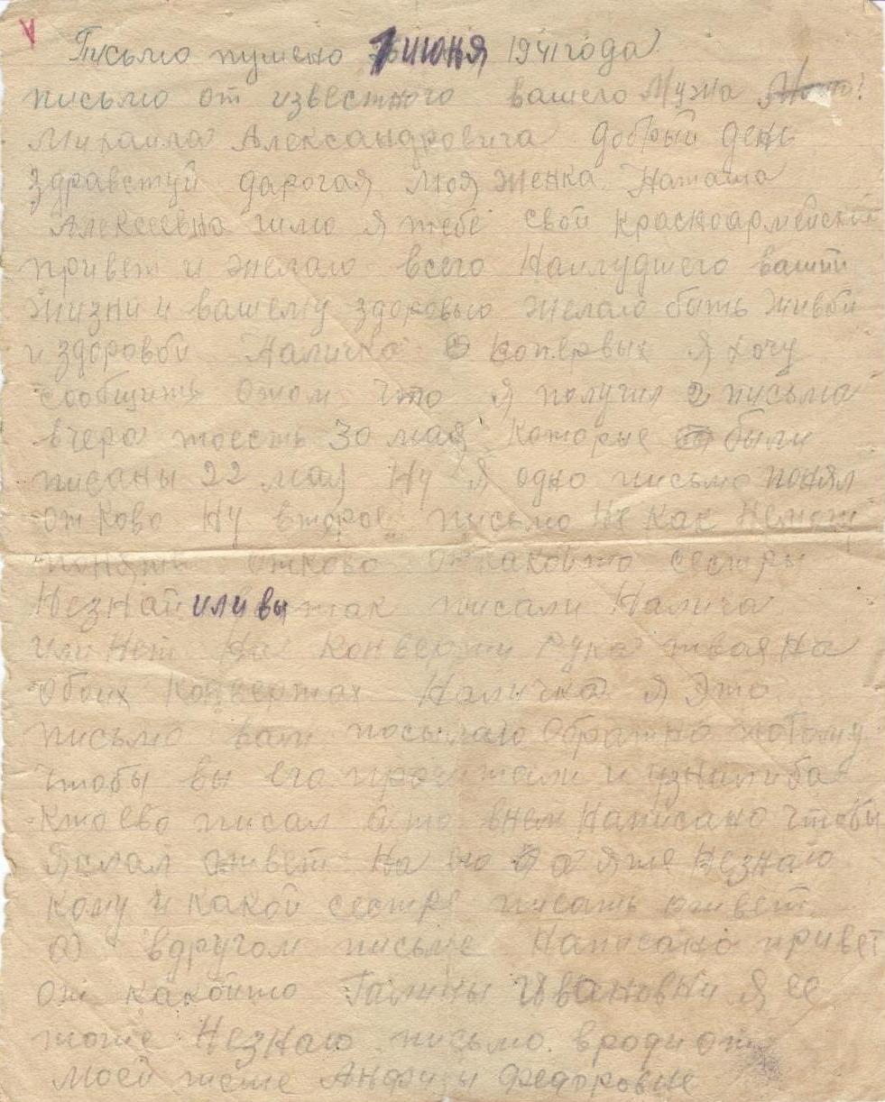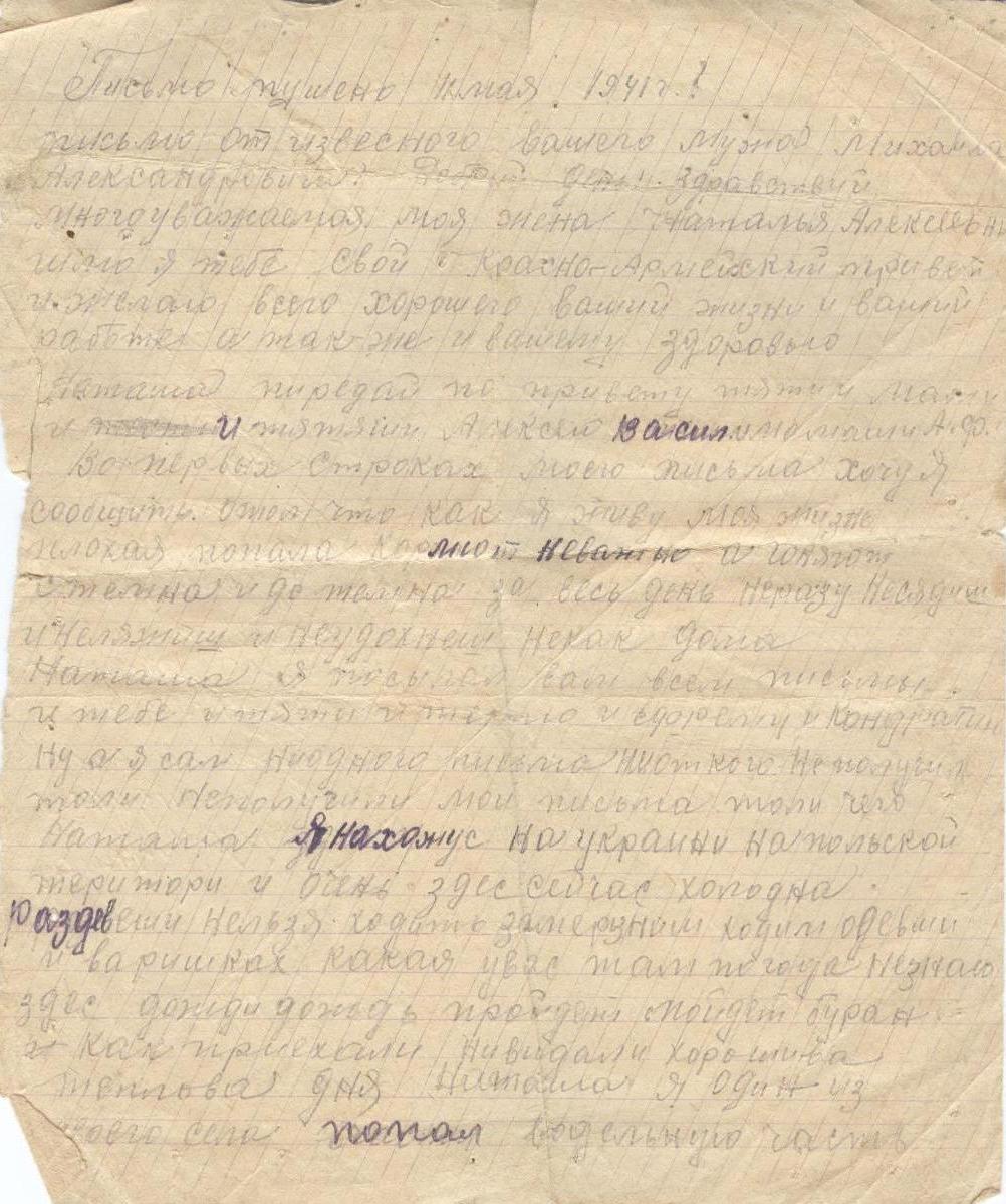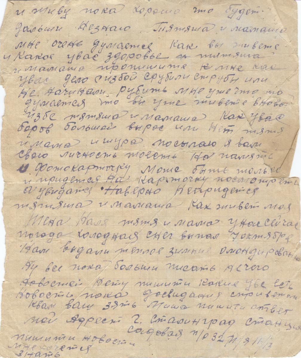 Из письма 15 ноября 1941 г.: «…Я спешу сообщить о том, что, где я нахожусь, и как я живу. Я в данное время нахожусь в городе Сталинграде на вторичной подготовке к войне и живу пока хорошо. Что будет дальше, не знаю… У нас сейчас погода холодная, снег выпал 7 октября. Нам выдали тёп-лое зимнее обмундирование…»