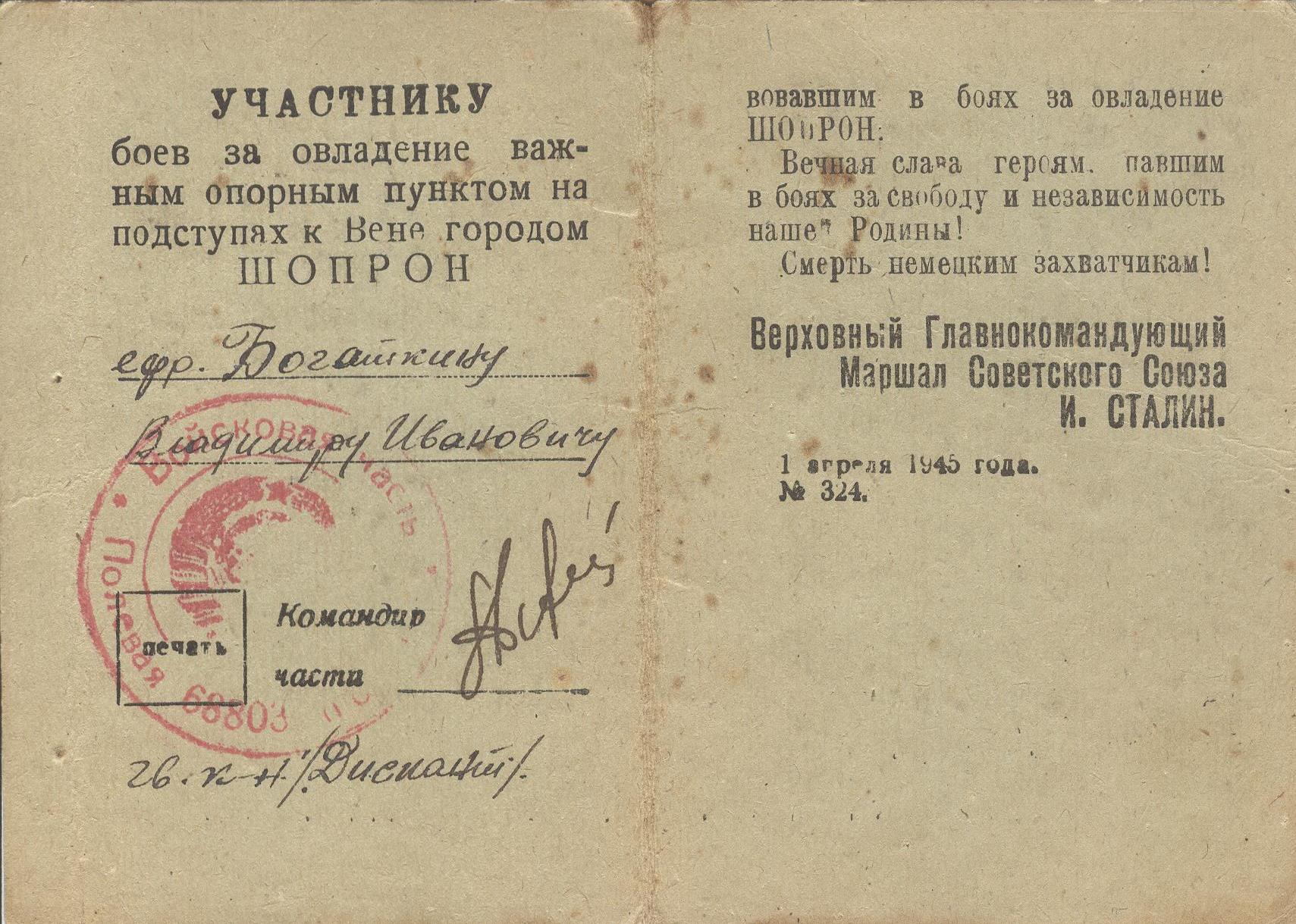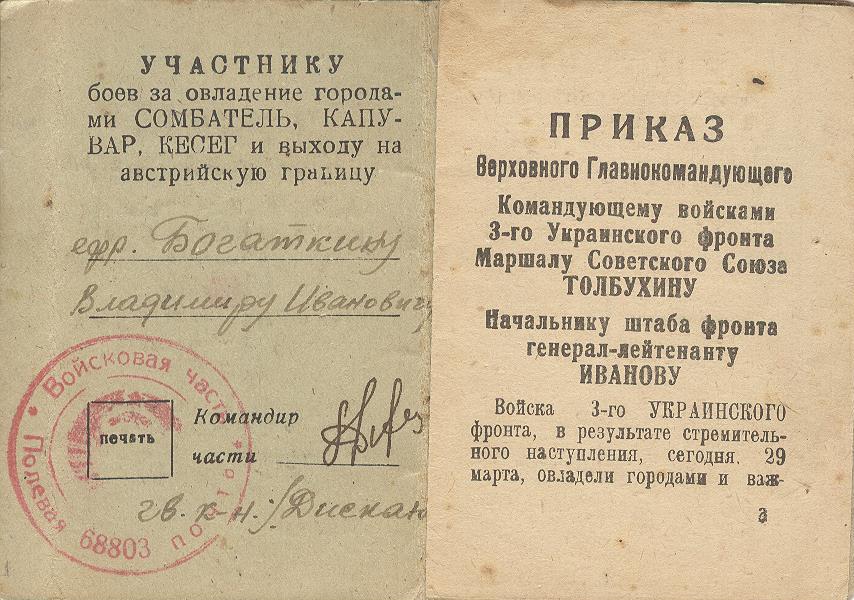 «Во время прорыва сильно укреплённой обороны противника в районе южнее гор. Секешфехервар шофёр-рядовой Богаткин под сильным артиллерийским огнём в рядах наступающей пехоты на своей автомашине, рискуя жизнью, умело маневрируя по бездорожью между разрывами снарядов и мин противника, перебросил два миномёта с их расчётами и боеприпасами на новый более выгодный рубеж. Под огнём противника Богаткин совершил два рейса без потерь» (награжден медалью «За отвагу», приказ от 17.02.1945 г.).
