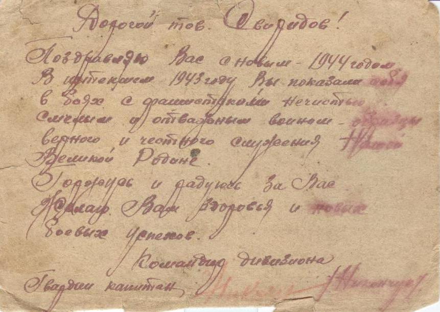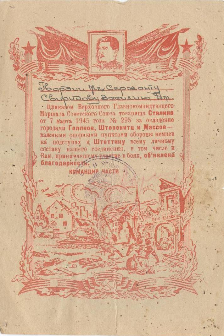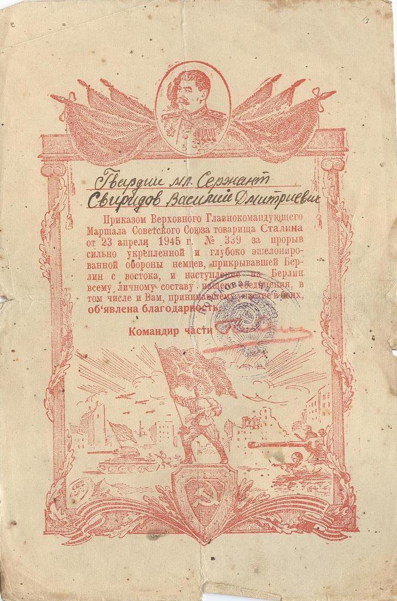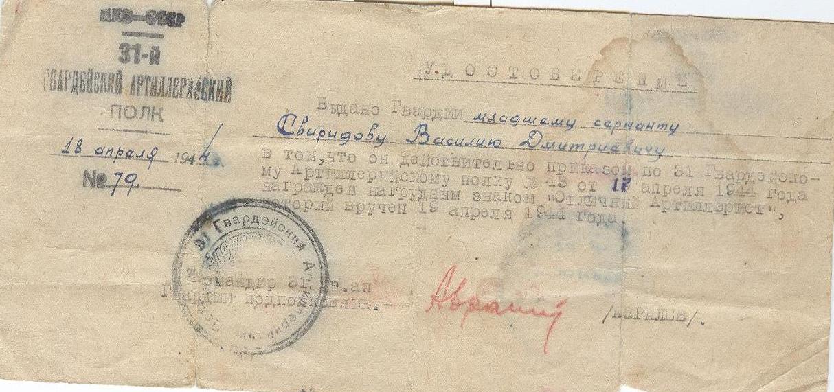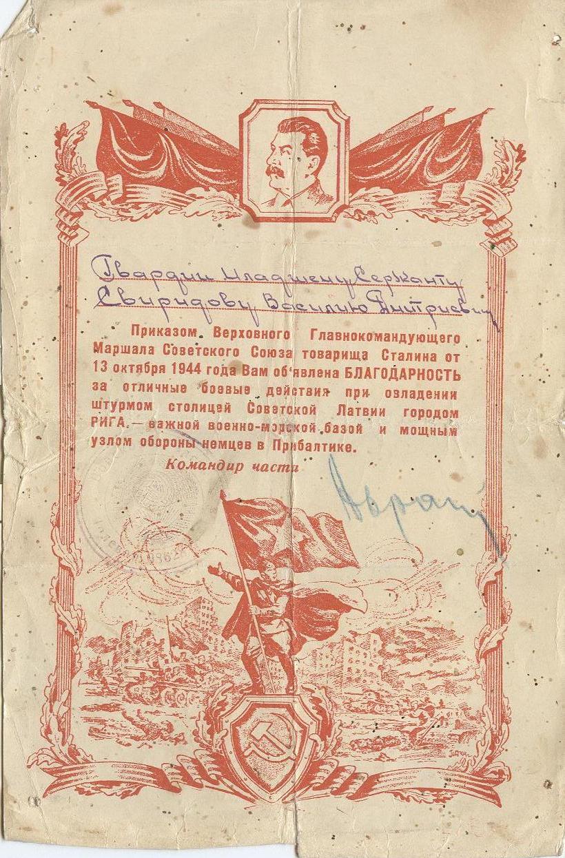 «Наградить медалью «За отвагу» наводчика орудия 1-й батареи гвардии красноармейца Свиридова Василия Дмитриевича за то, что он в бою, находясь в боевых порядках пехоты, своим орудием прямой наводкой уничтожил 2 фланкирующих пулемета противника. Во время перегруппировки сил противника для перехода в контратаку разбил автомашину и уничтожил 15 солдат, находившихся в ней. В составе батареи 23 октября 1943 г. отразил 3 атаки, предпринятые немецкой пехотой» (наградной лист от 21.10.1943 г.).
