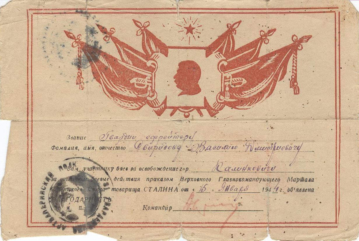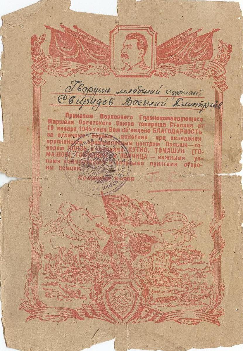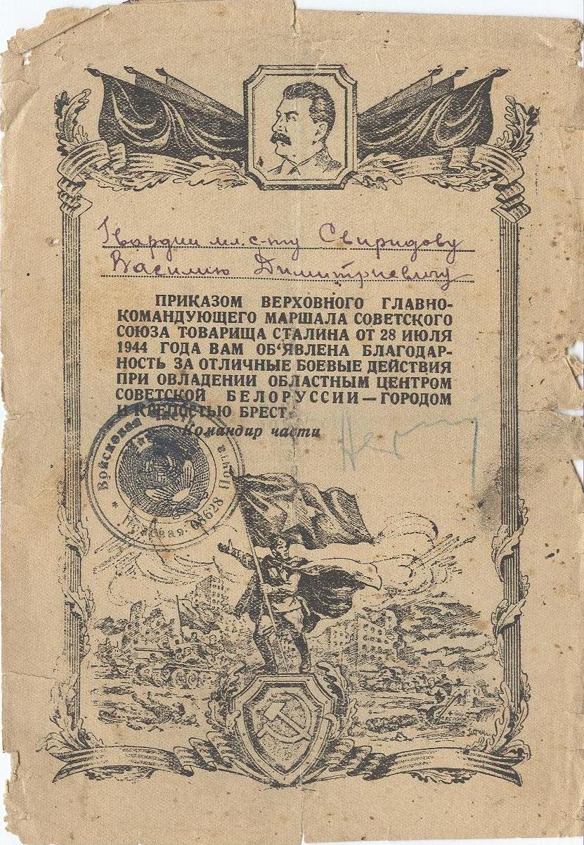 «Наградить медалью «За отвагу» наводчика орудия 1-й батареи гвардии ефрейтора Свиридова Василия Дмитриевича за то, что он в бою 13 января 1944 г. в районе города Калинковичи своим орудием прямой наводкой уничтожил 3 пулемета, которые препятствовали продвижению нашей пехоты вперед. После продвижения нашей пехоты тов. Свиридов на руках, не отставая от пехоты, катил орудие в боевых порядках, обеспечивая защиту достигнутого рубежа на случай контратаки противника» (наградной лист от 23.01.1944 г.).