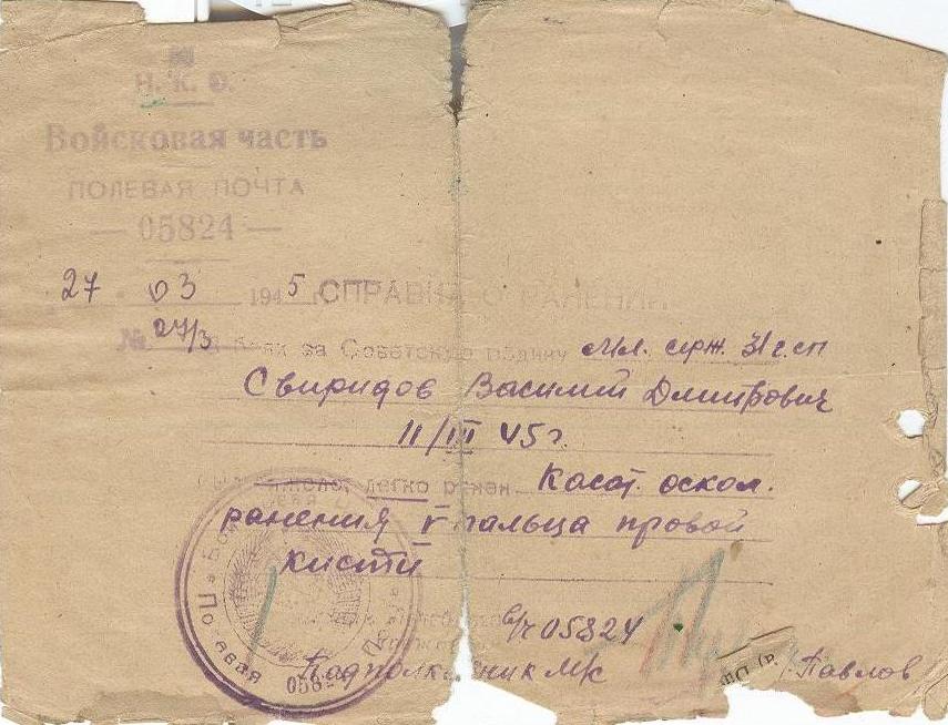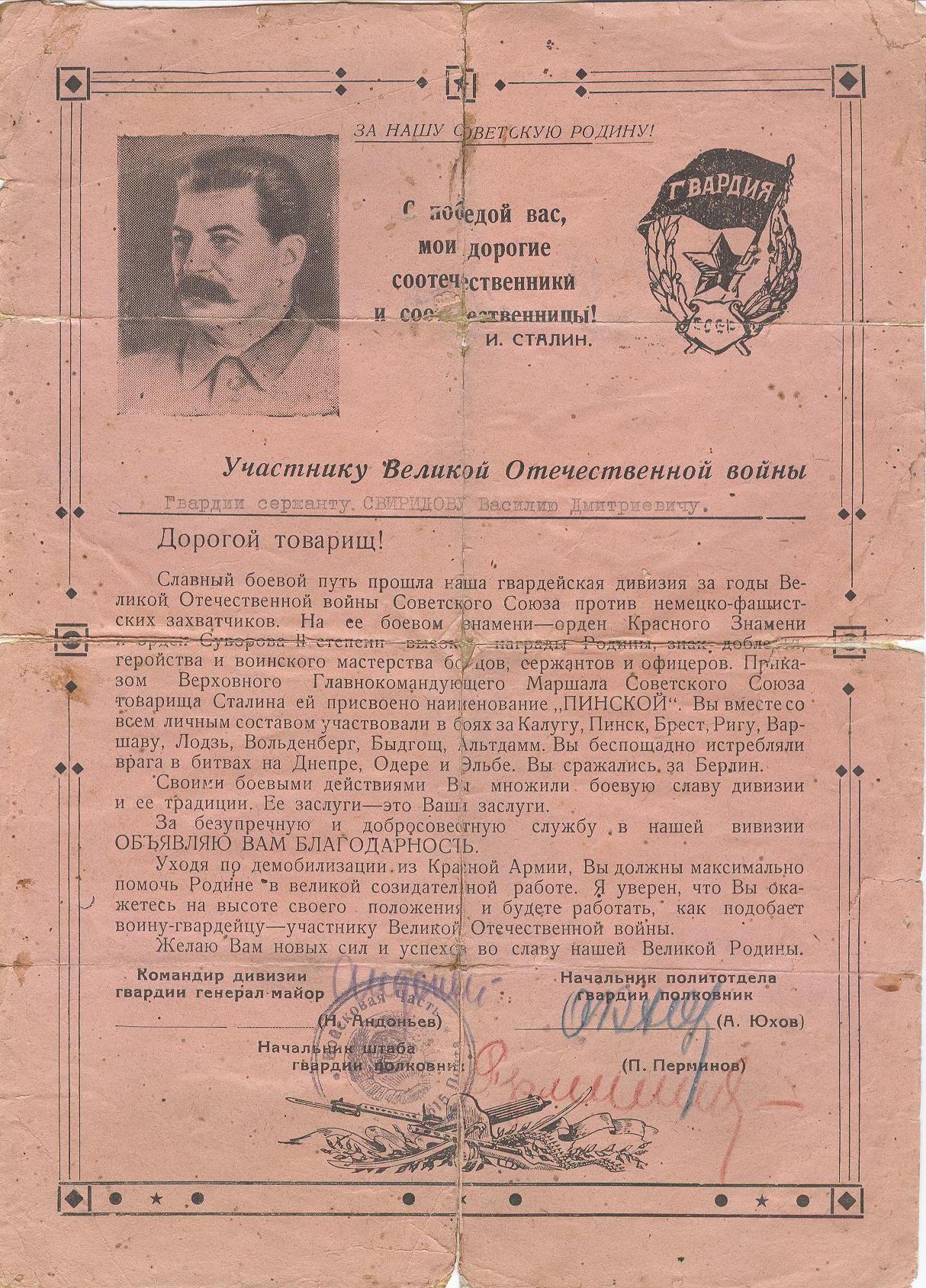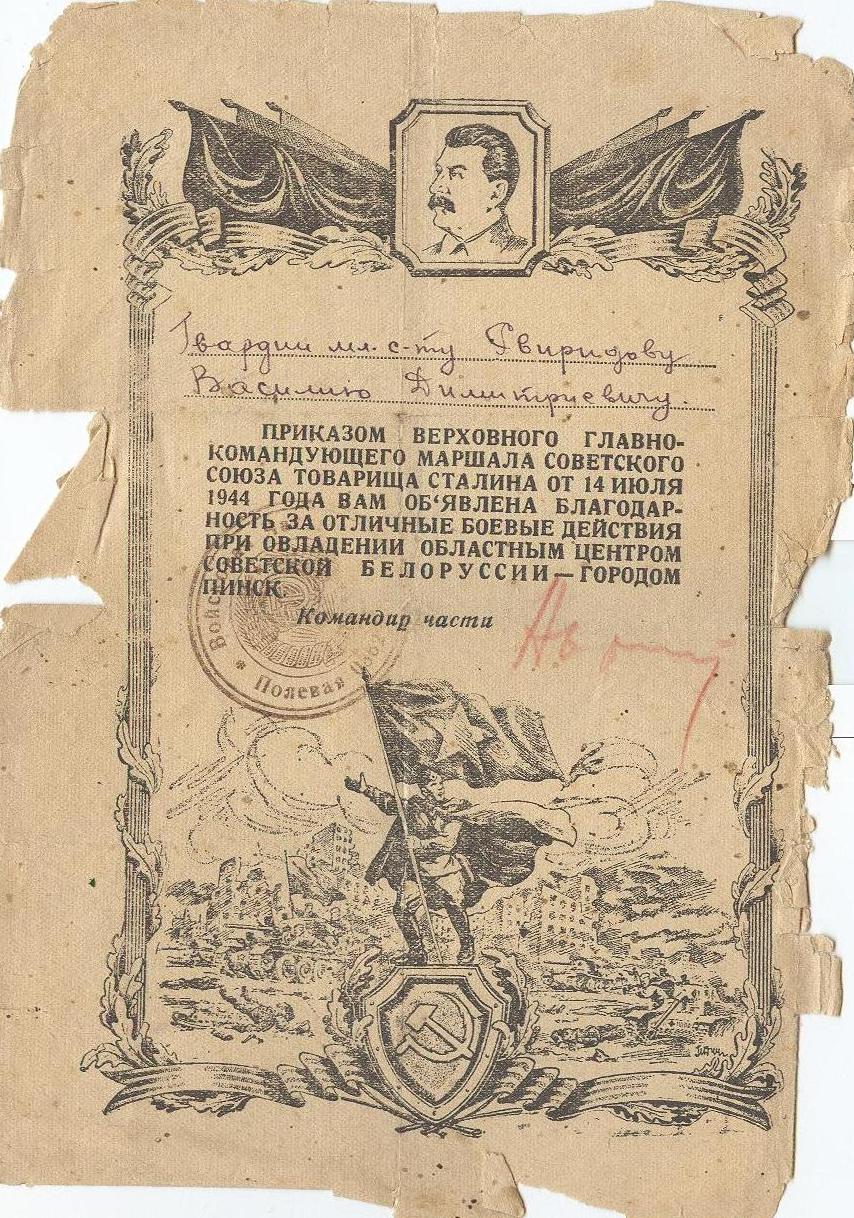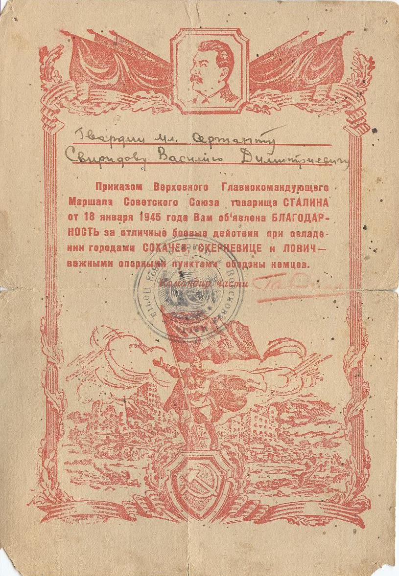«Наградить медалью «За отвагу» наводчика орудия 1-й батареи гвардии ефрейтора Свиридова Василия Дмитриевича за то, что он в бою 13 января 1944 г. в районе города Калинковичи своим орудием прямой наводкой уничтожил 3 пулемета, которые препятствовали продвижению нашей пехоты вперед. После продвижения нашей пехоты тов. Свиридов на руках, не отставая от пехоты, катил орудие в боевых порядках, обеспечивая защиту достигнутого рубежа на случай контратаки противника» (наградной лист от 23.01.1944 г.).