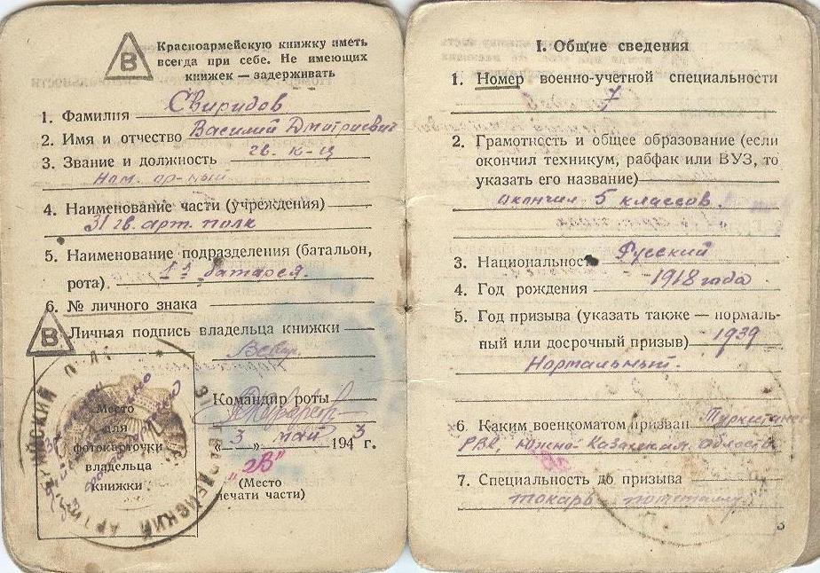 Василий Дмитриевич Свиридов родился 7 января 1918 года в селе Сидоровка Сергиевского. Учился в Сидоровской семилетней школе, окончил 5 классов. В 13 лет уехал к брату Порфирию, который был офицером кавалерии в г. Кушка (ныне г. Серхетабад, Туркменистан), где и воспитывался дальше, работал токарем. Оттуда же был призван в армию Туркестанским РВК Южно-Казахстанской области в 1938 г.