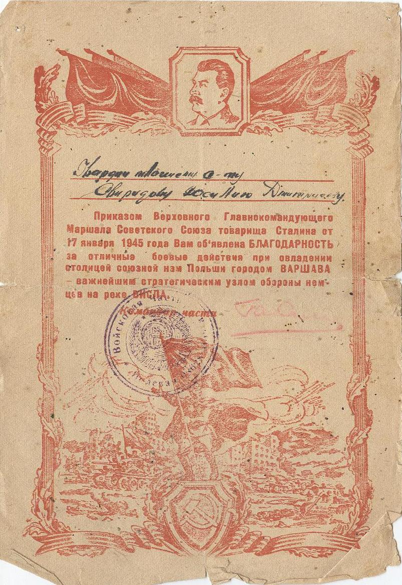 «В бою 10 июля 1944 г. в районе Хойно (Брестская область) орудием с прямой наводки разбил ДЗОТ противника и подавил огонь двух пулеметов, находящихся в ДЗОТах. Участвовал в отражении 3 контратак немецкой пехоты, при этом было убито до 15 гитлеровцев. Подбил 1 бронетранспортер. 11 июля своим огнем сопровождал пехоту по овладению деревней Хойно, встречавшиеся огневые точки им уничтожались – 1 миномет и 1 пулемет с прислугой. Достоин награды – ордена Красной Звезды» (наградной лист от 14.07.1944 г.).
