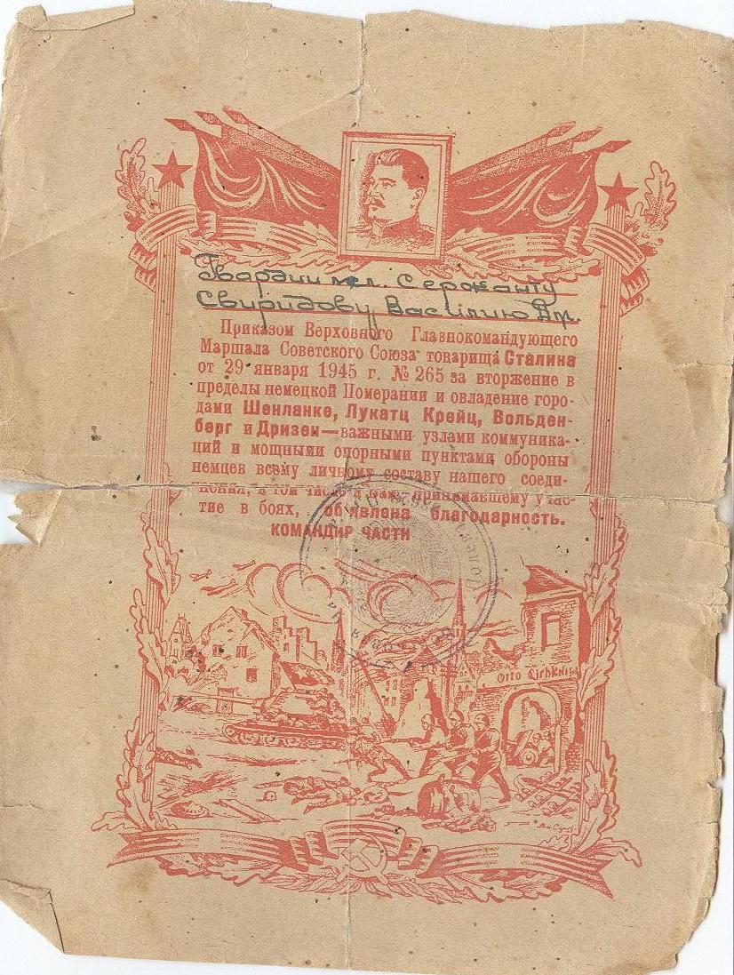 «В бою 11 февраля 1945 г. в районе деревни Гламбек (Германия), находясь на открытой огневой по-зиции, на его орудие шло 5 танков и 4 бронетранспортера противника. Во время неравного боя один за другим загорались танки противника. Когда вышли специальные снаряды, он начал отражать ата-ку осколочными. Прямым попаданием вражеского снаряда его орудие было разбито. Сам лично и весь его расчет взялись за отражение танковой атаки при помощи личного оружия, гранат и ручного пулемета. В неравном бою его орудие подожгло 2 средних танка и 1 бронетранспортер, а также уничтожило до 40 немецких солдат и офицеров. За личную отвагу, проявленную в неравном бою и умелое ведение артогня с прямой наводки по танкам достоин награды – ордена Красного Знамени» (наградной лист от 16.02.1945 г., награжден орденом Отечественной войны I степени).