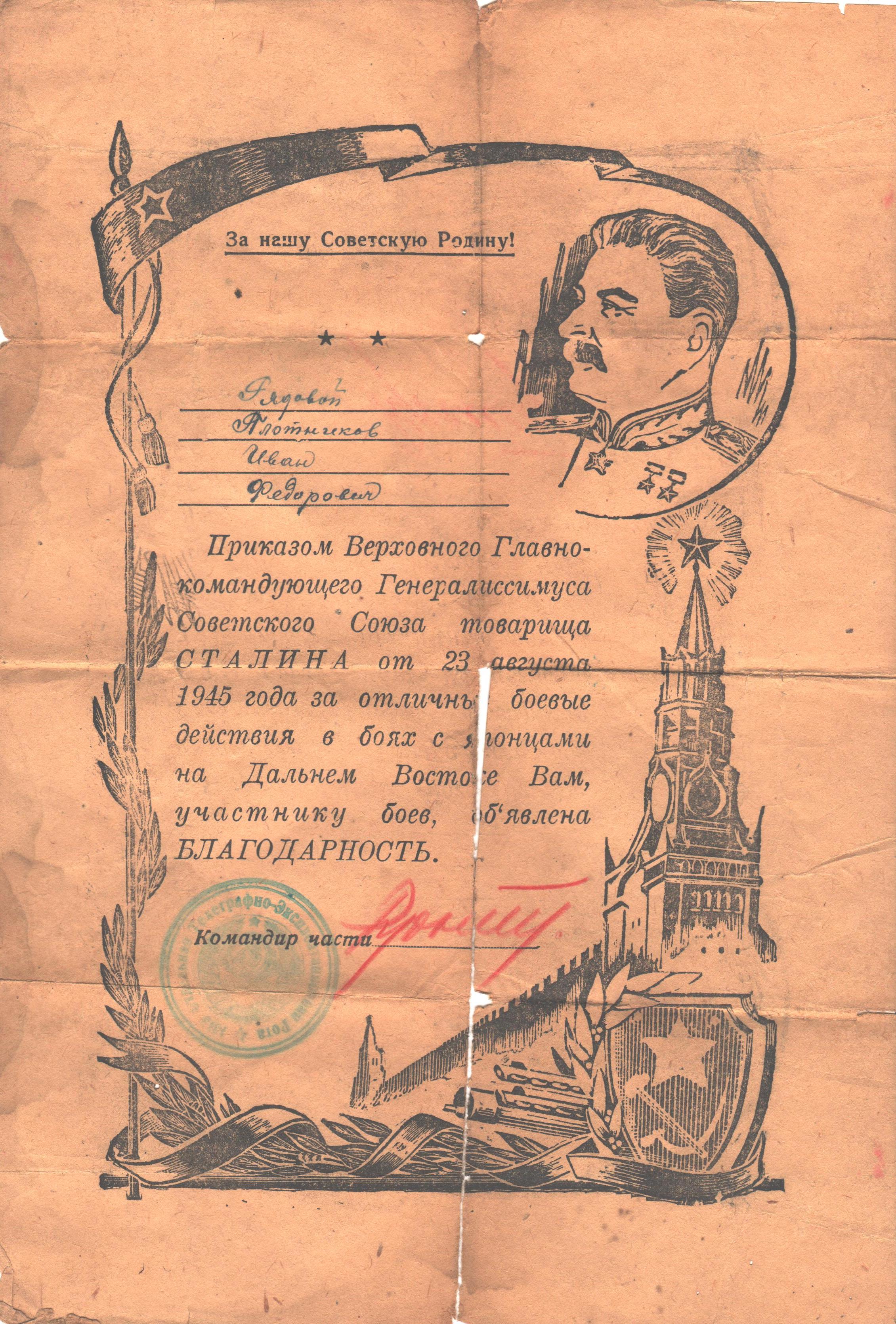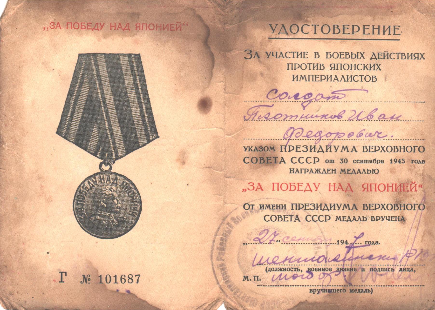 10 августа 1946 г. вернулся в родное село. Работал в колхозе. Иван Федорович был награжден медалью «За победу над Японией», юбилейными медалями.