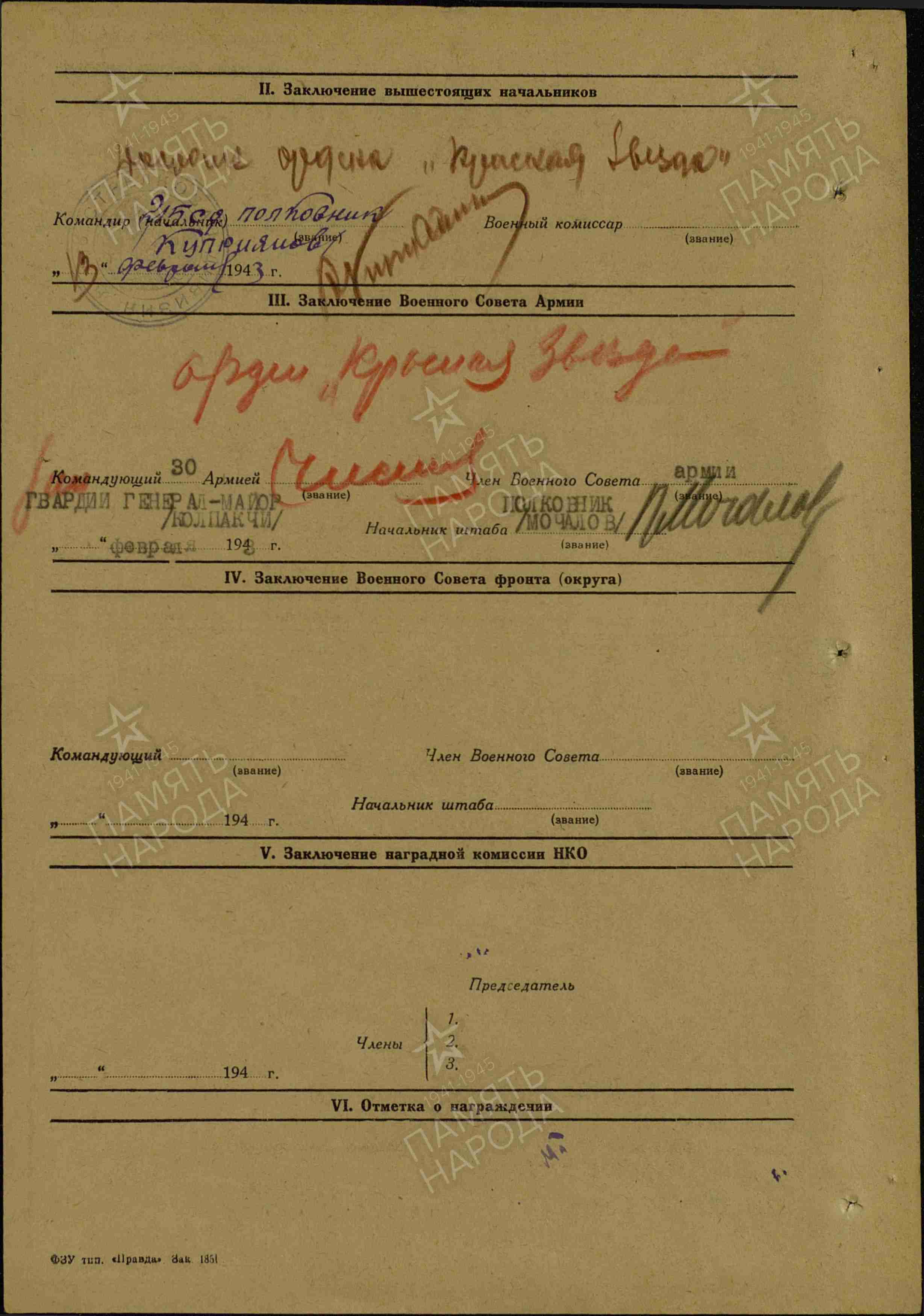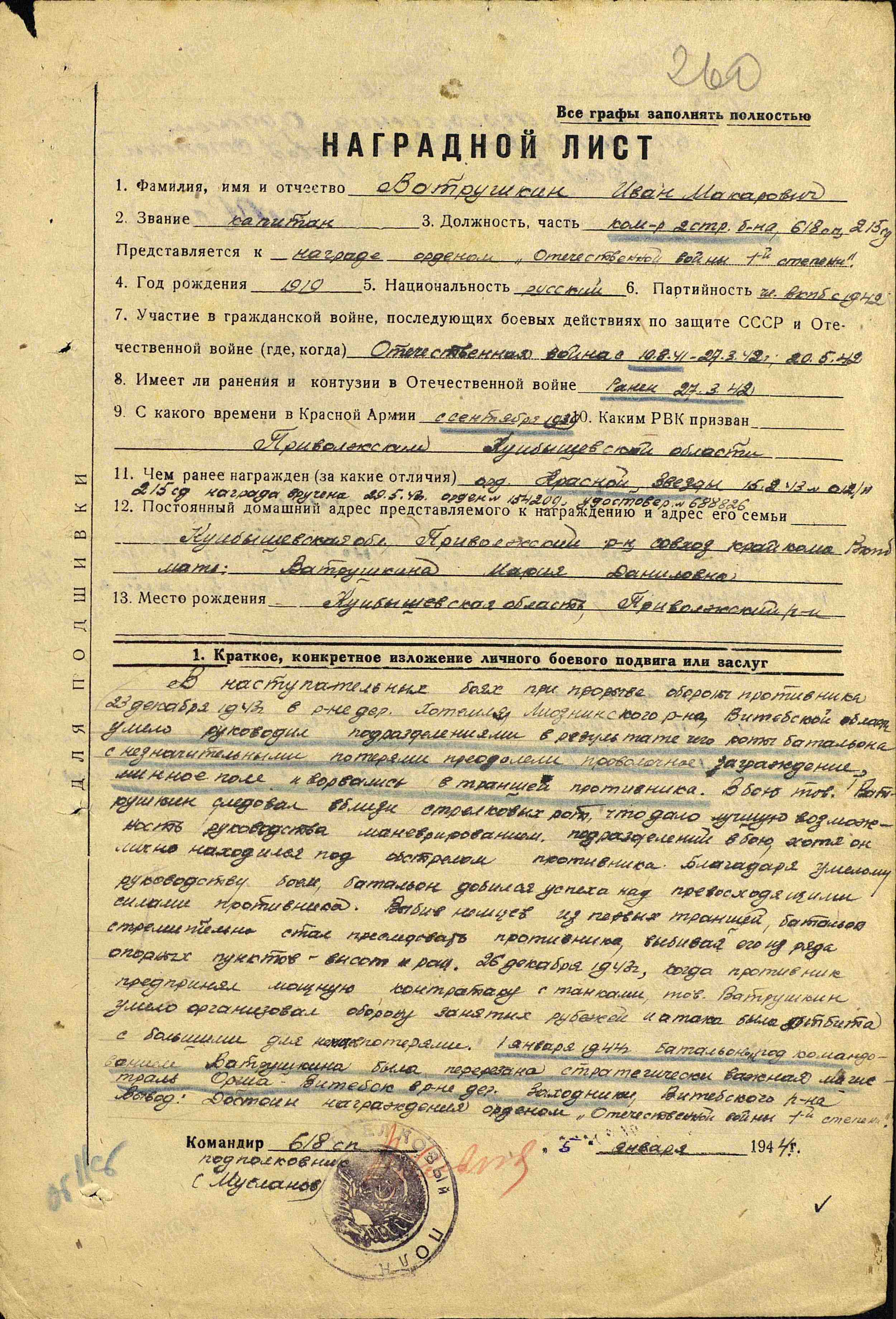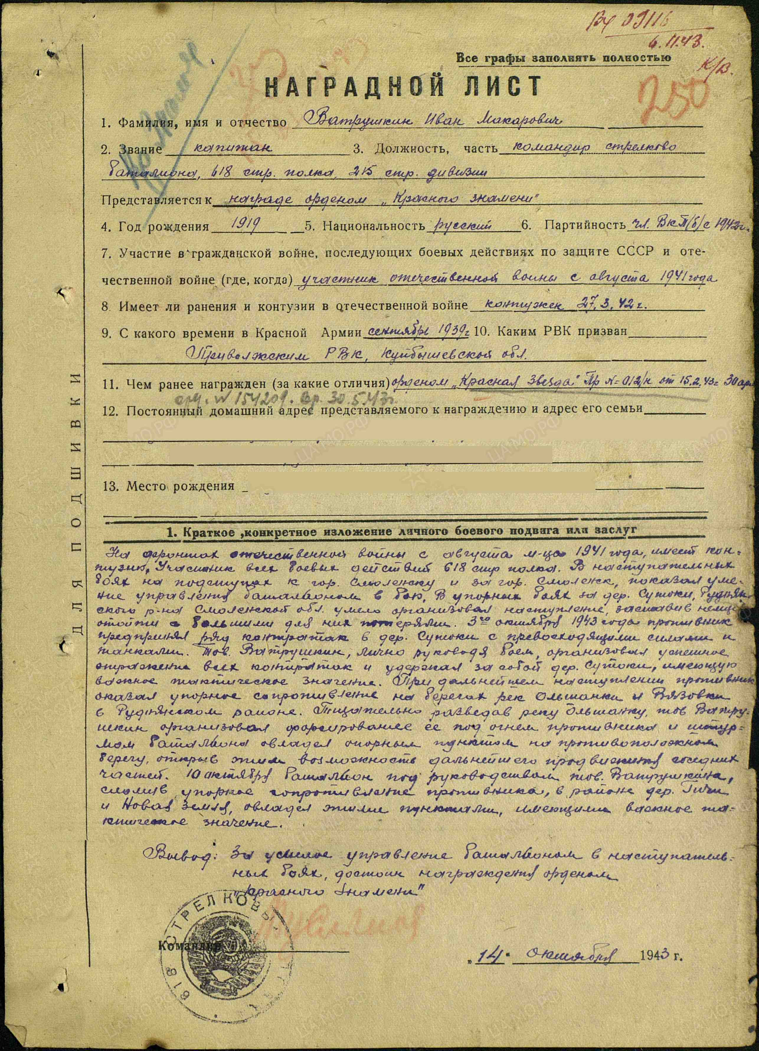Информация из Наградных листов: Участник боев с немецкими захватчиками с 10 октября 1941 г. С мая 1942 г. находится в 618-м стрелковом полку, сначала работая командиром роты, а с 19 сентября 1942 г. командиром батальона. Показал себя смелым, волевым командиром. Во время нахождения 618-го стрелкового полка в обороне на окраине г. Ржев неоднократно отражал контратаки противника своим подразделением. Наградить орденом Красной Звезды (наградной лист от 12.02.1943 г.). На фронтах Отечественной войны с августа 1941 г. Имеет контузию. Участник всех военных действий 618-го стрелкового полка. В наступательных боях на подступах к г. Смоленск показал умение управлять батальоном в бою. В упорных боях за д. Сутоки Руднянского района Смоленской области умело организовал наступление, заставив немцев отойти с большими для них потерями. 3 октября 1943 г. противник предпринял ряд контратак в д. Сутоки с превосходящими силами и танками. Тов. Ватрушкин, лично руководя боем, организовал успешное отражение всех контратак и удержал за собой деревню Сутоки, имеющую важное стратегическое значение. При дальнейшем наступлении противник оказал упорное сопротивление на берегах рек Ольшанки и Вязовки в Руднянском районе. Тщательно разведав реку Ольшанку, тов. Ватрушкин организовал форсирование реки под огнём противника, и батальон штурмом овладел опорным пунктом на противоположном берегу, открыв этим возможность дальнейшего продвижения соседних частей. 10 октября батальон под руководством тов. Ватрушкина, сломив упорное сопротивление противника в районе деревень Гичи и Новая Земля, овладел этими пунктами, имеющими важное тактическое значение. За умелое управление батальоном в наступательных боях достоин награждения орденом Красного Знамени (наградной лист от 14.10.1943 г.).