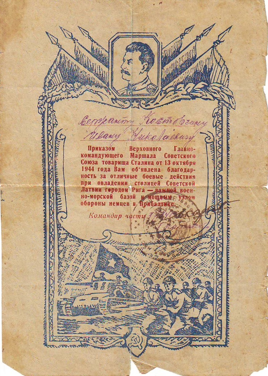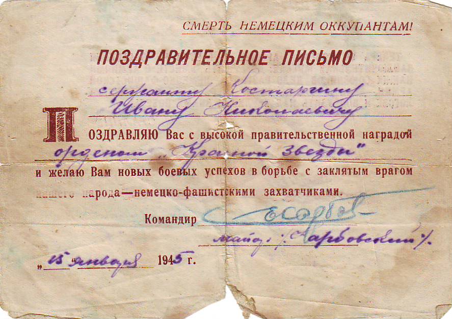 Иван Николаевич был награжден орденом Славы III степени, орденом Красной Звезды, медалями «За боевые заслуги», «За Победу над Германией в Великой Отечественной войне 1941–1945 гг.».