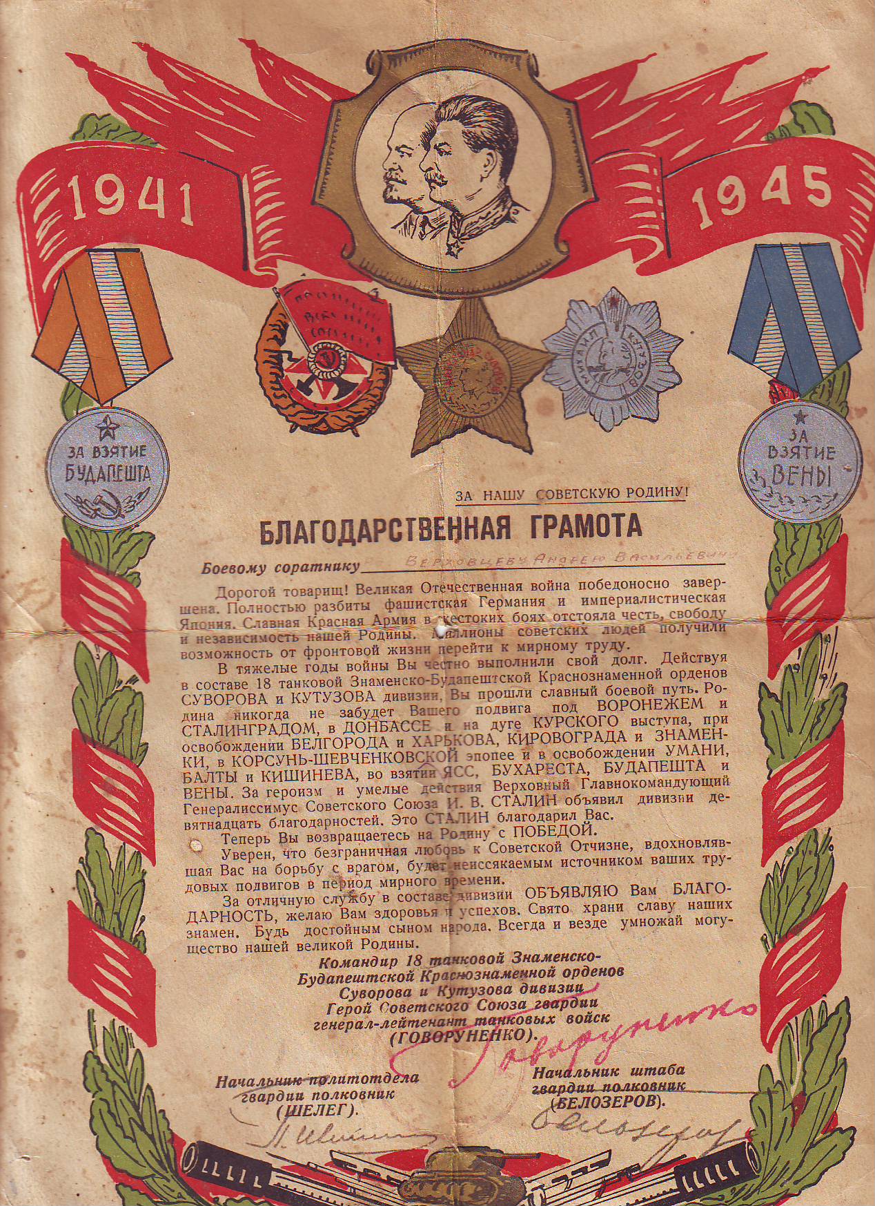 Андрей Васильевич был награжден девятнадцатью благодарностями за героизм и умелые действия от И.В. Сталина.