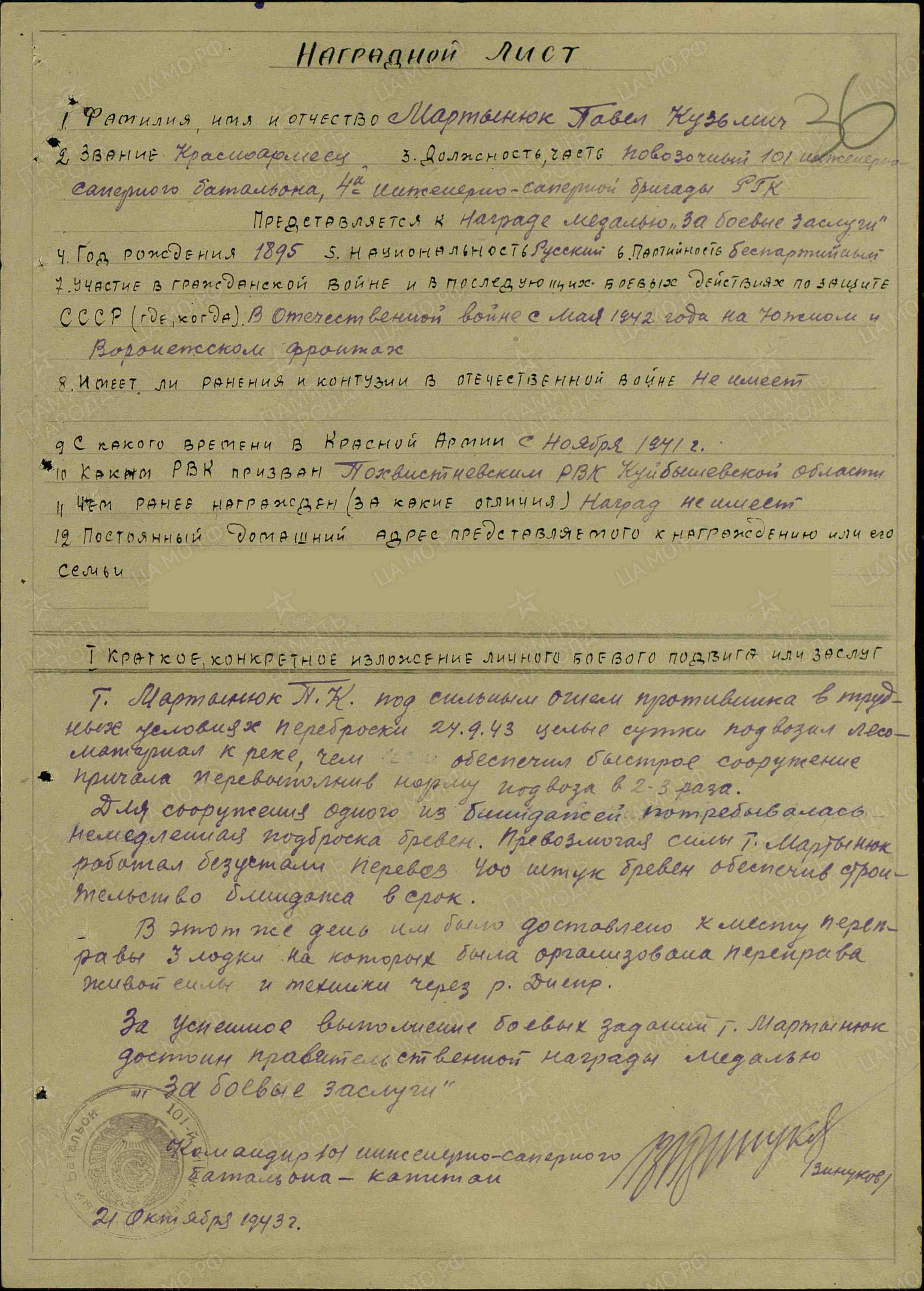 Тов. Мартынюк П.К. под сильным огнем противника в трудных условиях переброски 24 сентября 1943 г. целые сутки подвозил лесоматериал к реке, чем обеспечил быстрое сооружение причала, перевыполнив норму подвоза в 2-3 раза. Для сооружения одного из блиндажей потребовалась немедленная переброска бревен. Превозмогая силы, тов. Мартынюк работал без устали, перевез 400 штук бревен, обеспечив строительство блиндажа в срок. В этот же день им было доставлено к месту переправы 3 лодки, на которых была организована переправа живой силы и техники через р. Днепр. За успешное выполнение боевых заданий тов. Мартынюк достоин правительственной награды - медали "За боевые заслуги" (наградной лист от 21.10.1943 г.).