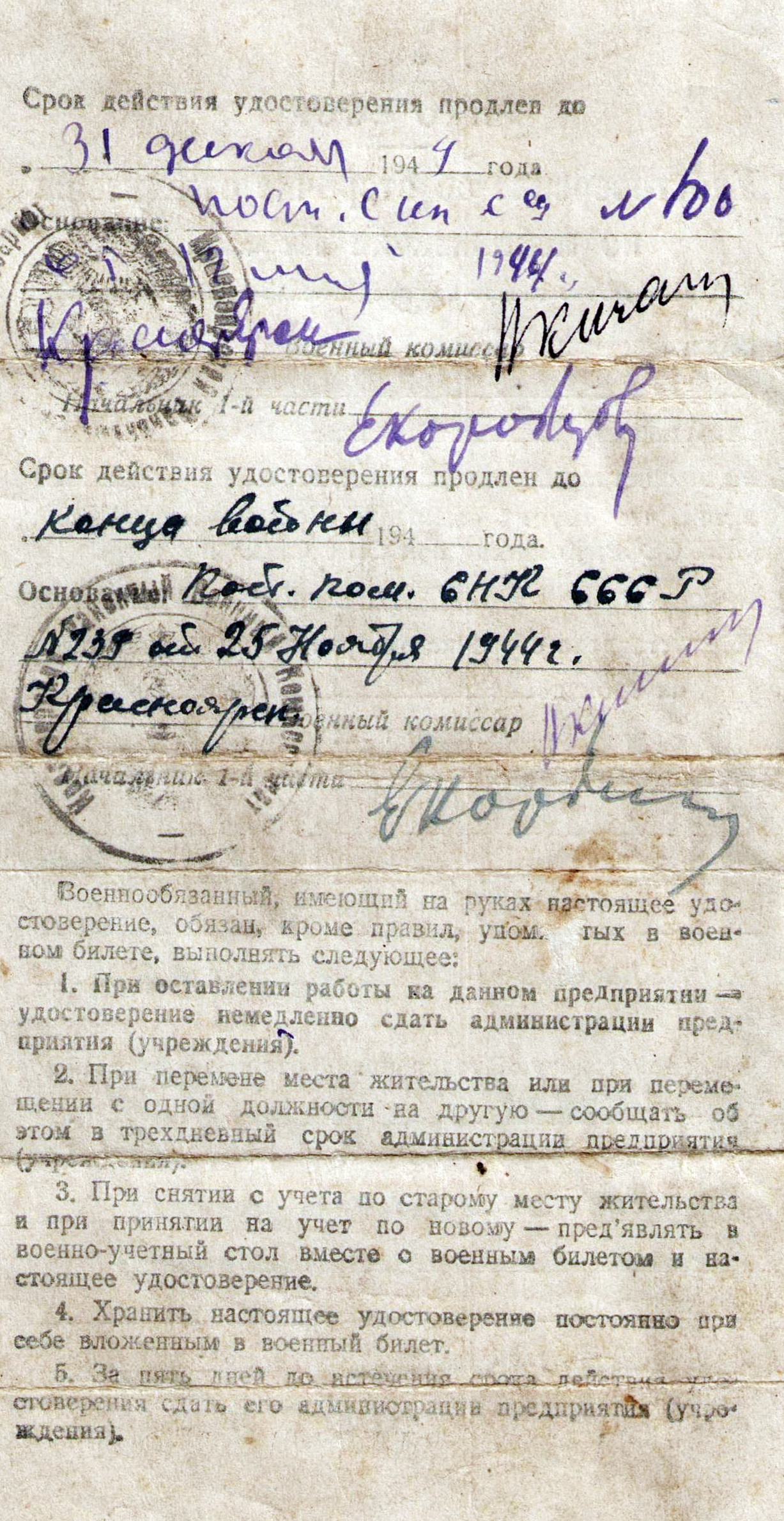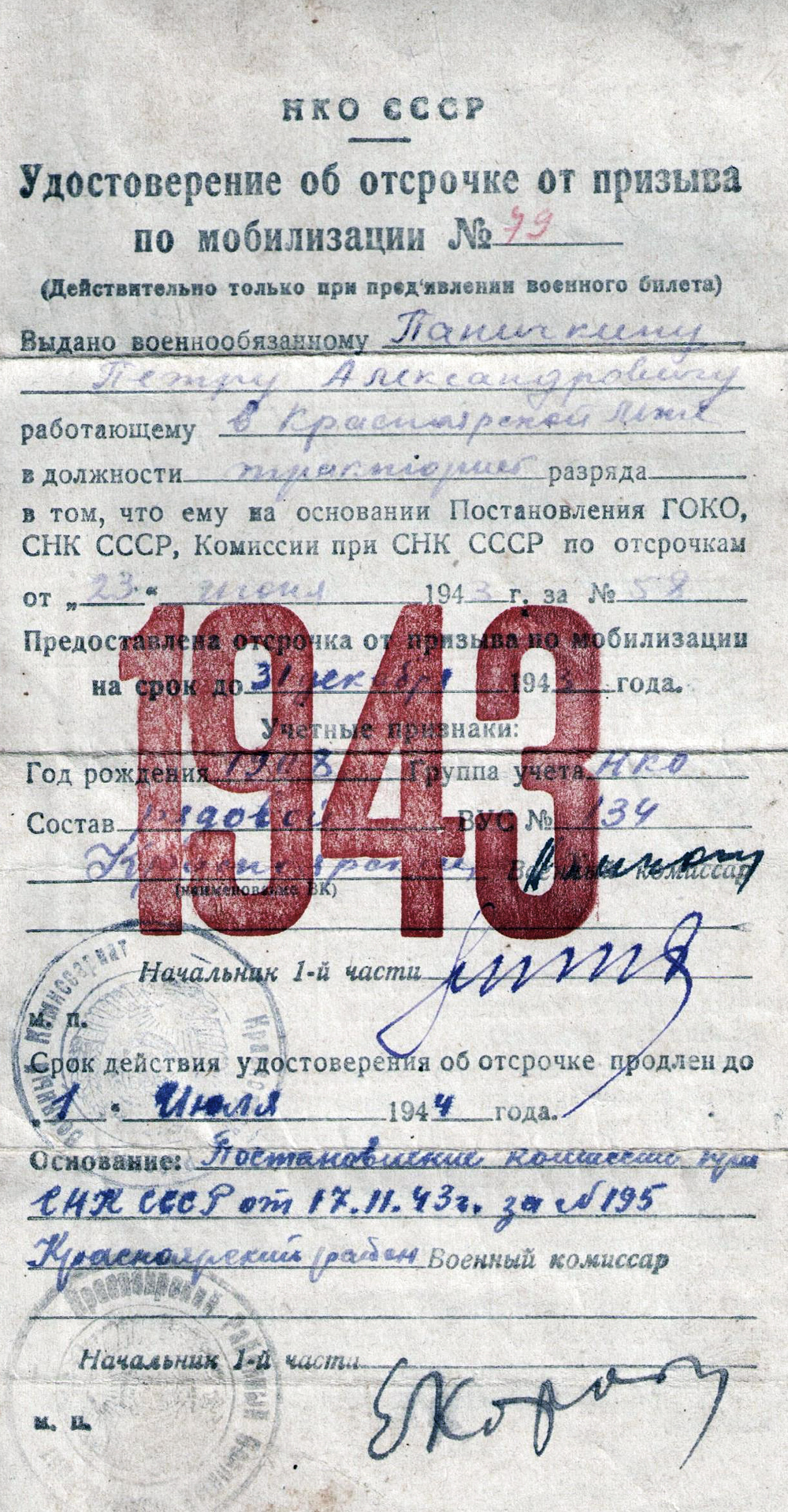 Труженик тыла. В годы Великой Отечественной войны работал трактористом в Красноярской МТС. В 1944 г. за свой труд был награжден Почетной грамотой Райкома ВКП(б).