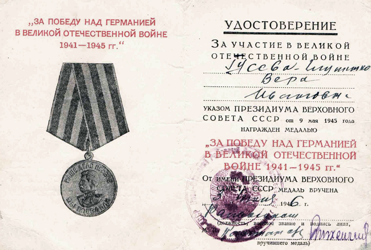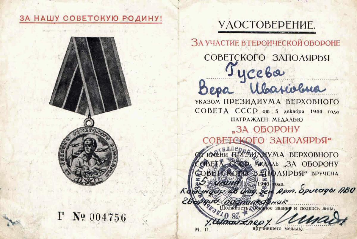 Вера Ивановна была награждена медалями «За оборону Советского Заполярья», «За Победу над Германией в Великой Отечественной войне 1941–1945 гг.», орденом Отечественной войны II степени.