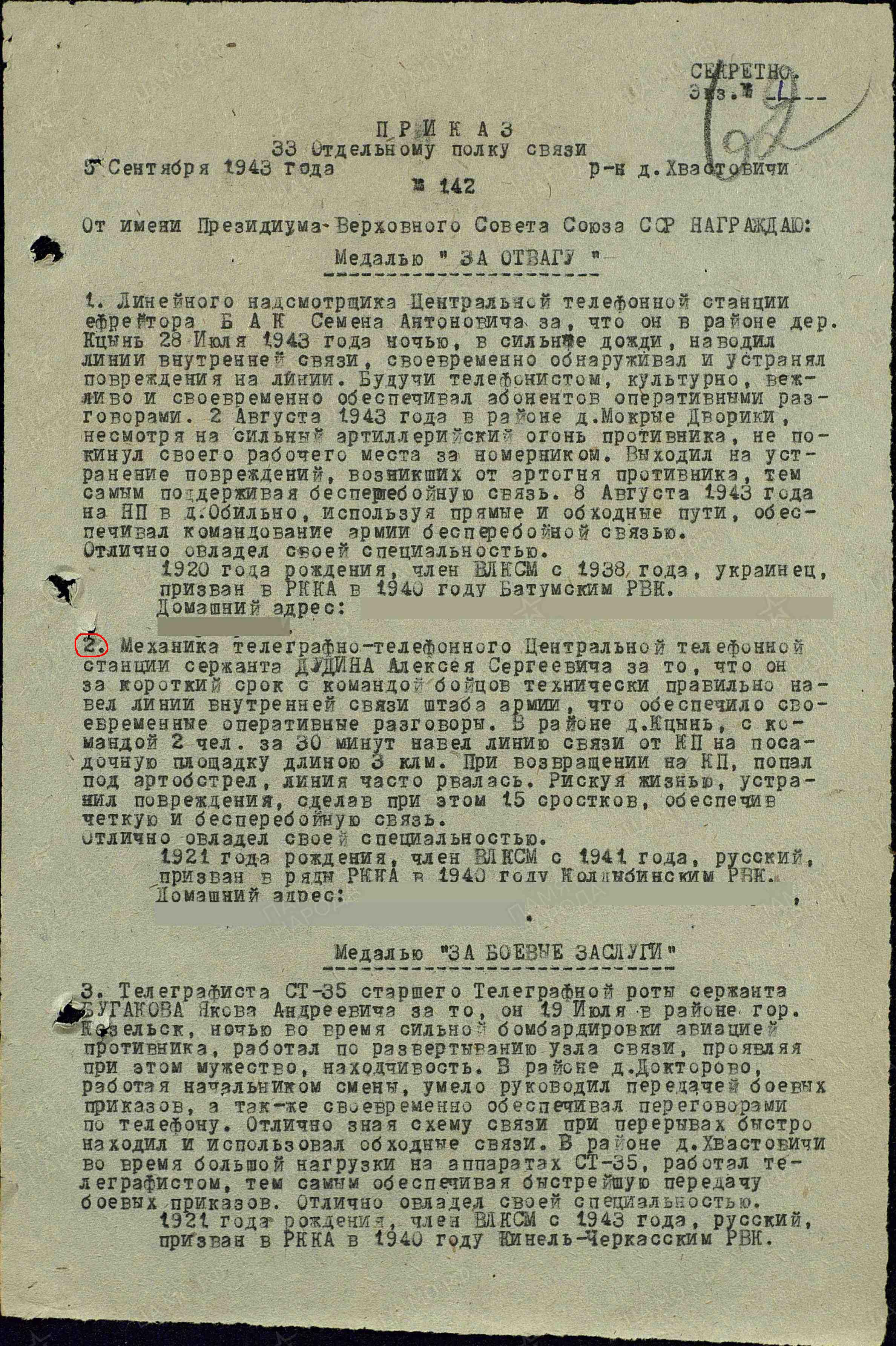 Наградить медалью «За отвагу» телеграфно-телефонного механика центральной телефонной станции сержанта Дудина Алексея Сергеевича за то, что он за короткий срок с командой бойцов технически правильно навел линии внутренней связи штаба армии, что обеспечило своевременные оперативные разговоры. В районе д. Кцынь с командой из 2-х человек за 30 минут навел линию связи от командного пункта на посадочную площадку длиной 3 км. При возвращении на командный пункт попал под артобстрел, линия часто рвалась. Рискуя жизнью, устранил повреждения, сделав при этом 15 сростков, обеспечив четкую и бесперебойную связь. Отлично овладел своей специальностью (наградной лист от 5.09.1943 г.).