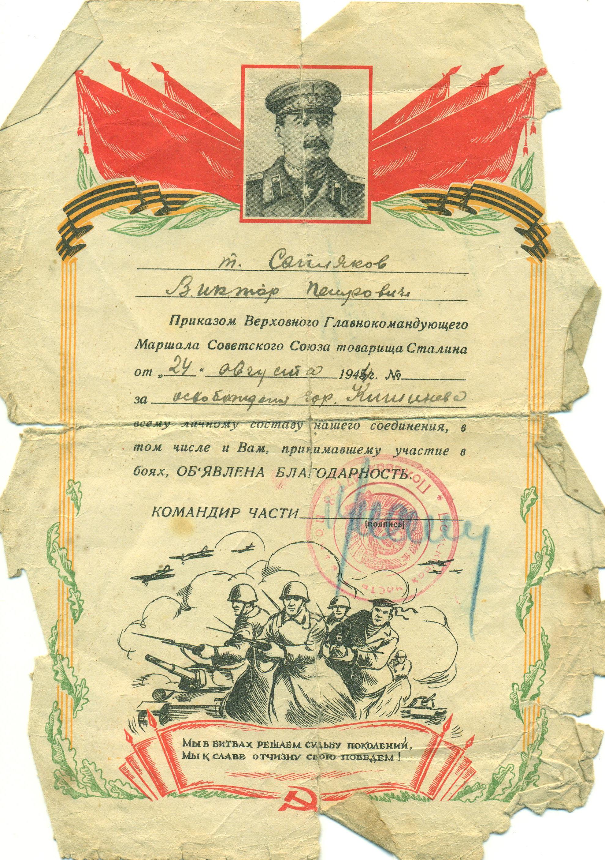 Оттуда папа ушёл на фронт, где был связистом и прошёл всю войну от Москвы до Берлина, участвовал в освобождении Украинской и Молдавской ССР, Польши от фашистских захватчиков.