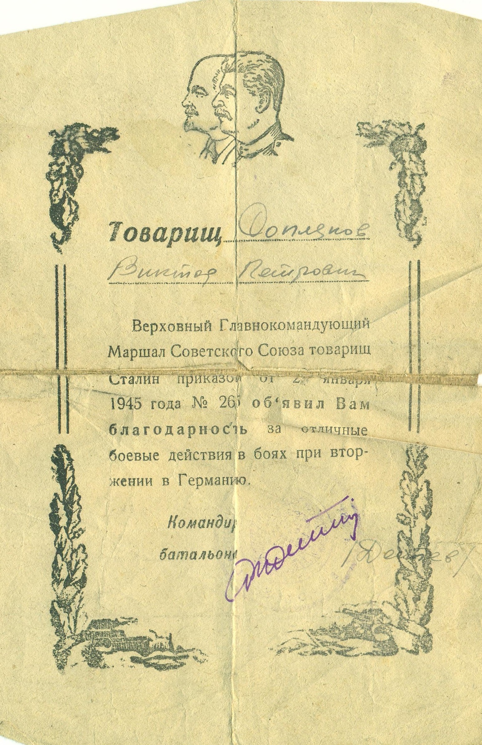 «Мой папа Виктор Петрович Сопляков родился в июне 1911 года в Самаре (впоследствии Куйбышев). Его отец работал на заводе им. Масленникова, от завода им дали дом по улице Липецкая, 8, где они все проживали: папа, бабушка, дедушка и тётя (сестра папы).