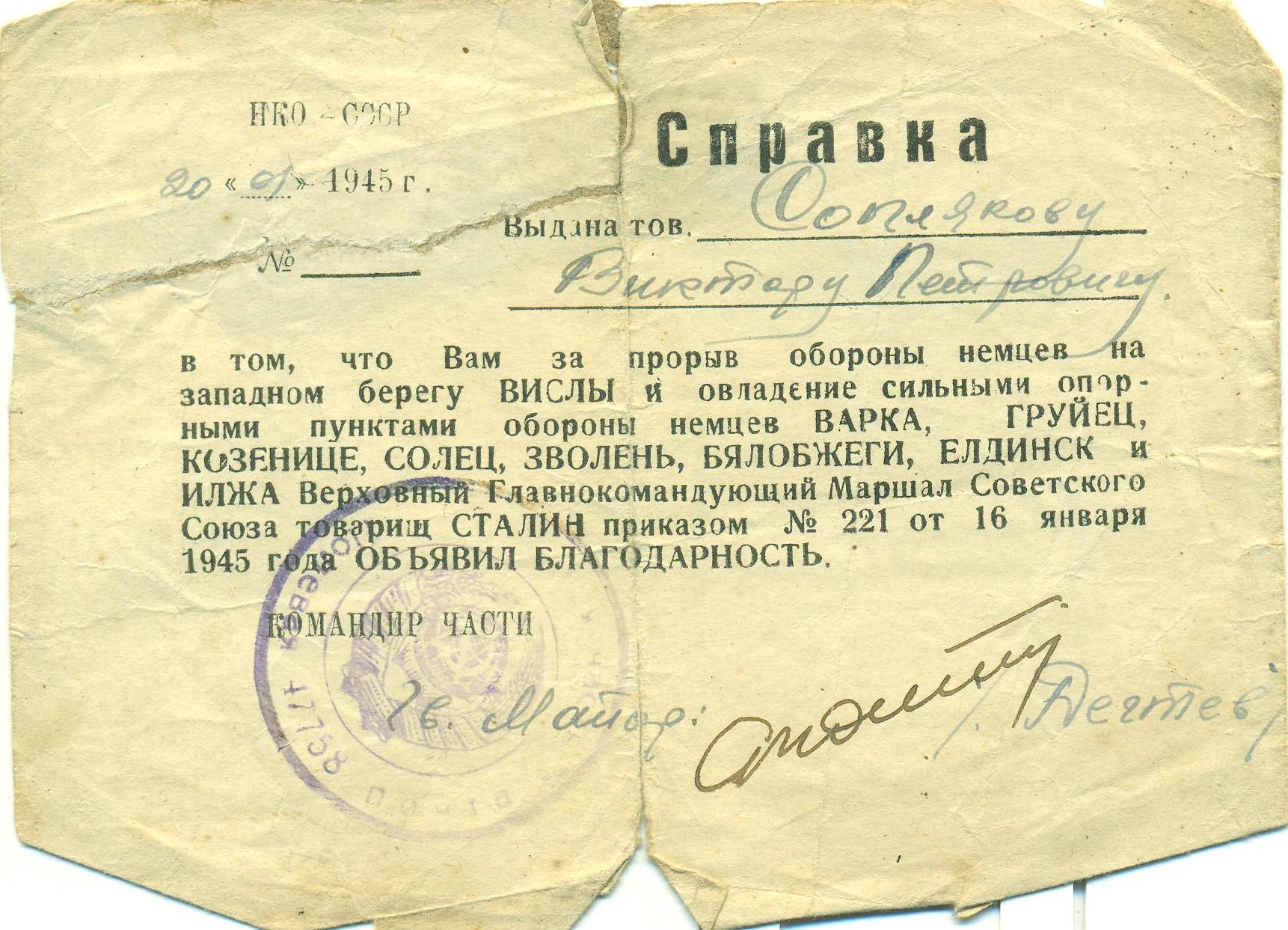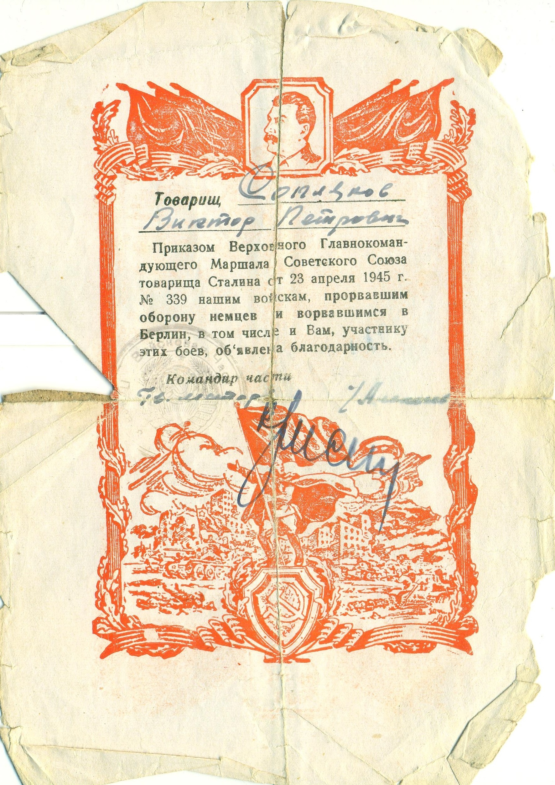 Виктор Петрович Сопляков призван на фронт Куйбышевским РВК. Служил в звании рядового в должности линейного надсмотрщика 125-го отдельного гвардейского ордена Красной Звезды батальона связи 26-го гвардейского стрелкового корпуса. Был награжден медаль «За боевые заслуги». Информация сайта podvignaroda.ru: «В боях на берлинском направлении показал себя мужественным связистом, особо отличился в Берлине 25 апреля 1945 г., когда под огнем противника и бомбежкой с воздуха своевременно обеспечил на своем участке наводку боевой линии, что дало командованию корпуса устойчивую боевую связь с наступающими частями. Достоин награждения медалью "За боевые заслуги"» (наградной лист от 19.05.1945 г.).