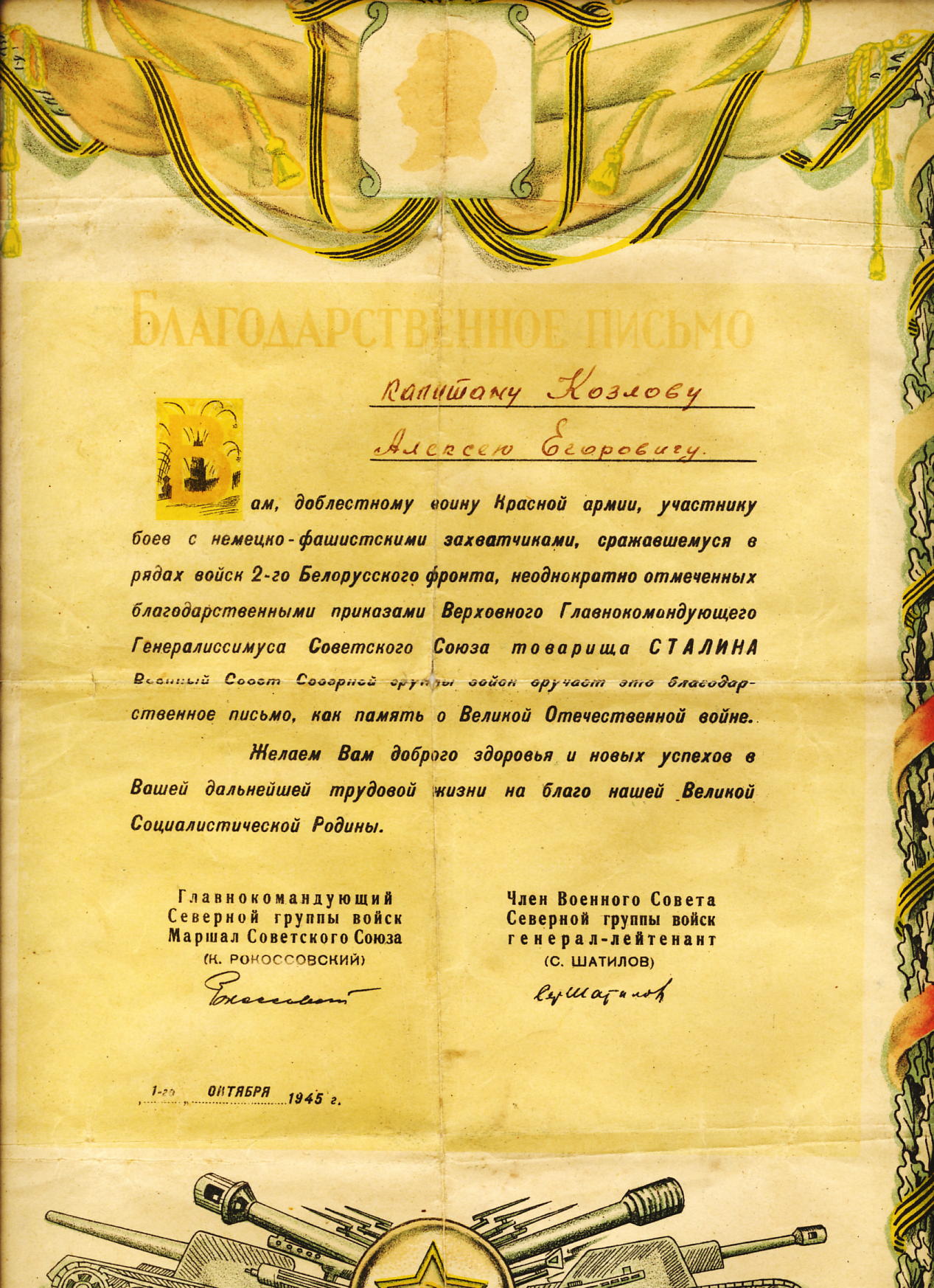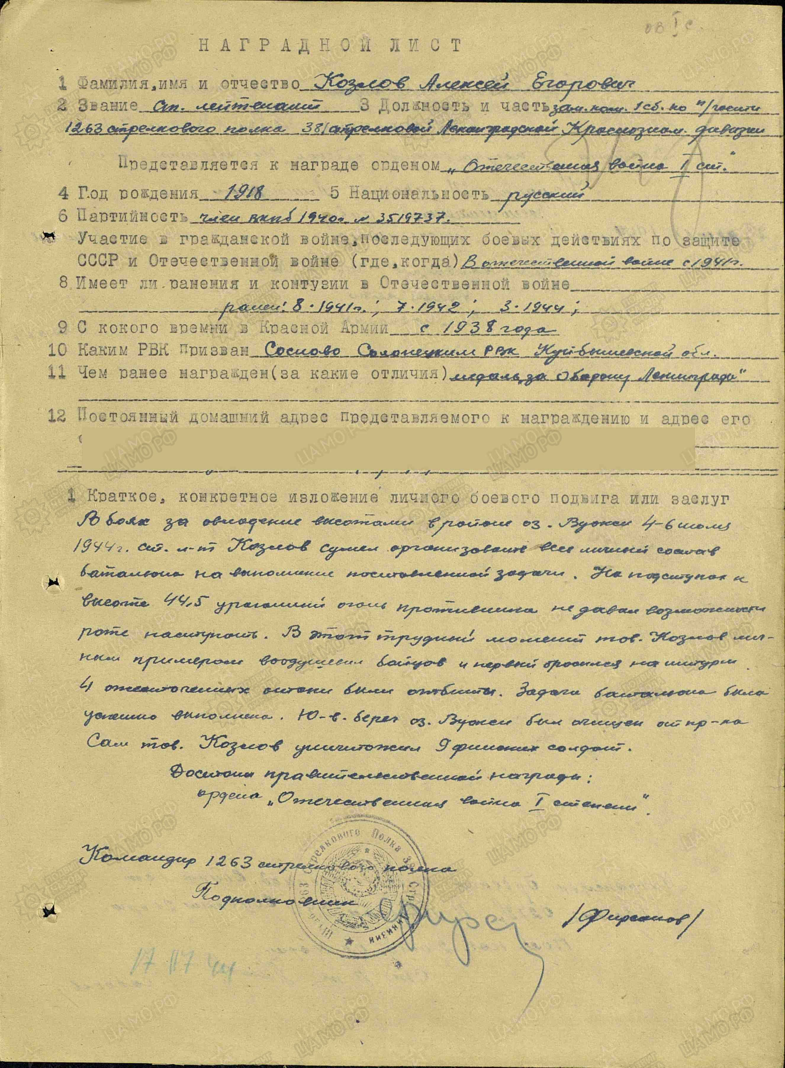Родился в 1918 г. в с. Бахилово Ставропольского района Самарской области. Закончил 6 классов, затем работал в колхозе. В ряды Красной армии призван в 1938 г. в стрелковую дивизию Забайкальского военного округа, охранял засекреченные склады с оружием и снарядами. Звание – рядовой, лаборант-артиллерист. В мае 1941 г. Алексей окончил курсы младших командиров, получил звание ефрейтор. Затем их стрелковую дивизию перевели в Москву. Козлов А.Е служил уже командиром отделения. Осенью 1941 г. должен был демобилизоваться, но… началась война. С первых месяцев войны дивизия сражалась на Северо-Западном фронте. Первое боевое крещение Алексей получил на станции Бологое Октябрьской железной дороги в декабре 1941 г. Фашисты разгромили станцию, Алексей Егорович был тяжело ранен, попал в госпиталь в Новгородской области. После лечения, в звании старшего сержанта, направлен в Ленинград. Переправлялись через Ладожское озеро под обстрелами и бомбардировками. До конца жизни со слезами на глазах вспоминал Алексей Егорович, как тонули подо льдом машины с солдатами, боеприпасами, продовольствием. Вскоре его послали в военное училище на курсы ускоренного обучения, через три месяца политруком роты в звании капитана он направлен на Ленинградский фронт в 381-ю стрелковую Краснознаменную Ленинградскую дивизию, где прослужил до снятия блокады Ленинграда с 1942 по 1944 гг. В 1944 г. - второе ранение, после госпиталя – Восточный фронт, Северная группа войск под командованием маршала К. Рокоссовского – 1263-й стрелковый Эдьбинский полк (Прибалтика, Пруссия, Польша, Германия). Победу встретил в Берлине. Алексей Егорович не отсиживался в блиндажах и окопах, постоянно был на линии огня. Его война закончилась в Милитополе в 1946 г. имеет награды: три ордена Отечественной войны, медали "За оборону Ленинграда", "За взятие Кенигсберга", "За взятие Берлина", "За отвагу". Вернулся в родное с. Бахилово, устроился работать в бригаду по перекачке нефти на Зольненскую нефтеперекачивающую станцию. Вскоре ему предложили стать председателем колхоза, но Алексей Егорович отказался, за что его чуть не исключили из партии. В 1979 г. Алексей Егорович поступил в Жигулёвский заповедник лесником. Особое внимание уделял охране леса от пожаров, самовольных вырубок, браконьерства. Умер в 2011 г.
