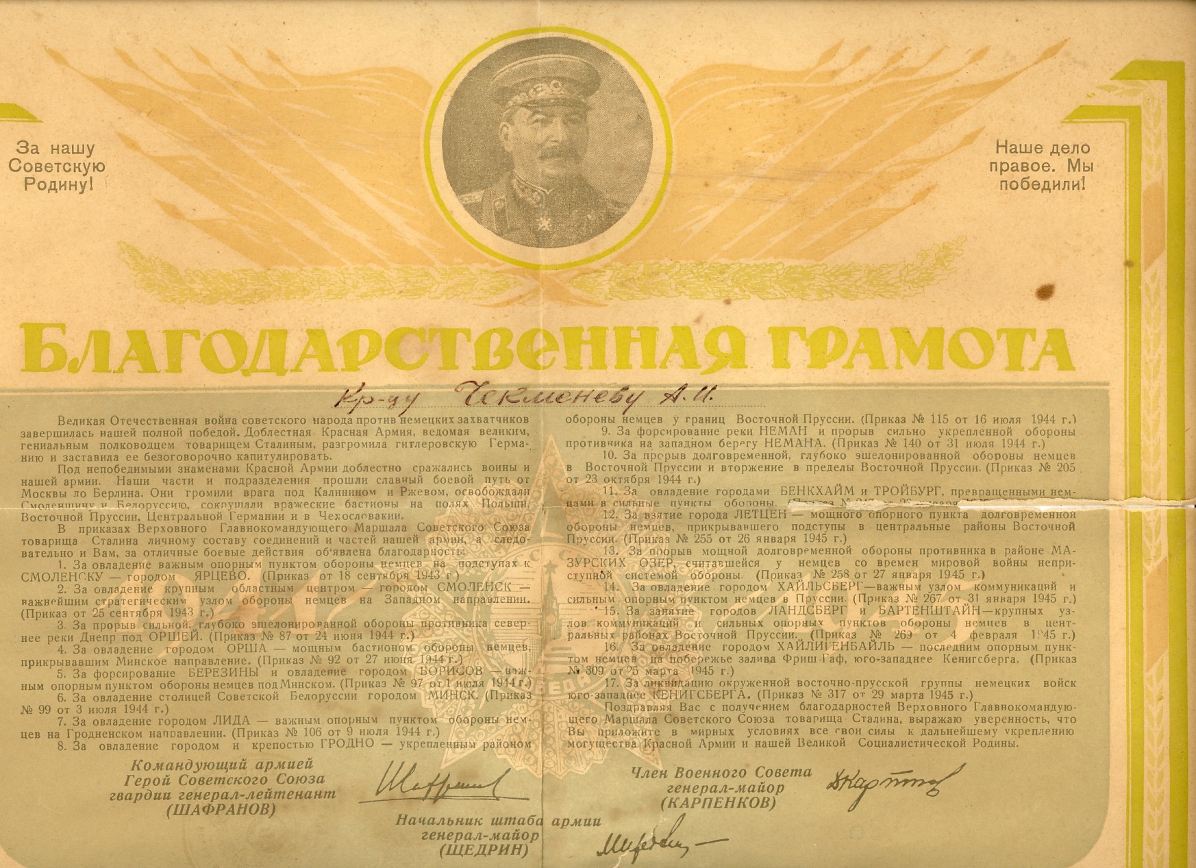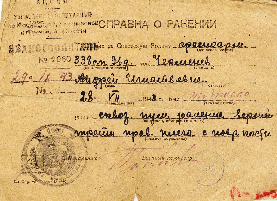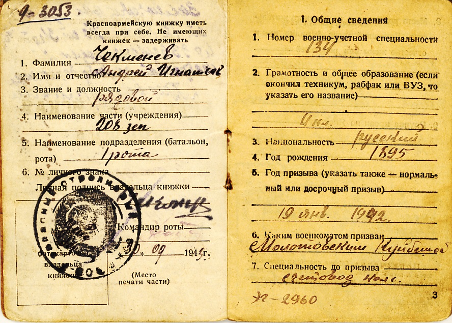 Родился в 1895 г. в с. Большая Рязань Сосново-Солонецкого (Ставропольского) района Куйбышевской области. Окончил 4 класса школы. Работал в колхозе счетоводом. 19 января 1942 г. призван на фронт Молотовским (Ставропольским) РВК Куйбышевской области. Направлен красноармейцем в 338-й стрелковый полк 96-й стрелковой дивизии. Был ранен. 28 июля 1943 г. вновь получил тяжелое сквозное пулевое ранение в плечо с повреждением кости. Лечился в эвакогоспитале №2960. После лечения в сентябре 1943 г. направлен в 208-й запасной стрелковый полк. С октября 1943 г. служил в 1-й пулеметной роте пулеметного батальона 199-го армейского запасного стрелкового полка, затем в 1-й роте 43-го армейского трофейного батальона. В январе 1944 г. он проходил врачебную военную комиссию, которая признала его годным к нестроевой службе. В мае 1944 г. признан годным к строевой службе. В декабре 1944 г. врачебная военная комиссия вновь признает Андрея Игнатьевича годным к нестроевой службе. Он возвращается на родину. Умер 16 февраля 1991 г. Награды: орден Отечественной войны II степени, медаль «За отвагу».