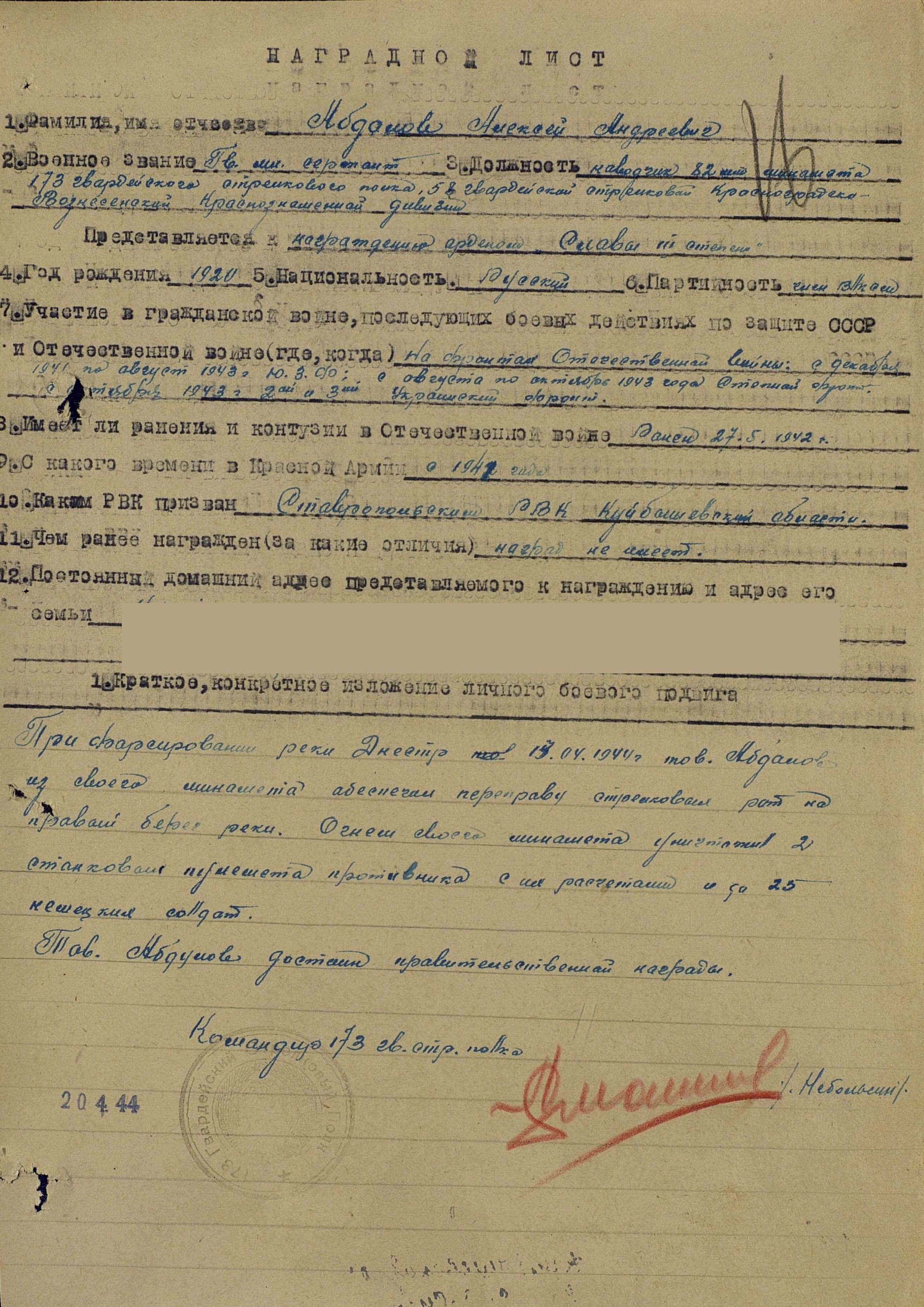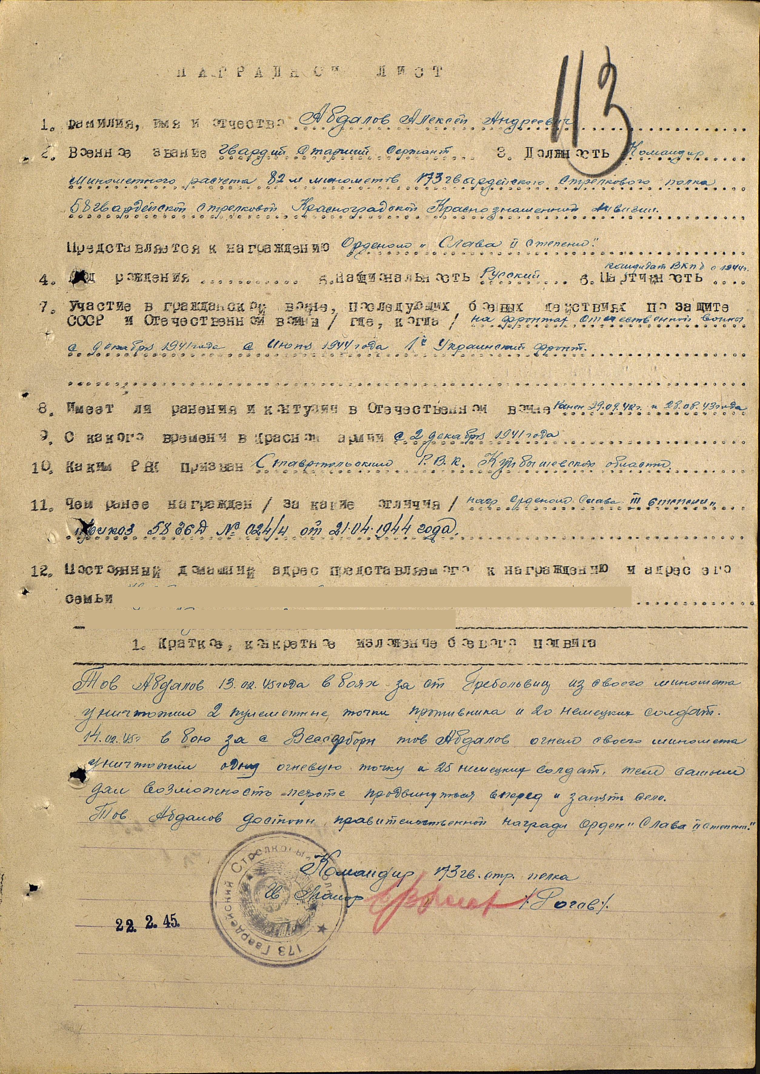Родился 30 марта 1920 г. в с. Верхний Сускан Ставропольского района Куйбышевской области в семье крестьянина. В 1934 г. окончил 4 класса школы, затем в 1939 г. - курсы счетоводов. Работал помощником счетовода в колхозе. В декабре 1941 г. Ставропольским РВК призван по мобилизации на Великую Отечественную войну. В боевых действиях принимал участие с января 1942 г. В августе 1942 г. в бою под Сталинградом был тяжело ранен. После лечения Алексей Андреевич, младший сержант, наводчик 82 мм минометного расчета, воевал на Юго-Западном фронте – участвовал в стратегических операциях по освобождению городов Украины, в отражении контратаки немцев под Харьковом, где 28 августа 1943 г. вновь был ранен. После госпиталя Алексей Андреевич вернулся в свою дивизию, которая была переименована в 58-ю гвардейскую стрелковую Красноградскую Краснознаменную дивизию, а фронт – в 3-й Украинский. Зачислен наводчиком 82 мм миномета 173-го гвардейского полка. Участвовал в Одесской наступательной операции, затем освобождал села и города Молдавии. «31 марта 1944 г. в бою на берегу р. Тишпул северо-западнее с. Березовка (Одесская обл., Украина) уничтожил 3 пулемета врага и 2 миномета с расчетами, чем способст-вовал успешному форсированию реки стрелковым подразделениям», - из наградного листа на представление к ордену Славы III степени. «При форсировании реки Днестр 13 апреля 1944 г. Абдалов обеспечил переправу стрелковым ротам на правый берег реки. Огнем своего миномета уничтожил 2 станковых пулемета противника с их расчетами и до 25 немецких солдат», - из наградного листа на представление к ордену Славы III степени (повторно). В январе 1945 г. гвардии старший сержант Алексей Андреевич назначен командиром минометного расчета 82 мм миномета 173-го гвардейского полка, воевал на территории Польши на 1-м Украинском фронте в составе 5-й гвардейской армии. «13 февраля 1945 г. в боях за ст. Гребольвиц (Польша) из своего миномета уничтожил 2 пулеметные точки противника и 20 немецких солдат. 14 февраля в бою за с. Вессфорн огнем миномета уничтожил одну огневую точку и 28 немецких солдат, тем самым дал возможность пехоте продвинуться вперед и занять село», - из наградного листа на представление к ордену Славы II степени. Алексей Андреевич с боями прошел всю Европу, участвовал в Берлинской, Пражской наступательных операциях. Демобилизовался 12 мая 1945 г. Вернулся на родину, трудился в колхозе бухгалтером. Указом Президиума Верховного Совета от 27 февраля 1958 г. Абдалов А.А. в порядке перенаграждения (один из орденов Славы III степени заменен) награжден орденом Славы I степени. В с. Верхний Сускан Ставропольского района одна из улиц носит имя кавалера трех орденов Славы Абдалова Алексея Андреевича, на здании Верхне-Сусканской школы установлена мемориальная доска. Умер 22 августа 1983 г.