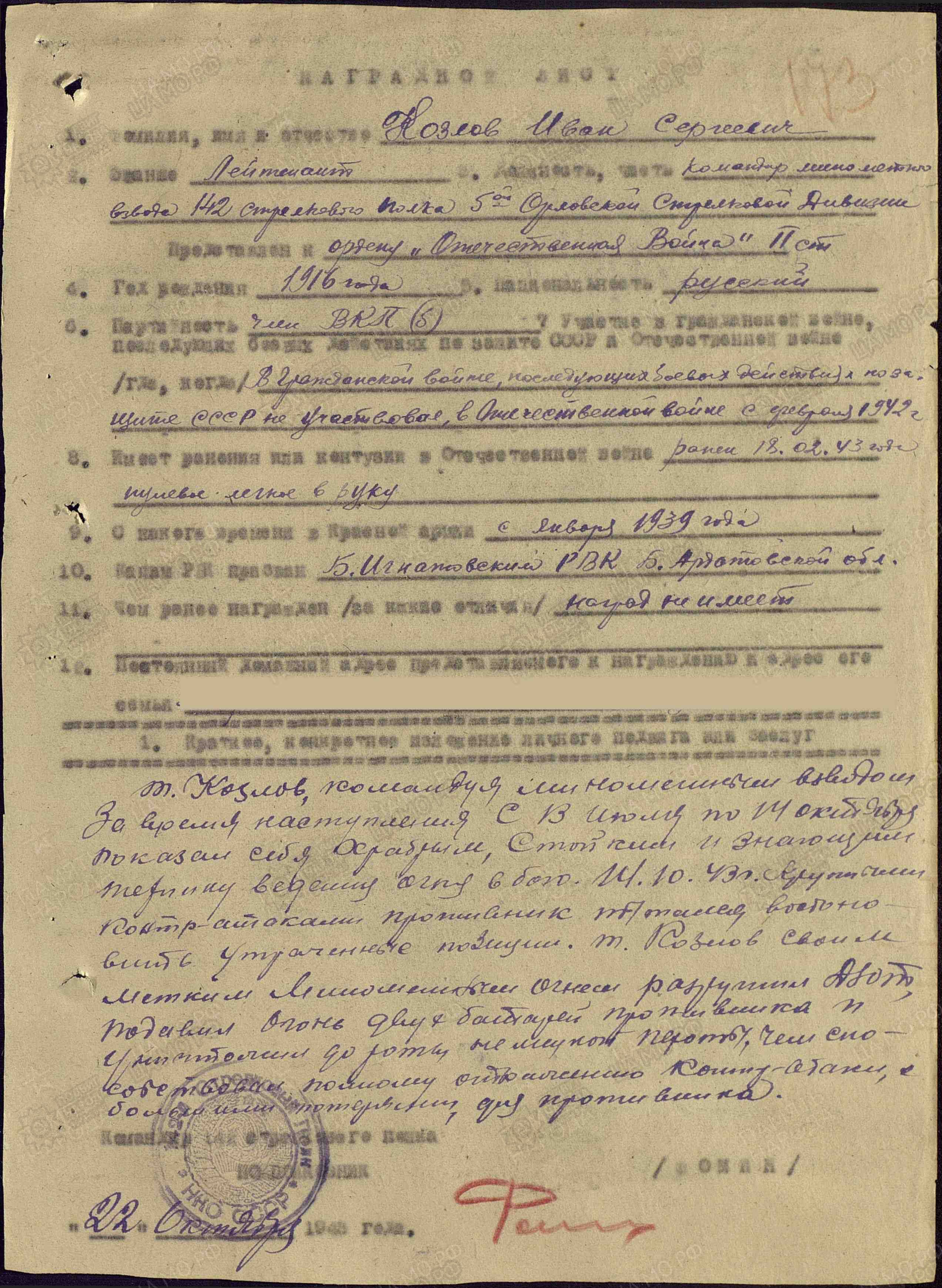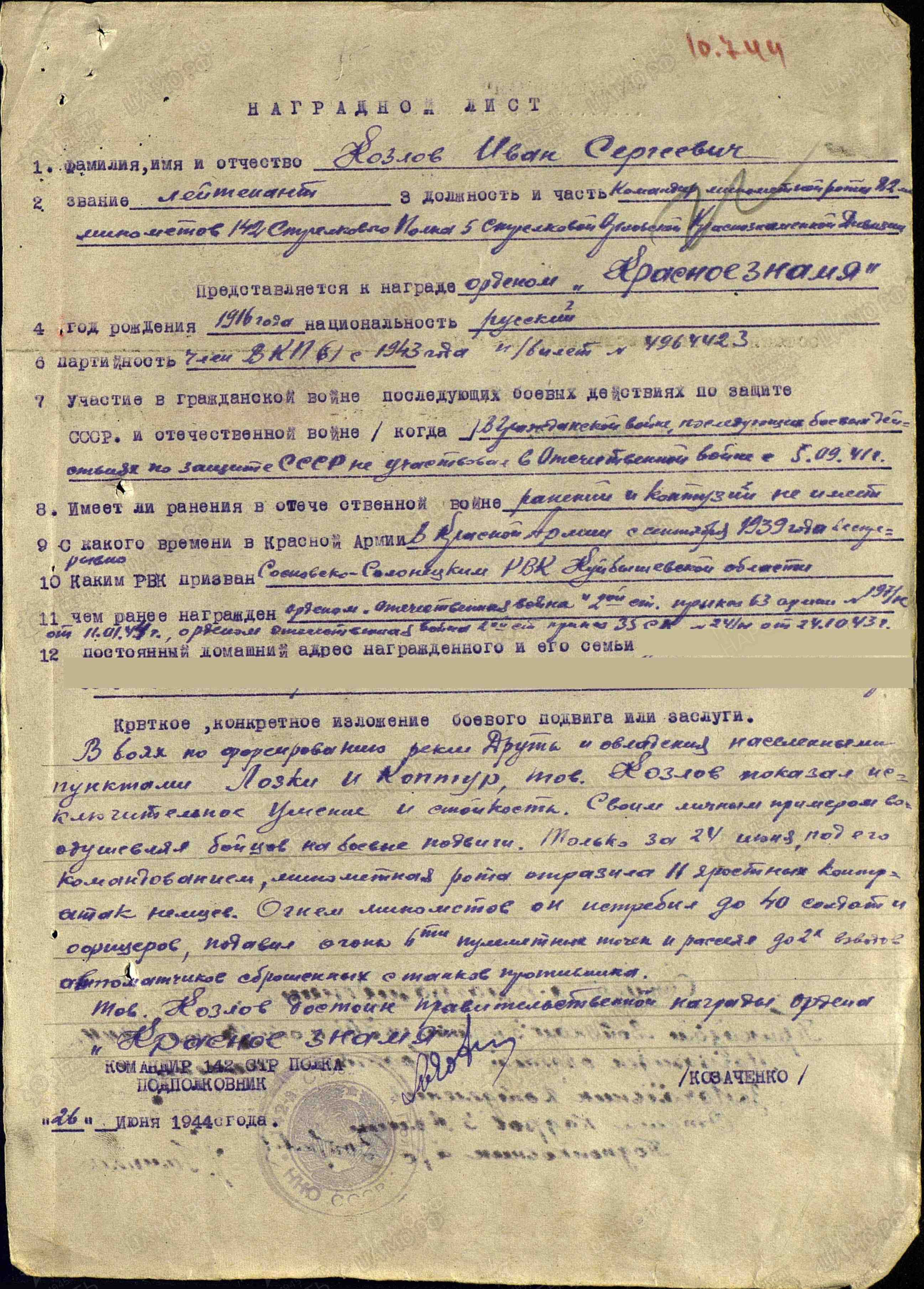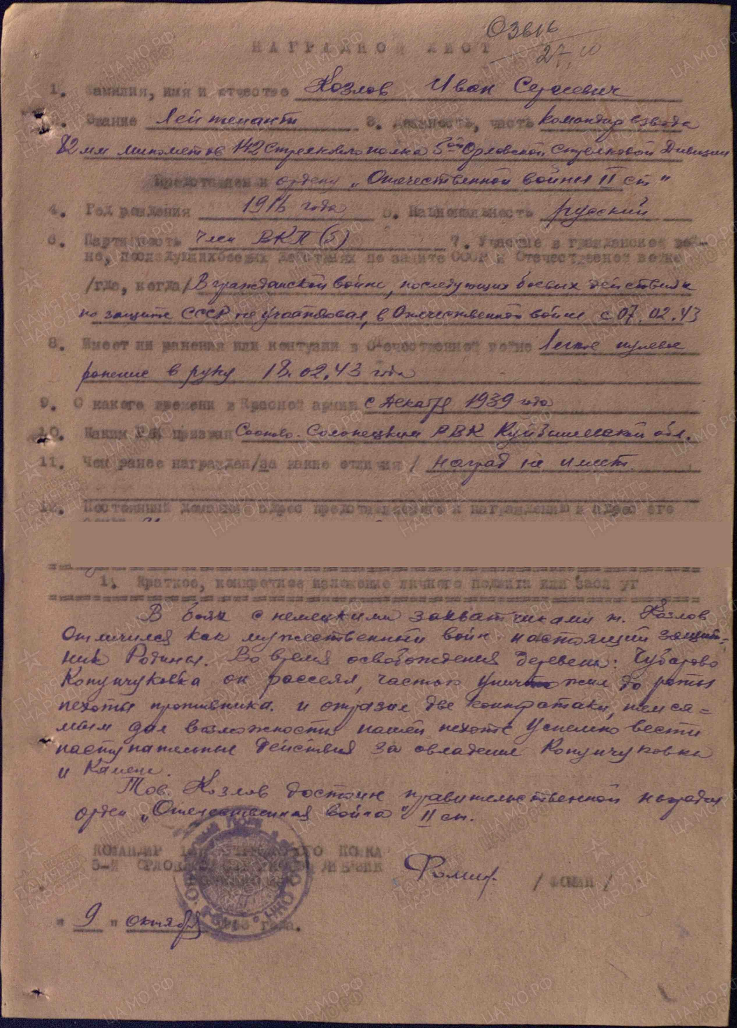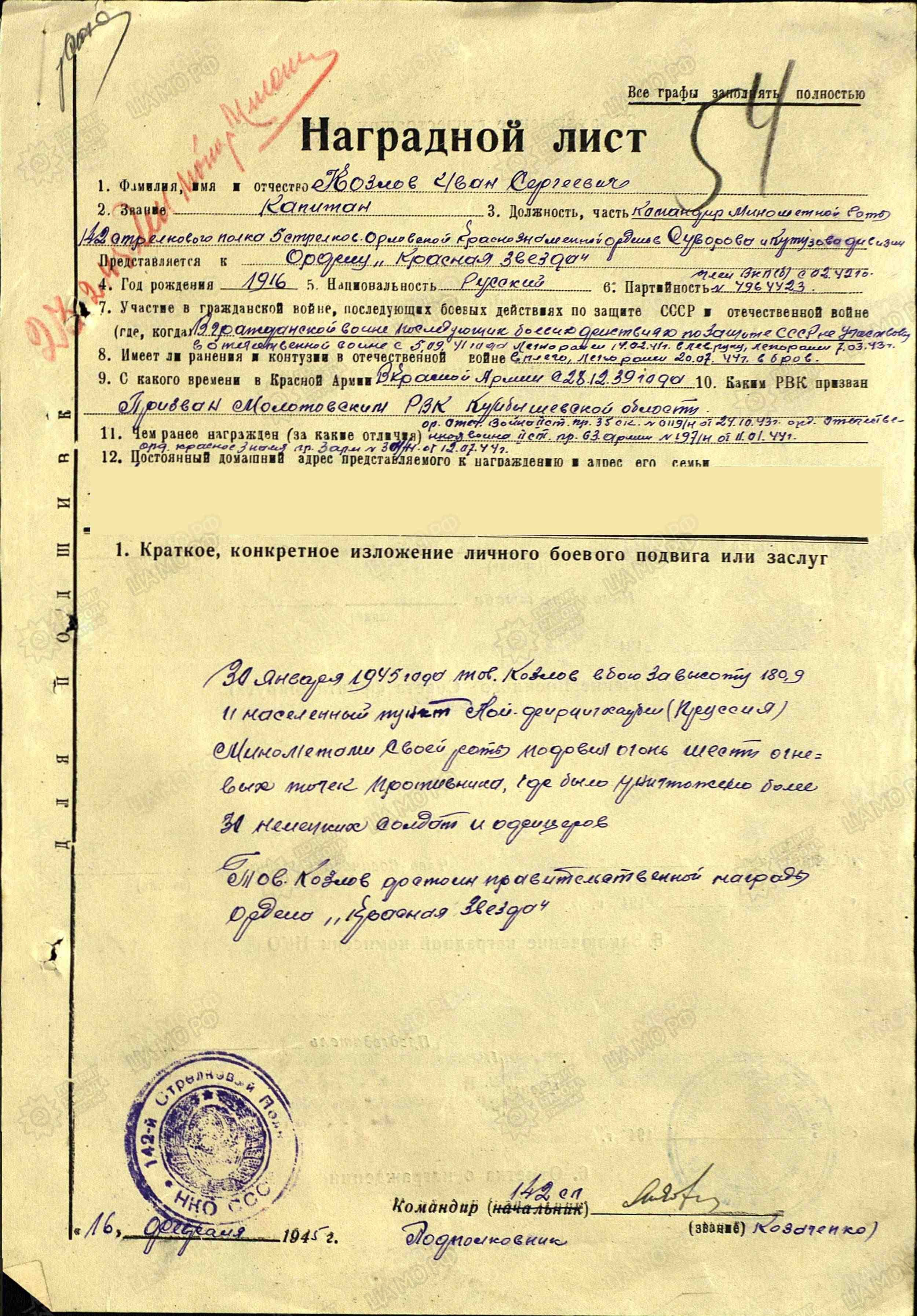 Родился в 1916 г. в д. Редькино Луковниковского района Калининской (ныне Твер-ской) области в крестьянской многодетной (7 детей) семье. Жили трудно. В 1930 г. семья Козловых переехала в с. Жигули Сосново-Солонецкого (ныне Ставропольского) района Куйбышевской области. 28 декабря 1939 г. Иван Сергеевич был призван Сосново-Солонецким РВК в ряды Красной армии. Там застала его Великая Отечественная война. В боевых действиях участвовал с 5 сентября 1941 г. в стрелковых частях в звании красноармеец. В одном из первых боев в сентябре был ранен, признан пропавшим без вести. После лечения в госпитале, предположительно, был направлен на курсы командиров, так как 7 февраля 1943 г. Ивану Сергеевичу присвоено звание младшего лейтенанта. Зачислен командиром 82-мм минометного взвода 142-го стрелкового полка 5-й стрелковой дивизии 35-го стрелкового корпуса. 18 февраля 1943 г. получил легкое пулевое ранение в руку, 7 марта 1943 г. – легкое ранение в плечо. Участвовал в боях по освобождению г. Орла. К осени 1943 г. Ивану Сергеевичу присвоено звание лейтенанта. Воевал на Белорусском фронте. «Во время освобождения д. Чубарово, Копунчуковка он рассеял, частью уничтожил до роты пехоты противника и отразил 2 контратаки, тем самым дал возможность нашей пехоте успешно вести наступательные действия за овладение деревней Копунчуковка», - из наградного листа на представление к ордену Отечественной войны II степени (9.10.1943 г.). «Тов. Козлов, командуя минометным взводом, за время наступления с 13 июля по 14 октября 1943 г. показал себя храбрым и знающим технику ведения огня в бою. 14 октября 1943 г. крутыми контратаками противник пытался восстановить утраченные позиции. Тов. Козлов своим метким минометным огнем разрушил ДЗОТ, подавил огонь двух батарей противника и уничтожил до роты немецкой пехоты, чем способствовал полному отражению контратаки с большими потерями для противника», - из наградного листа на представление к ордену Отечественной войны II степени (22.10.1943 г.). За умелое командование, мужество и стойкость в начале 1944 г. Ивана Сергеевича назначают командиром минометной роты 82-мм минометов. Воевал на 2-м Белорусском фронте. Форсировал реку Днепр. «В боях по форсированию реки Друть и овладению населенными пунктами Лозки и Коптур, только за 24 июня 1944 г. под командованием Козлова И.С. минометная рота отразила 11 яростных контратак немцев. Огнем минометов он истребил до 40 солдат и офицеров, подавил огонь 6 пулеметных точек и рассеял до 2 взводов автоматчиков, сброшенных с танков противника», - из наградного листа на представление к ордену Красного Знамени. Присвоено очередное звание старшего лейтенанта. В бою 20 июля 1944 г. Иван Сергеевич был вновь ранен. В январе 1945 г. уже в звание капитана Козлов И.С. участвовал в боях на территории Восточной Пруссии по овладение крепостью Кенигсберг, в прорыве обороны противника у г. Танненберг, Алиендорф. «30 января 1945 г. в бою за высоту 180,9 и населенный пункт Пруссии минометами своей роты Козлов подавил огонь 6 точек противника, где было уничтожено более 30 немецких солдат и офицеров», - из наградного листа на представление к ордену Красной Звезды. Победу Иван Сергеевич встретил в Берлине. Умер 19 декабря 1957 г. Награды: орден Красного Знамени, два ордена Отечественной войны II степени, орден Красной Звезды, медаль «За победу над Германией в Великой Отечественной войне 1941-1
