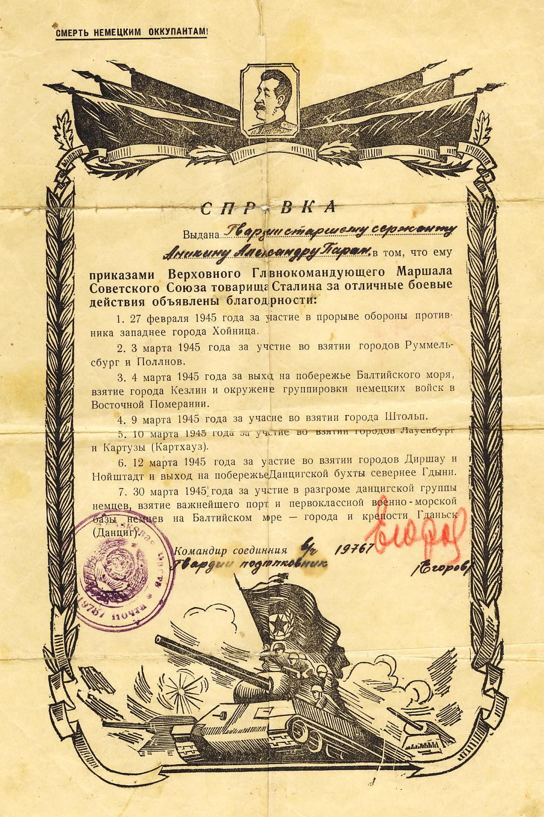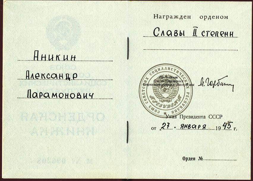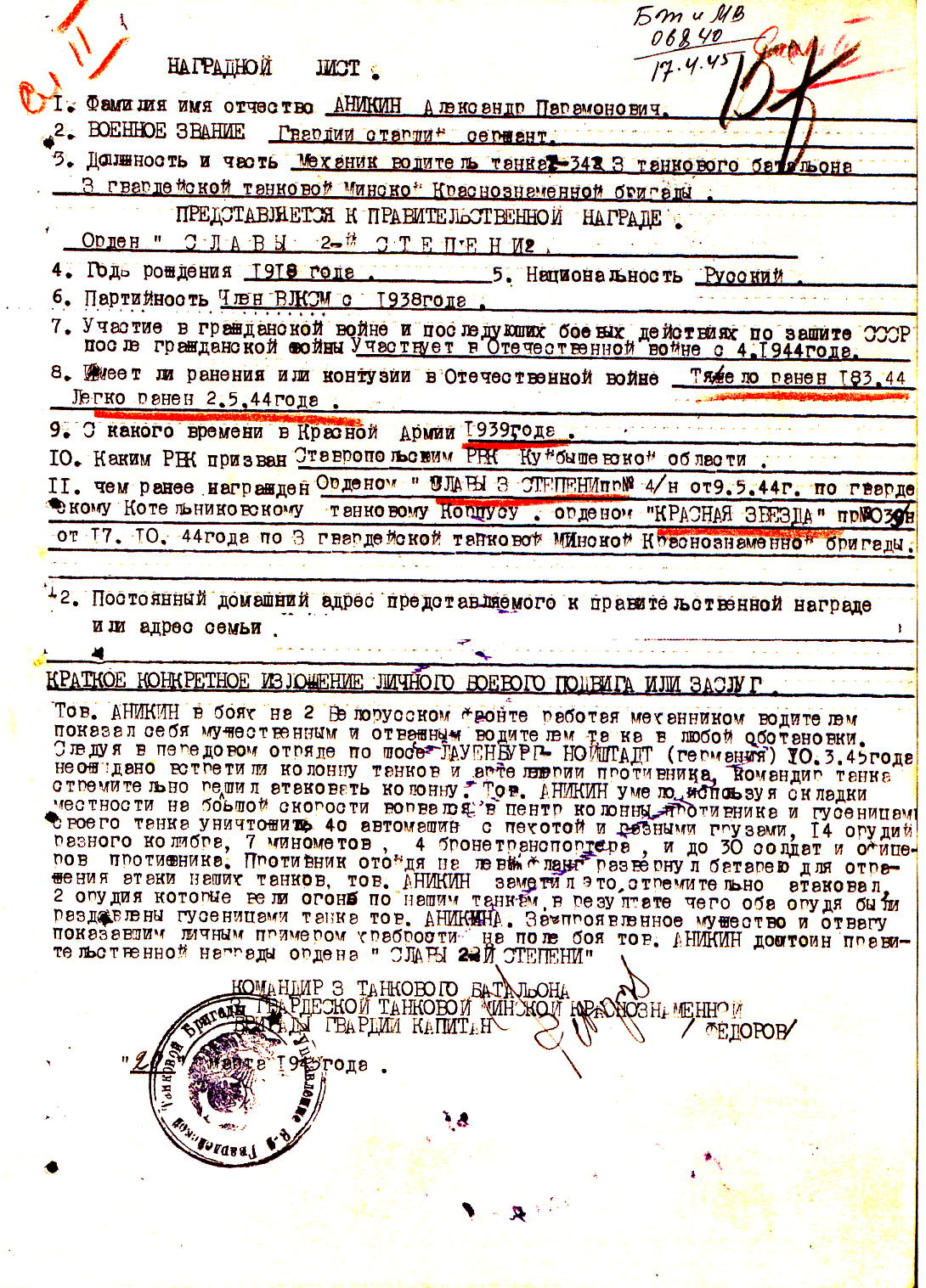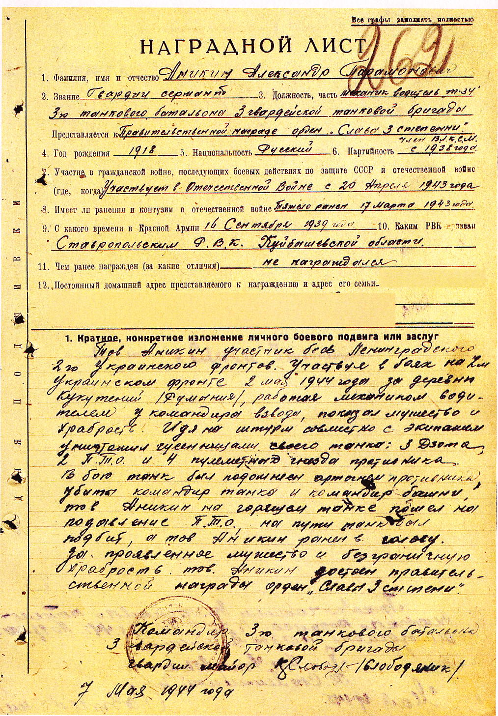 Родился в с. Ягодное Ставропольского района Куйбышевской области в 1918 г. Призван Ставропольским РВК Куйбышевской области на срочную службу в ряды РККА 16 сентября 1939 г. В Великой Отечественной войне – с июня 1941 г. Воевал в составе 3-й гвардейской танковой Минской Краснознаменной им. Суворова бригады механиком-водителем Т-34 в 3-м танковом батальоне в звании гвардии сержант. Он участвовал в боях на Ленинградском, 2-м Украинском, Прибалтийском, 2-м Белорусском фронтах. 17 марта 1943 г. был тяжело ранен, лечился в госпитале в г. Чкалове (Оренбурге). 2 мая 1944 г. – вновь ранен в голову. Летом 1944 г. ему было присвоено звание старший сержант. Александр Парамонович в боях проявлял невероятные мужество и отвагу, не раз, идя в авангарде, врывался на вражеские позиции, во встречные колонны противника. Танк его неоднократно горел, а сам боец, не обращая внимания на ожоги, вел свой Т-34 на врага, безжалостно уничтожая гусеницами ДЗОТ’ы, артиллерийские орудия, военную технику, солдат и офицеров противника. Аникин А.П., кроме четырех орденов, отмечен 7-ю благодарностями от Верховного главнокомандую-щего за отличные боевые действия на территории Германии и Польши. Погиб 29 апреля 1945 г. Награды: орден Славы II степени, орден Славы III степени, орден Красной Звезды, орден Отечественной войны II степени (посмертно).