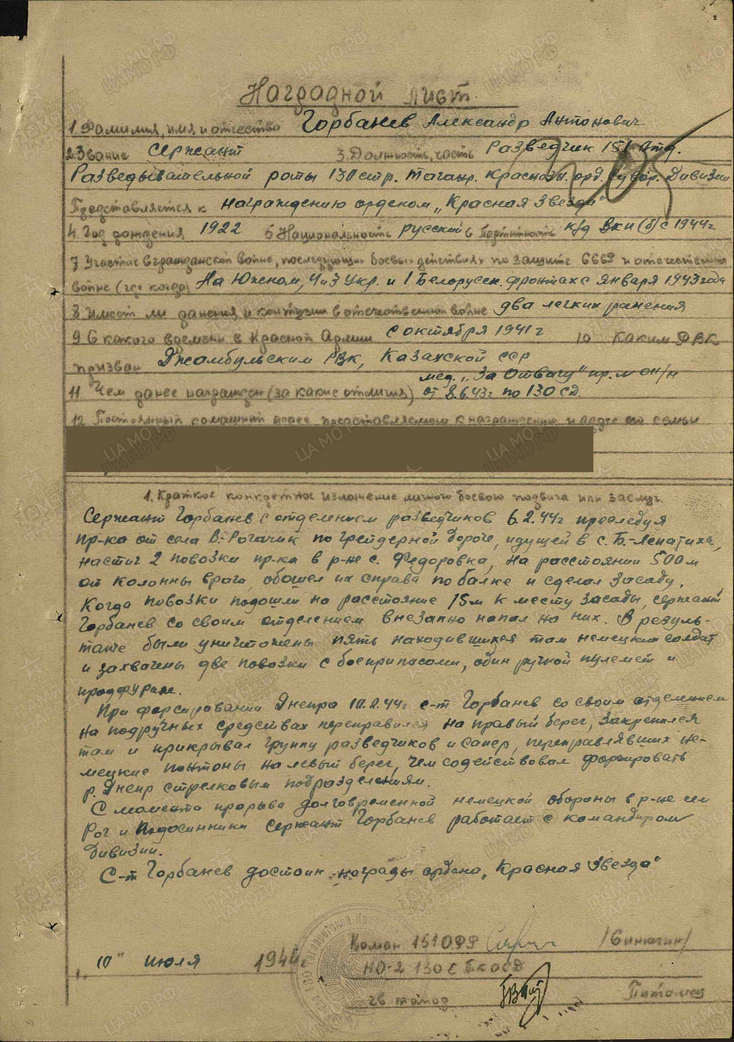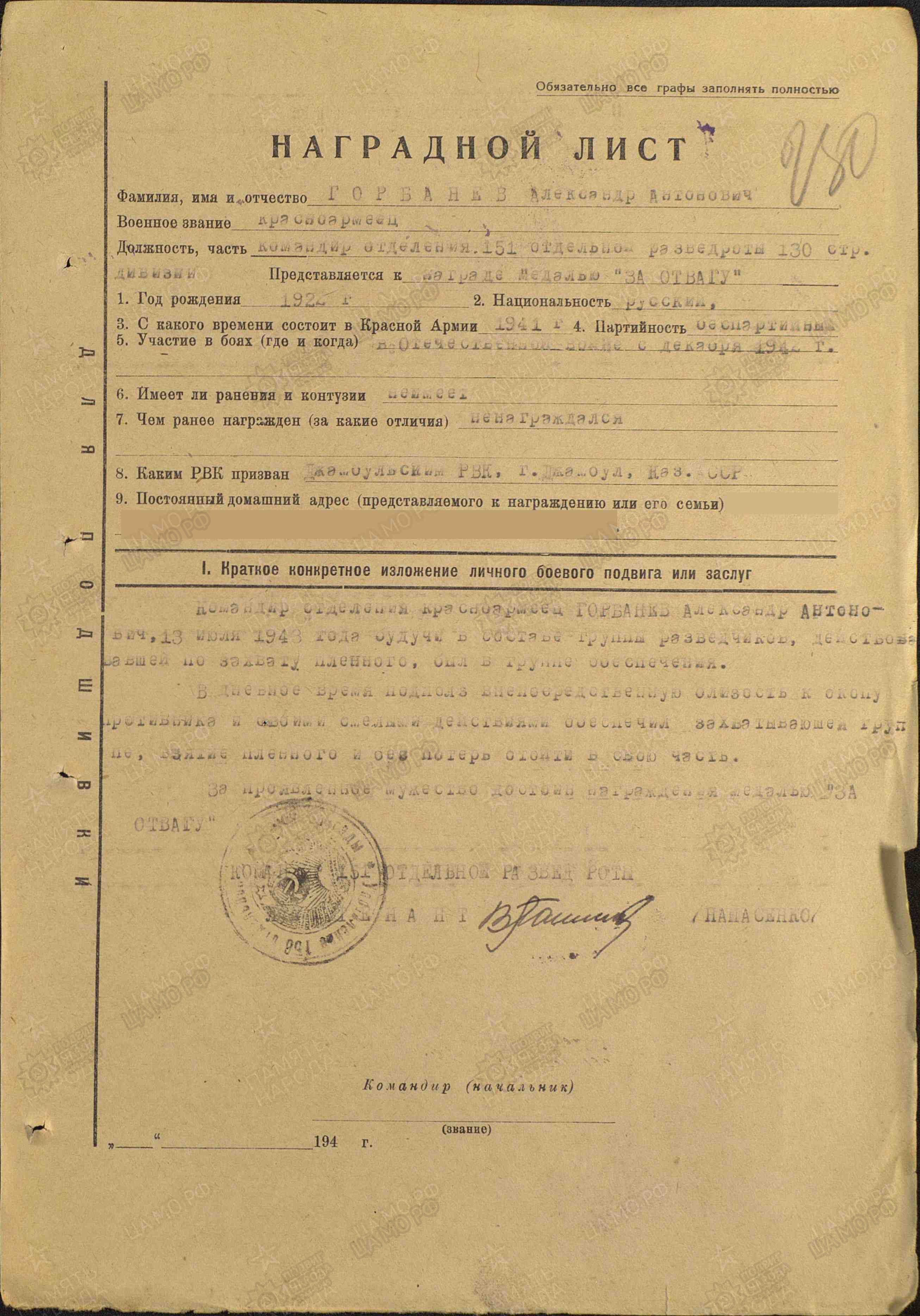 Родился 20 мая 1925 г. в Оренбургской области. Призван на фронт в 1943 г. Воевал в стрелковых частях, с боями прошел Австрию, Венгрию. Был ранен, лечился в госпитале в г. Свердловск, где проходил лечение и его брат, Горбанев Василий Антонович. Петр Антонович демобилизовался в 1946 г. Вернулся на родину, выучился на машиниста паровоза, а затем и тепловоза. Умер от тяжелой болезни в 1983 г., похоронен в г. Джамбул Казахской ССР. Награды: орден Отечественной войны II степени, медали «За отвагу», «За взятие Будапешта», «За победу над Германией в Великой Отечественной войне 1941-1945 гг.». Информация сайта podvignaroda.ru: Участник Великой Отечественной войны с 1943 г. В боях показал себя смелым и отважным воином. Дважды ранен, на его счету 8 убитых немецких солдат и офицеров. Будучи вторым номером ПТР, неоднократно отбивал танковые атаки противника. Наградить медалью «За отвагу» (наградной лист от 15.11.1946 г.). Другой брат – Горбанев Александр Антонович, родился в 1922 г. Служил в звании сержант, в должности командир отделения 151-й отдельной разведывательной роты 130-й стрелковой дивизии. Погиб 25 апреля 1945 г. Похоронен в г. Цоссен, Германия. Награды: орден Красной Звезды, медаль «За отвагу». Информация сайта podvignaroda.ru: Командир отделения красноармеец Горбанев Александр Антонович 13 июля 1943 г., будучи в составе группы разведчиков, действовавшей по захвату пленного, был в группе обеспечения. В дневное время подполз непосредственную близость к окопу противника и своими смелыми действиями обеспечил захватывающей группе взятие пленного и отход в свою часть без потерь. За проявленное мужество достоин награждения медалью «За отвагу» (наградной лист от 24.07.1943 г.). Сержант Горбанев с отделением разведчиков 6 февраля 1944 г., преследуя противника от с. В.-Рогачик по грейдерной дороге, идущей в с. Б.-Ленатиха, настиг 2 повозки противника в районе с. Федоровка. На расстоянии 500 м от колонны врага обошел их справа по балке и сделал засаду. Когда повозки подошли на расстояние 15 м к месту засады, сержант Горбанев со своим отделением внезапно напал на них. В результате были уничтожены пять находившихся там немецких солдат и захвачены две повозки с боеприпасами, один ручной пулемет и продфураж. При форсировании Днепра 10 февраля 1944 г. сержант Горбанев со своим отделением на подручных средствах переправился на правый берег, закрепился там и прикрывал группу разведчиков и саперов, переправлявших немецкие понтоны на левый берег, чем содействовал форсированию р. Днепр стрелковыми подразделениями. С момента прорыва долговременной немецкой обороны в районе сел Рог и Подосинники сержант Горбанев работает с команди-ром дивизии. Достоин награды – ордена Красной Звезды (наградной лист от 10.07.1944 г.). Старший брат - Горбанев Николай Антонович служил в Иране, возможно в частях, призванных охранять Тегеранскую конференцию, во время ее проведения, по предотвращению покушения на лидеров трех стран: СССР, Великобритании и США.