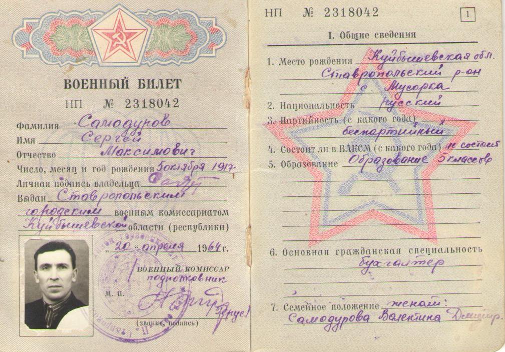 Родился 5 октября 1917 г. в с. Мусорка Ново-Буянского (ныне Ставропольского) района Куйбышевской области. Отец Сергея Максимовича до революции работал плотником, а мать - домработницей у священника храма Крылова. Отец – участник Гражданской войны, служил в звании красноармеец. После установления Советской власти отец и мать работали в колхозе. Сергей закончил 7 классов в Узюковской школе. С 14 лет пошёл работать в сельский совет – за красивый почерк взяли его писарем. Затем окончил высшие московские курсы бухгалтеров, Сергей был очень грамотным человеком. В 1938 г. Сергей Максимович призван на срочную службу в ряды РККА. Служил в железнодорожном полку стрелочником-сигналистом. 15 декабря 1940 г. уволен в запас. Началась война. Снова мобилизация. В августе 1941 г. Сергей Максимович призван Ленинским РВК г. Куйбышев и зачислен в 12-й инженерно-запасной полк сапером в звании красноармеец. С марта 1942 г. он воюет в 604-м отдельном саперном батальоне, а в январе 1943 г. Сергей Максимович переведен в 386-ю отдельную разве-дывательную роту разведчиком. В марте 1943 г. боец получает тяжелое ранение, лечится в эвакогоспитале №2673, в июле переводится в 202-й запасной стрелковый полк стрелком в батальон для выздоравливающих. После лечения в августе 1943 г. Сергей Максимович воюет в 87-м гвардейском стрелковом полку стрелком противотанкового ружья и 30 августа снова получает ранение. С октября 1943 г. он служит огнеметчиком (орудийным номером) в 185-й отдельной огнеметной роте 36-й отдельной стрелковой бригады. В марте 1944 г. его представили к награде медалью «За боевые заслуги»: «Во время наступления на деревню Зазыбы Самодуров скрытно по кустарникам подполз к немецкой траншее. Перед собой на расстоянии автоматного выстрела он заметил двух немецких солдат с пулеметами, ведущих огонь по нашей пехоте. Очередью из автомата Самодуров уничтожил вражеских пулеметчиков. Исправный трофейный пулемет развернул в сторону противника. Ружейно-пулеметный огонь немцев стал реже, что дало возможность пехоте выполнить поставленную задачу. С поля боя Самодуров вынес двух наших раненых огнеметчиков с их оружием». В августе 1944 г. Сергей Максимович направлен во 2-ю батарею 4-го дивизиона 24-й гвардейской ми-нометной бригады («Катюши») оружейным номером, затем водителем по подвозу горючего, после на 2-3 месяца его назначают писарем технической части управления бригады. Победу встретил в Кенигсберге. Много военных дорог прошел боец, воевал на 3-м Белорусском, Западном фронтах. Но война для Сергея Максимовича на этом не закончилась. Бригаду перебрасывают на Забайкальский фронт на войну с Японией, и Сергей Максимович – снова за баранкой автомашины по подвозу горюче-смазочных материалов. В августе 1945 г. командование представило его к награждению орденом Красной Звезды: «Во время совершения марша от Читы до границы Манчжурии и при преследовании нашими войсками отступающего противника в трудных условиях горно-болотистой местности Самодуров показал образцы самоотверженной работы. На всем протяжении 2-тысячно-километрового марша его машина была исправна, не требовала оказания помощи ремонтников. Горючее всегда доставлялось своевременно», что было очень важно для минометных установок («Катюш»). Демобилизовался Сергей Максимович в июле 1946 г., вернулся на родину, в 1948 г. женился. Трудился в МТС, бу