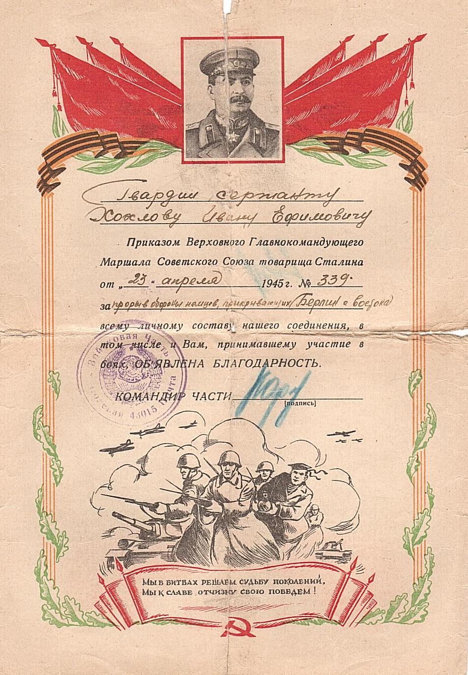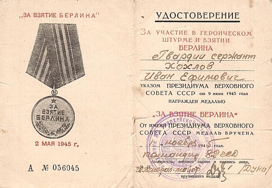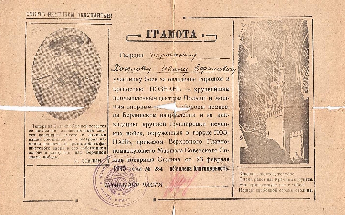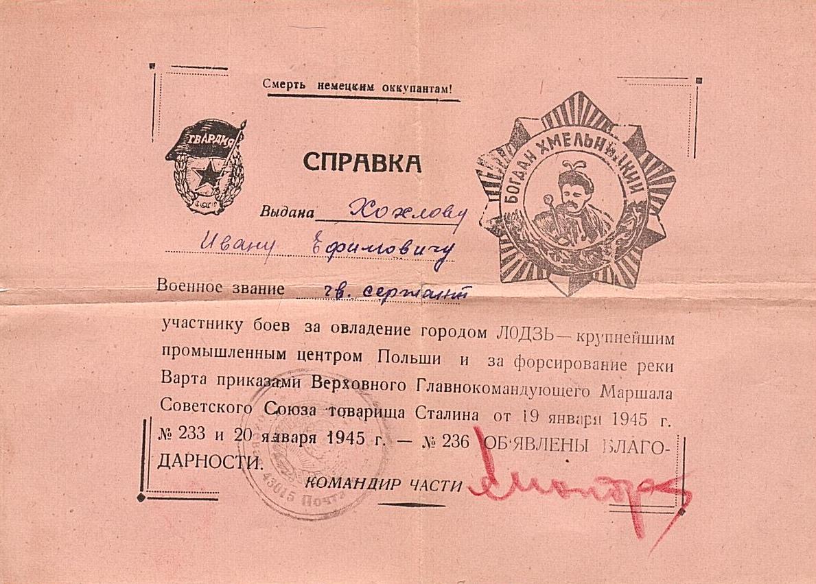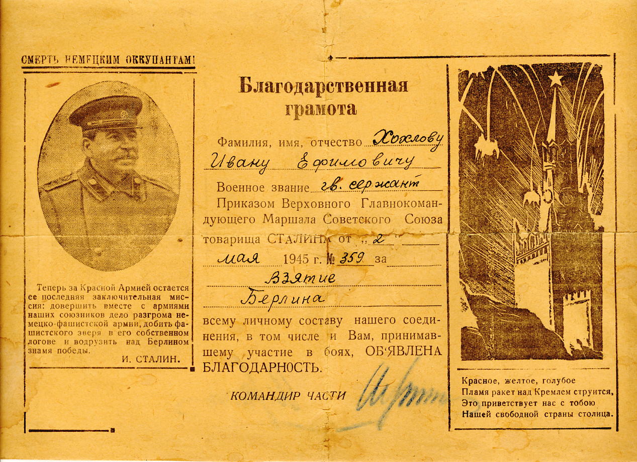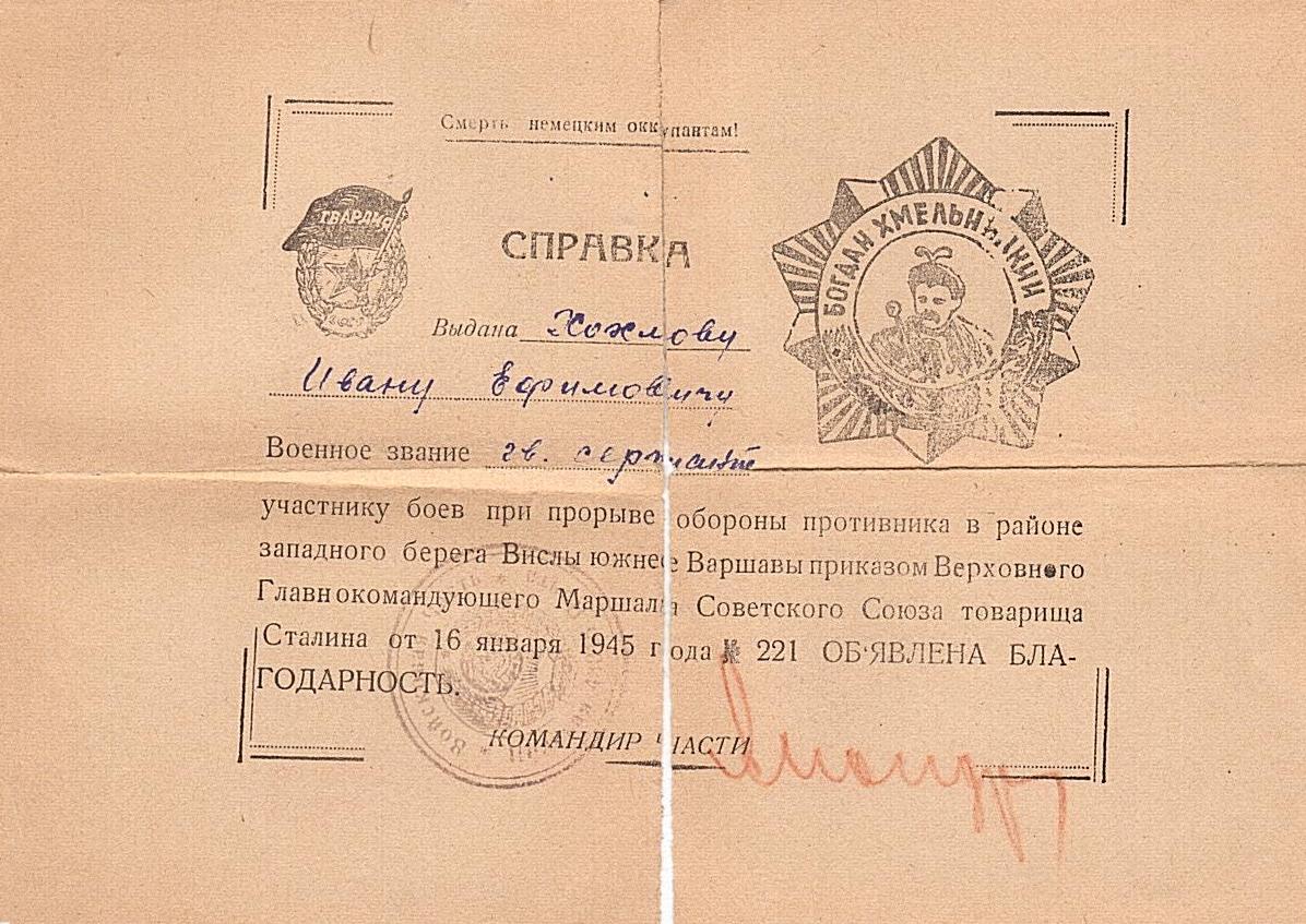 Родился 19 декабря 1921 г. в с. Нижнее Санчелеево Ставропольского района Куйбышевской области. Призван по мобилизации в июле 1942 г. Ставропольским РВК Куйбышевской области и направлен на курсы младших командиров. С ноября 1942 г. в звании ефрейтор был назначен командиром отделения 83-й отдельной гвардейской разведывательной роты 82-й гвардейской Запорожской ордена Богдана Хмельницкого стрелковой дивизии 29-го гвардейского стрелкового Лодзинского корпуса. Участвовал в боях под Сталинградом, в военных операциях по освобождению Украины, в Висло-Одерской операции, штурме Берлина. Воевал на Юго-Западном, 3-м Украинском, 1-м Белорусском фронтах. В августе 1942 г. в боях за Дон (в составе учебного батальона) был ранен. Чудеса героизма и мужества совершал уже гвардии сержант Хохлов, выполняя задания командования: участвовал в захвате эшелона немцев с техникой и продовольствием, преследовал отступающие группировки немцев, уничтожая противника и захватывая в плен, со своим отделением принимал участие в отражении контратак гитлеровцев, добывал оперативные документы немцев, во время разведывательных операций, соприкасаясь с противником, смело и напористо вступал в бой, заканчивающийся победой разведчиков. В декабре 1944 года, обеспечивая действия группы захвата, отделение Хохлова огнем автоматов и гранат уничтожило пулеметную точку немцев, сам командир отделения оставался на поле боя под сильным минометным огнем, прикрывая отход группы захвата. 20 января 1945 г. группа разведки Хохлова в составе конного взвода, выполняя задание командования продвинуться до предместья города Рава-Мазовецкая (Польша), натолкнулась на гитлеровцев и вступила с ними в бой. Сержант Хохлов со своими разведчиками (5 человек) спешились, обошли немцев и ударили по ним с тыла. Удар был настолько внезапный, что группа противника до 100 человек побросала оружие и разбежалась. Хохлов лично истребил 6 немецких солдат, 2-х захватил в плен, в том числе, капитана. В мае 1945 г. группа разведчиков натолкнулась на беспрерывный ружейно-пулеметный огонь немцев из 4-х этажного дома. Иван Ефимович выстрелом из фаустпатрона подавил огневую точку противника, первым бросился в дом и в рукопашном бою уничтожил 11 немцев, 3-х взял в плен. Отважный разведчик был награжден благодарностями от Верховного главнокомандующего за взятие г. Лодзь (Польша) и форсирование реки Варта, за овладение городом Познань (Польша) и ликвидацией в нем крупной группировки противника, за уча-стие в боях при прорыве обороны противника в районе западного берега Вислы, за прорыв обороны немцев, прикрывающих Берлин с востока, за взятие Берлина. Умер 2 апреля 2002 г.