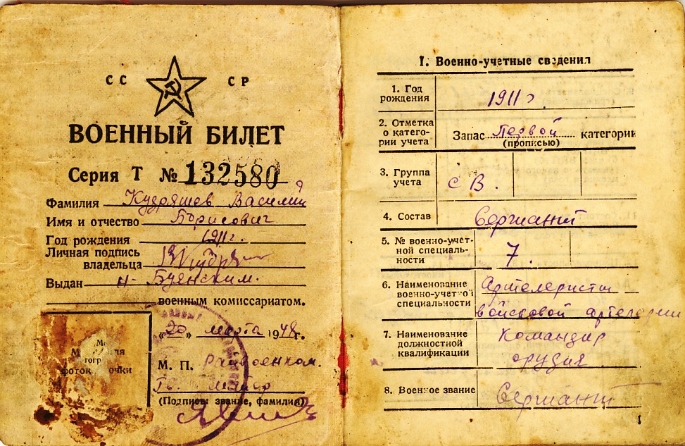 Родился 28 декабря 1911 г. в с. Новая Бинарадка Ново-Буянского (ныне Ставропольского) района Куйбышевской области. В 1923 г. окончил 2 класса школы. В 1935 г. женился, в браке родились 2 детей (сын Борис и дочь Нина). В 1939 г. его призвали на войну с Финляндией. Вернулся домой через год и два месяца, а 27 августа 1941 г. – вновь мобилизация на войну с Германией. Зачислен в 52-й запасной артиллерийский полк, а 25 октября 1941 г. перераспределен командиром орудия 2-го дивизиона 4-й батареи 332-го артиллерийского полка 178-й стрелковой Краснознаменной Кулагинской дивизии. Василий Борисович воевал на Западном, затем на Калининском фронтах. В декабре 1942 г. старший сержант Кудряшов получил свою первую награду – медаль «За отвагу»: «26.11.1942 г., стреляя с открытой огневой позиции прямой наводкой по д. Самойлово своим орудием, разбил 2 ДЗОТа, 28.11. разбил 1 ДЗОТ, 3.12.1942 г. в д. Усово разбил 1 ДЗОТ и наблюдательный пункт противника, 5.12.1942 г. под сильным артиллерийским обстрелом противника разрушил ДЗОТ и уничтожил 8 гитлеровцев». Василий Борисович участвовал в боях за Москву, под Смоленском. В сентябре 1943 г. дивизия переброшена на 2-й Прибалтийский фронт в г. Великие Луки, участвовала в разгроме групп фашистских армий – «Север» и «Центр». В октябре 1943 г. артиллерист Кудряшов представлен к ордену Красной Звезды. С апреля по июнь 1944 г. Василий Борисович со своим полком вел бои под Ленинградом, участвовал в прорыве блокады города. С августа по сентябрь 1944 г. - оборона западной окраины Выборга. До 25 января 1945 г. дивизия пребывала на советско-финской границе, а 3 мая 1945 г. переброшена под Митаву (Латвия) для ликвидации Курляндской (Прибалтийской) группировки немцев в Восточной Пруссии. Ожесточенные бои не стихали в том районе с 10 октября 1944 г. Но после капитуляции Германии 9 мая 1945 г. большинство немецких солдат сдались в плен, и лишь небольшие группы продолжили оказывать сопротивление вплоть до 15 мая. Здесь, под Митавой, Василий Борисович встретил долгожданную Победу. Демобилизовался в должности старшина в ноябре 1945 г., вернулся в родное с. Новая Бинарадка, работал в Новобуянском лесхозе, чтобы заработать лес для строительства собственного дома. Семья росла (шестеро детей), Василий Борисович построив дом, три раза его достраивал – расширялся. До пенсии трудился в колхозе «Рассвет» разнорабочим, пастухом, скотником, конюхом, плотником. Умер в 1986 г.