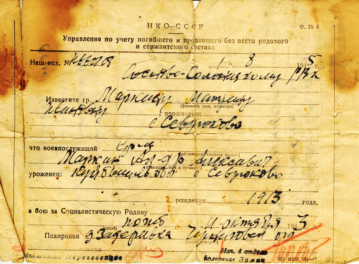 Маркин А.А. Письмо семье, август 1941 г. (2 стр.). Текст письма (окончание): Мне очень хочется узнать, что дома делается и очень охота узнать об Оле, жив или нет. Я вам писал, если будут у вас деньги, то постарайтесь купить, что вам нужно. А то не будет возможности купить. С получением моего письма постарайтесь поскорее написать мне про все, что у вас делается, и пропишите, много ли взяли народа после меня. Пока у меня все. Передавайте от меня всем поклон Гармистуловой Матрене, Клавдии и их Степану, Степаниде. Очень прошу написать поскорее мне письмо. Пока до свидания. Август 1941 года. Подпись.